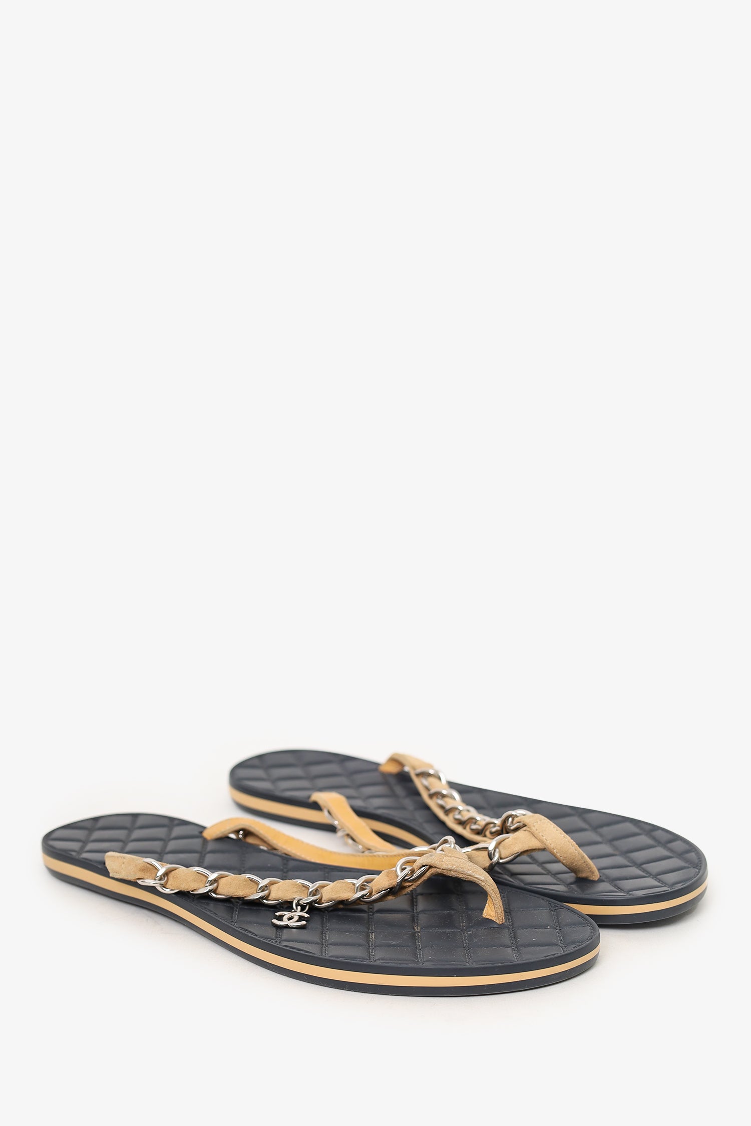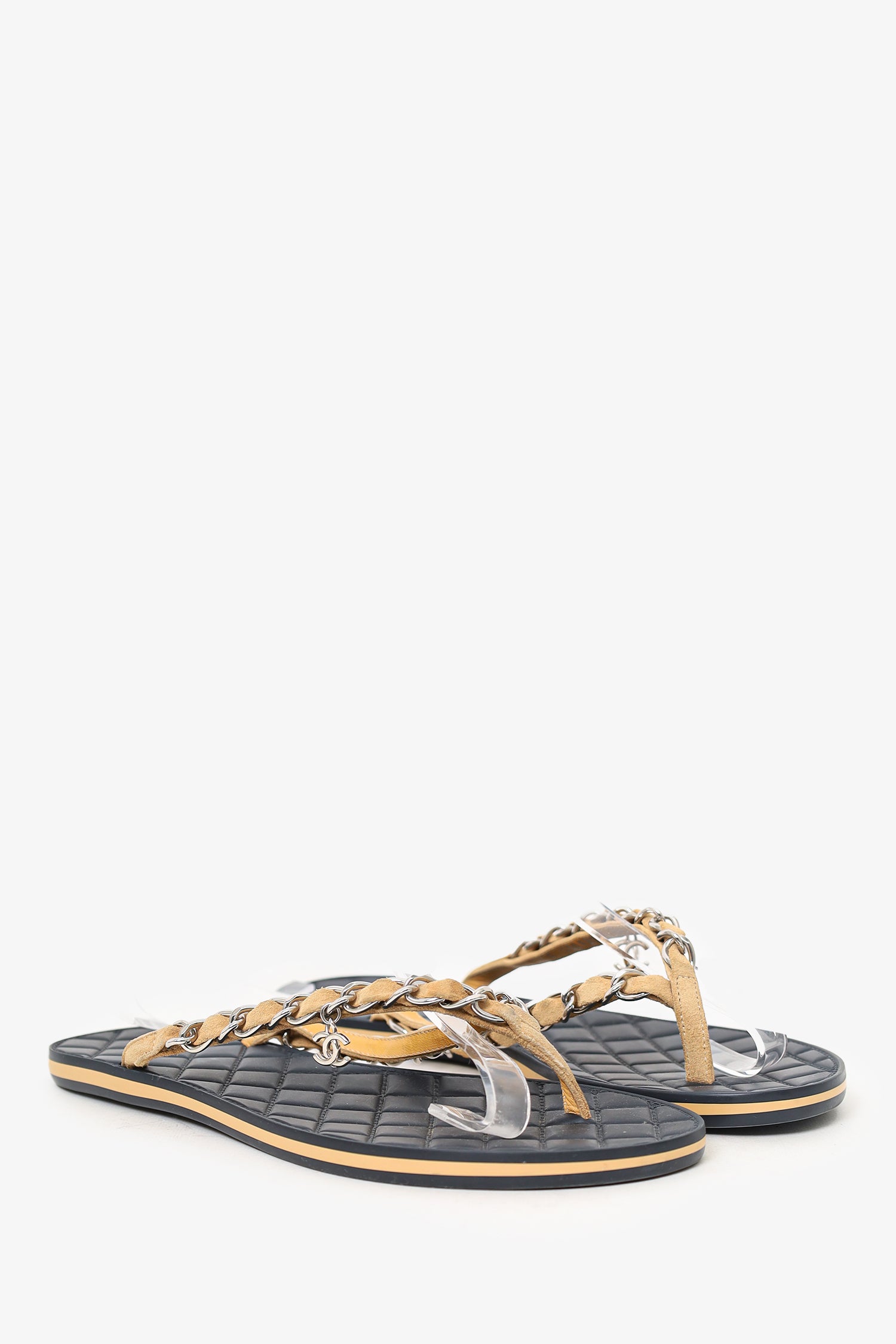 Refresh availabilityPre-loved Chanel™ Beige Chain Detail Flip Flops. Slip-on. Gold-tone hardware. Tonal stitching.