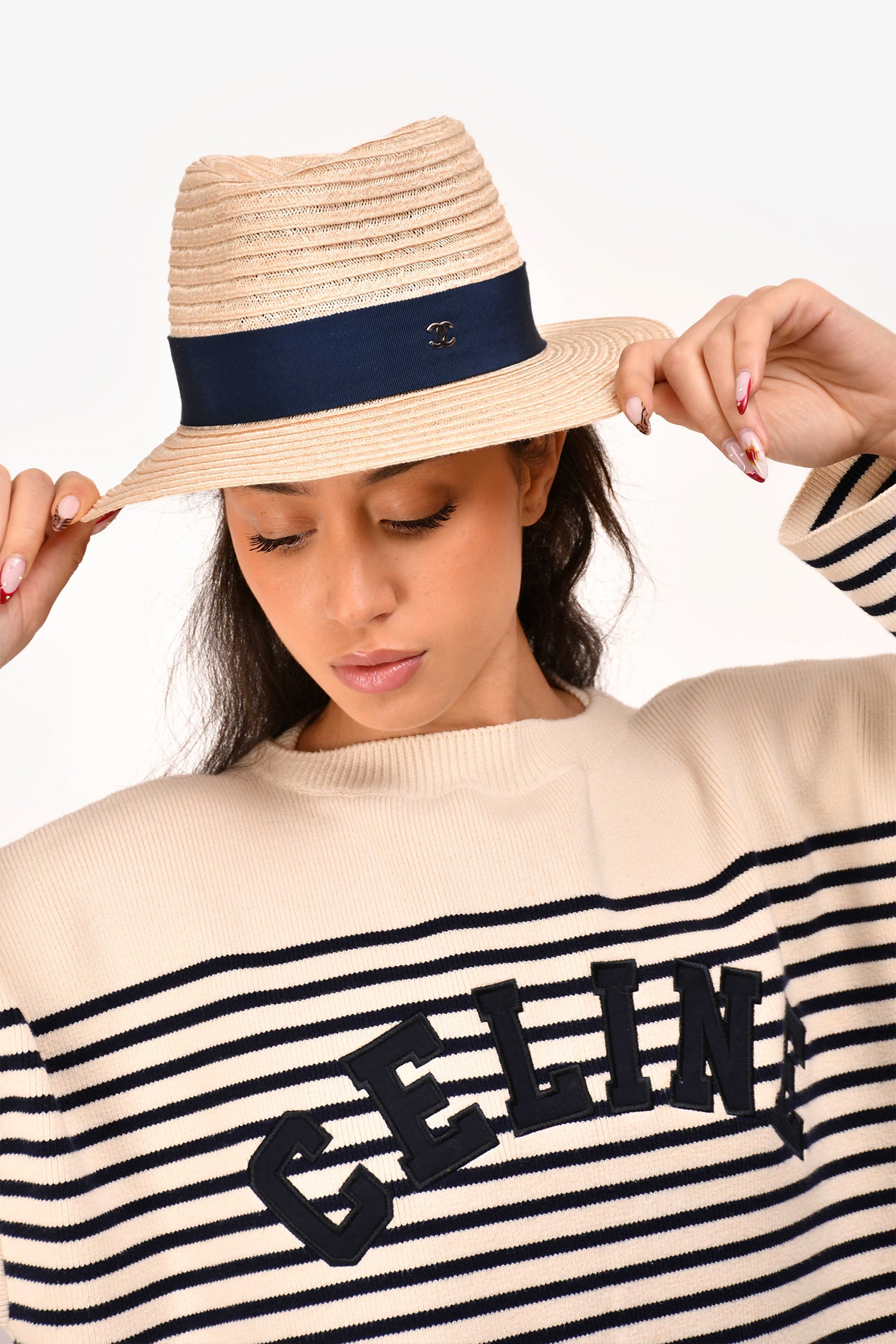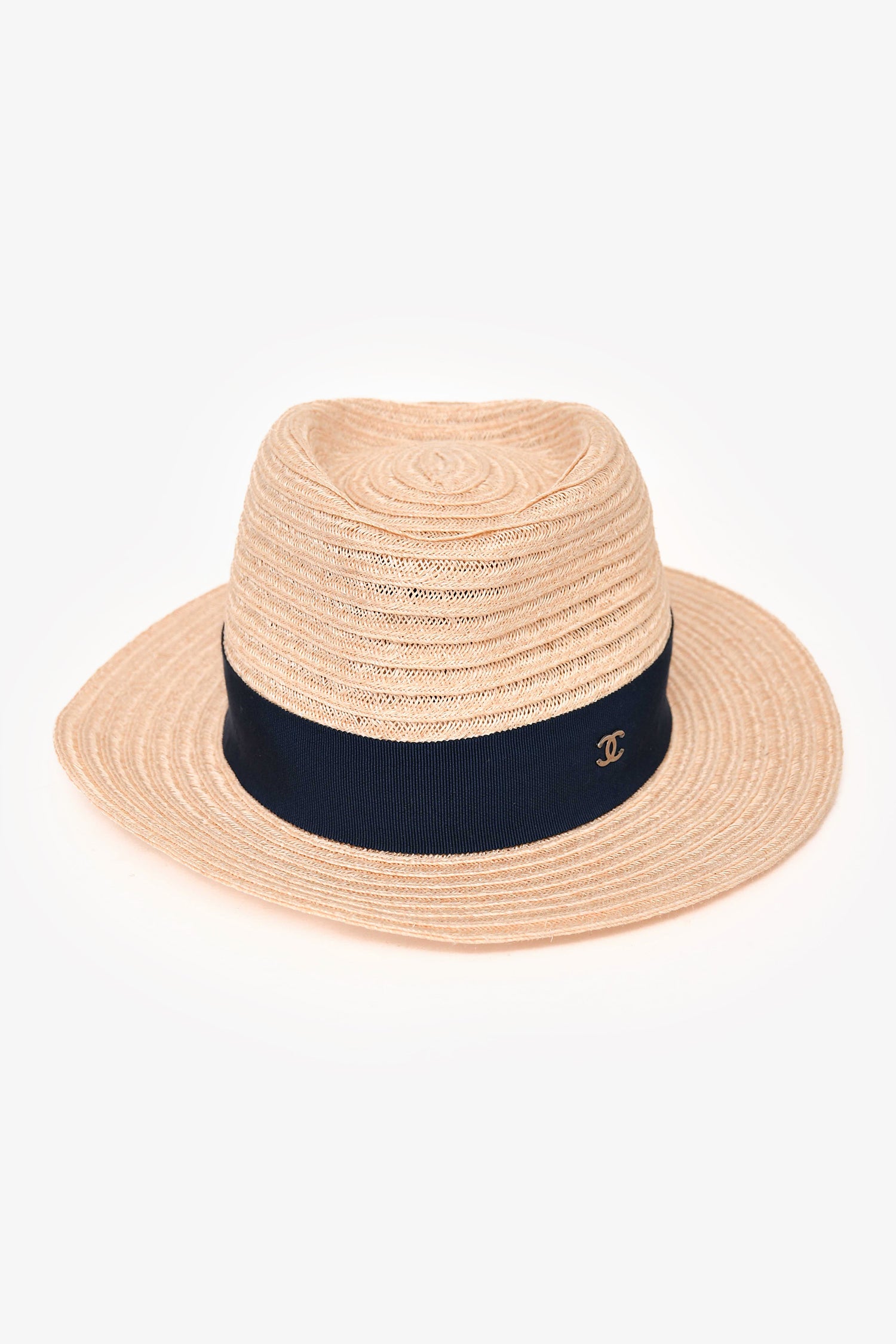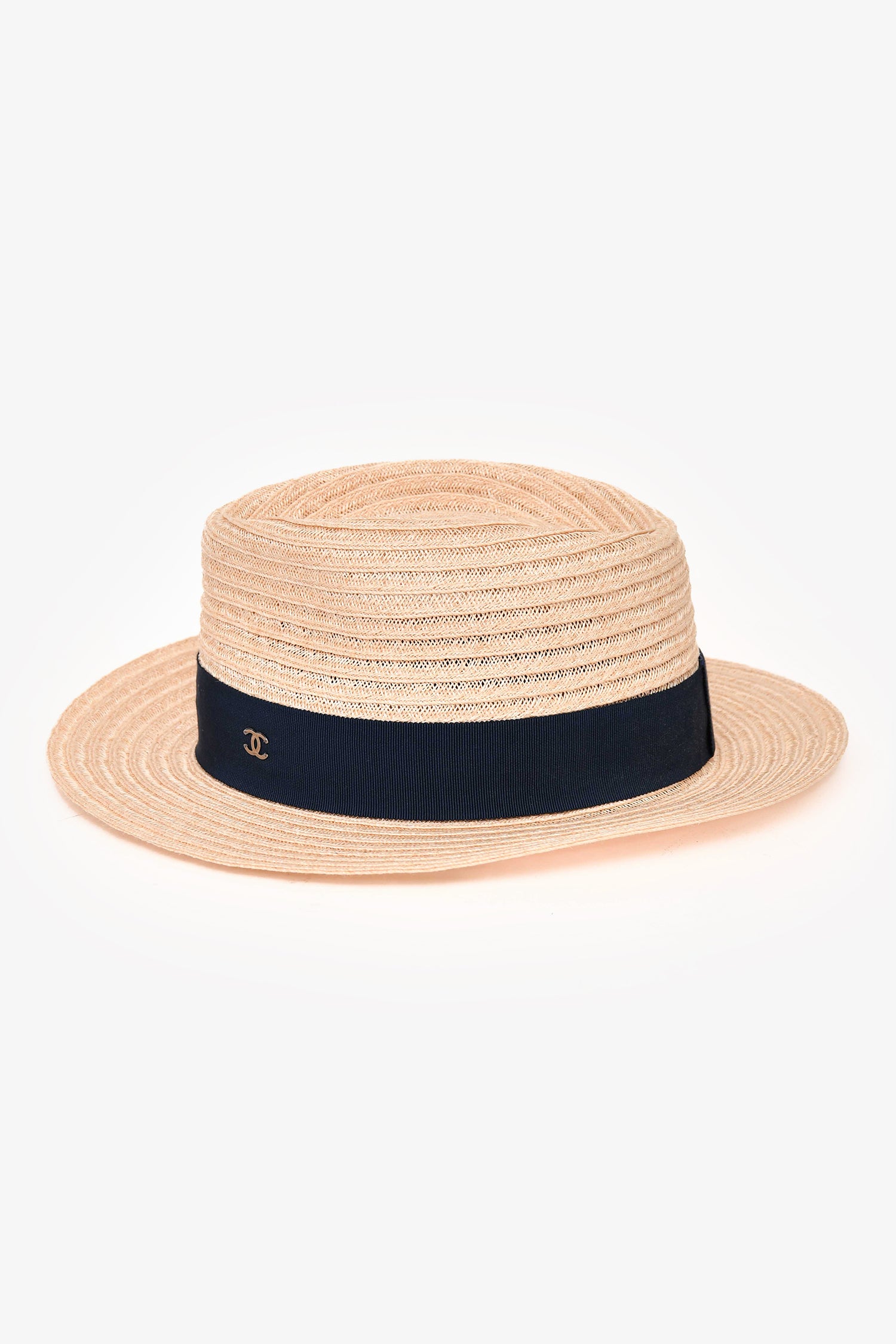 Refresh availabilityPre-Loved Chanel™ Beige Raffia Navy Band Sun Hat. Silver-toned hardware. Tonal stitching.