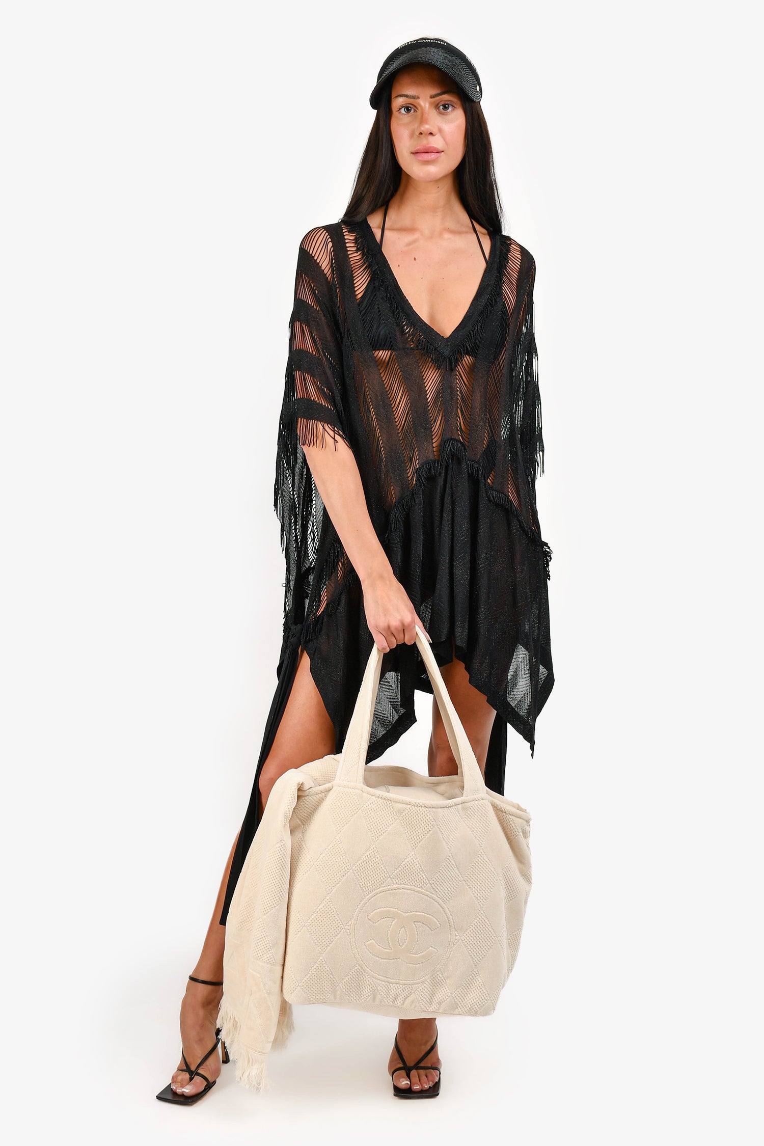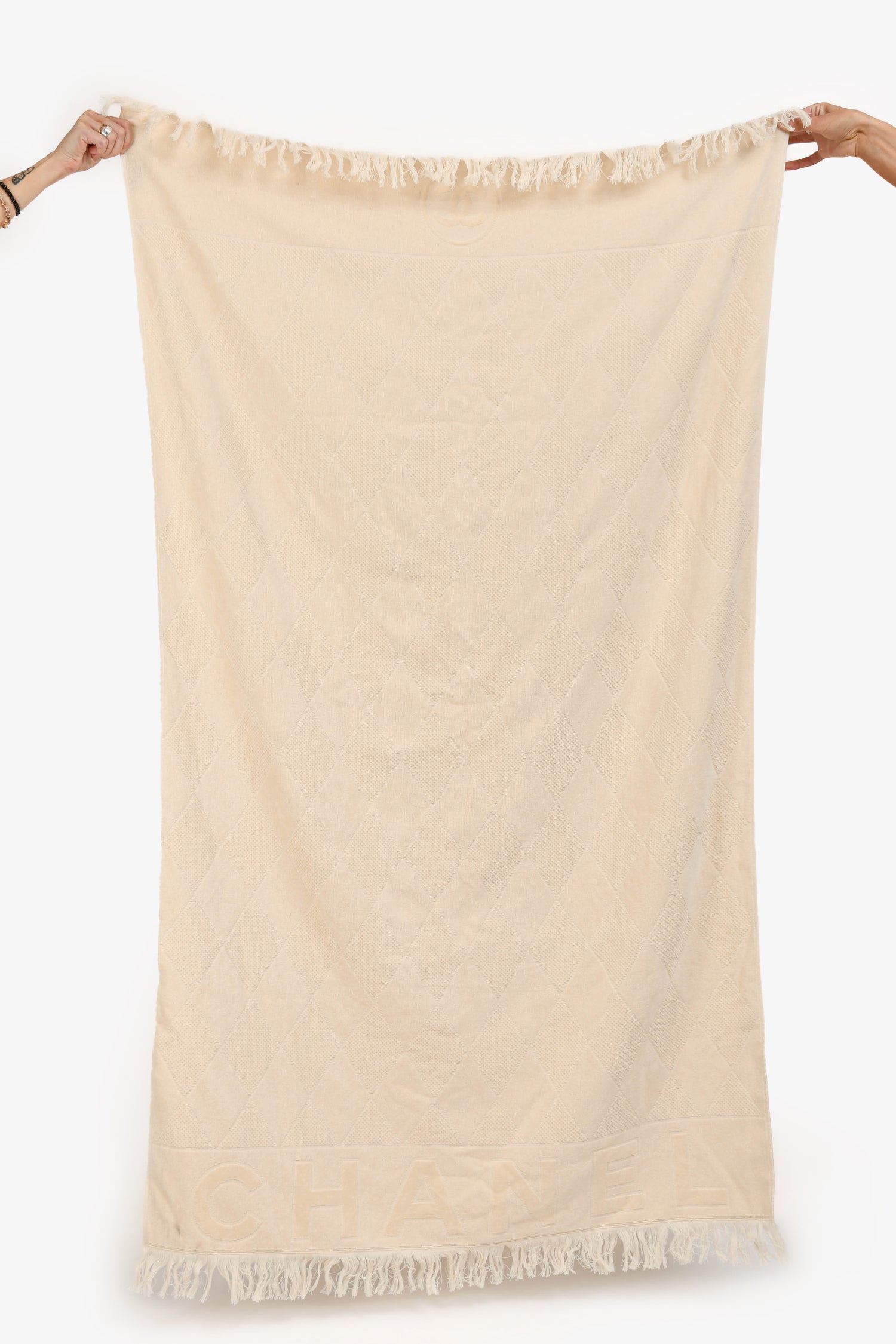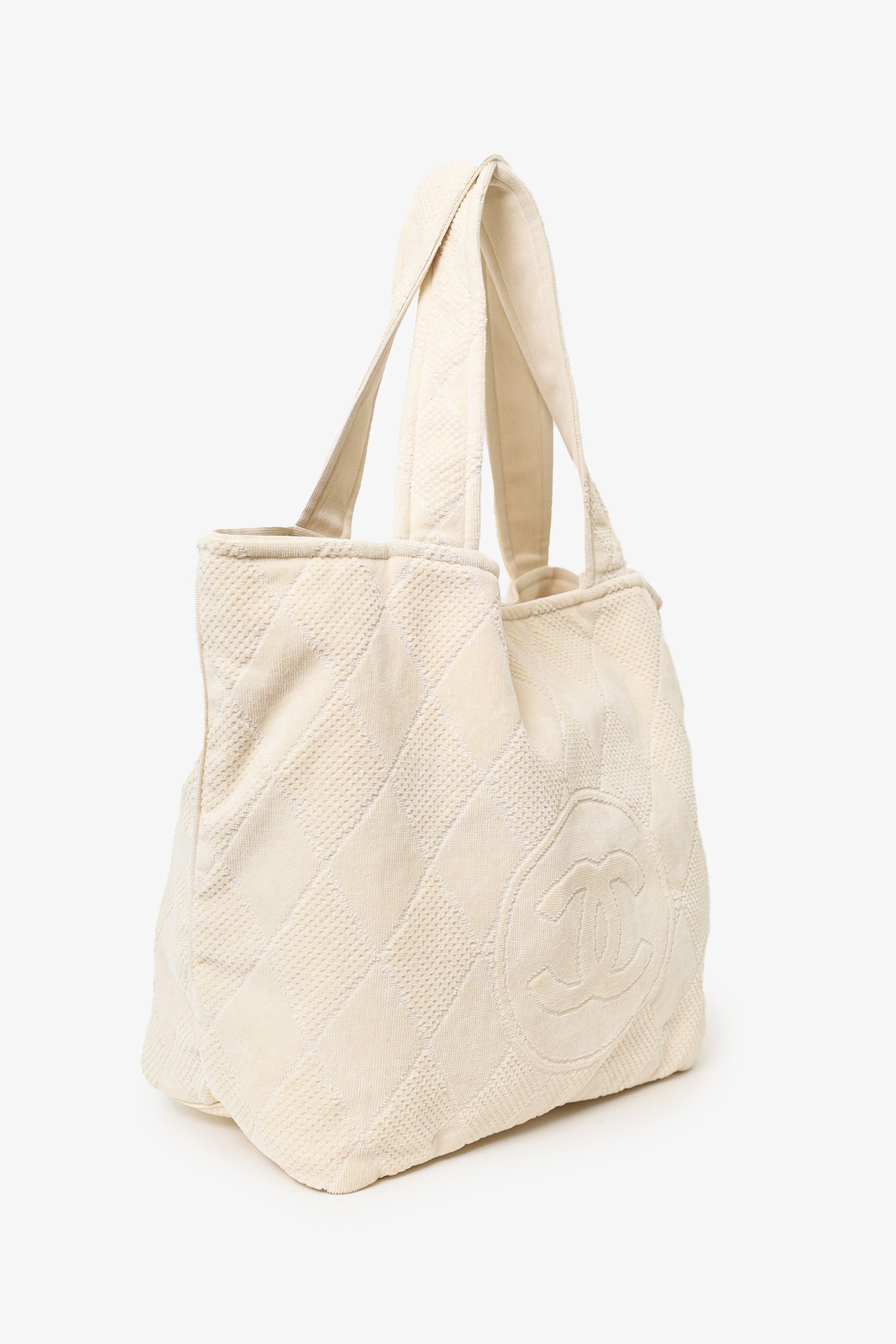 Refresh availabilityPre-Loved Chanel™ Beige Terry Cloth Beach Tote & Towel Set. Tote: Twin straps. Lined interior. 2 interior slip pockets. Removable zip pouch on interior. Towel: Fringe trimmed. Tonal stitching.