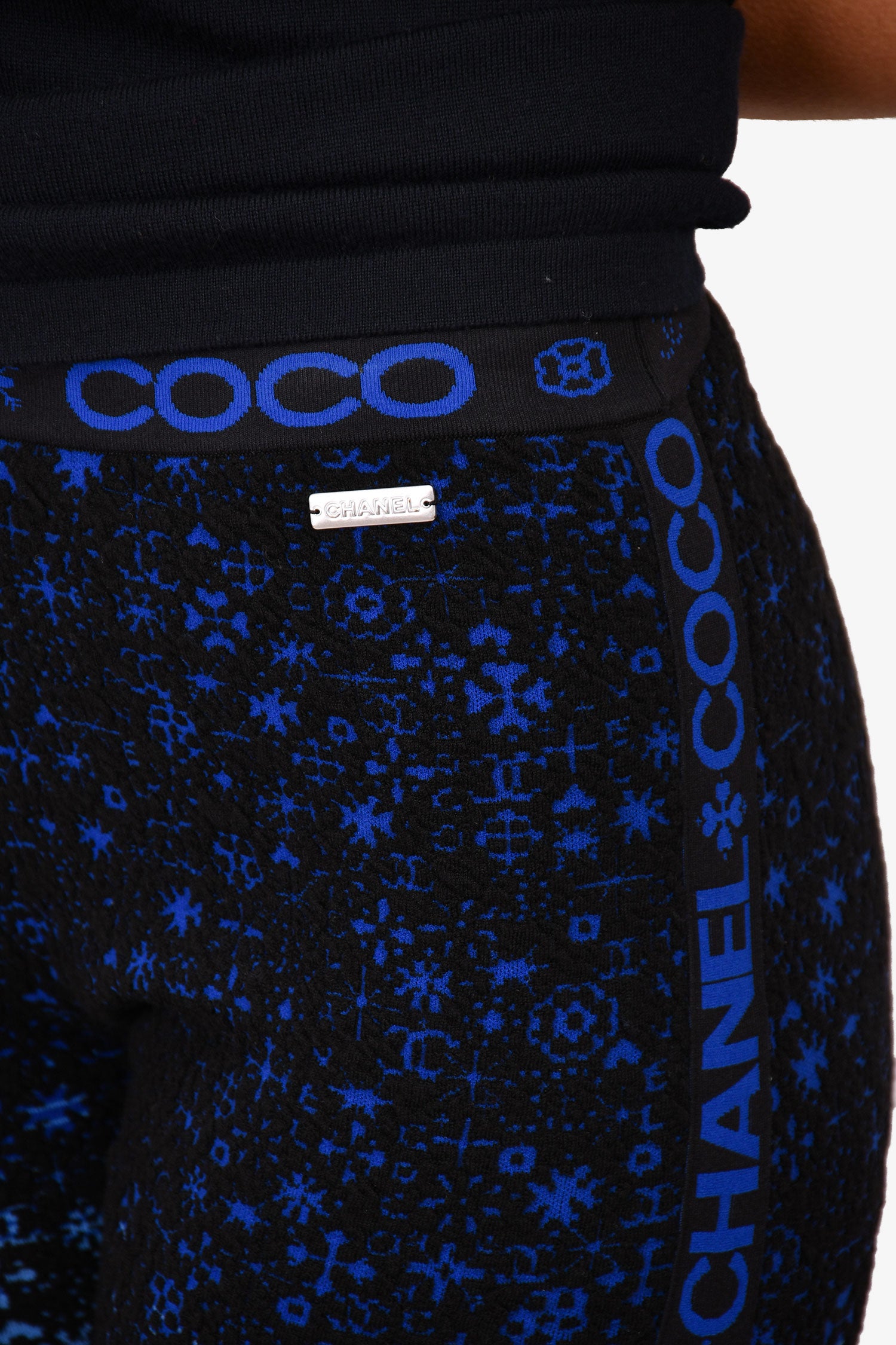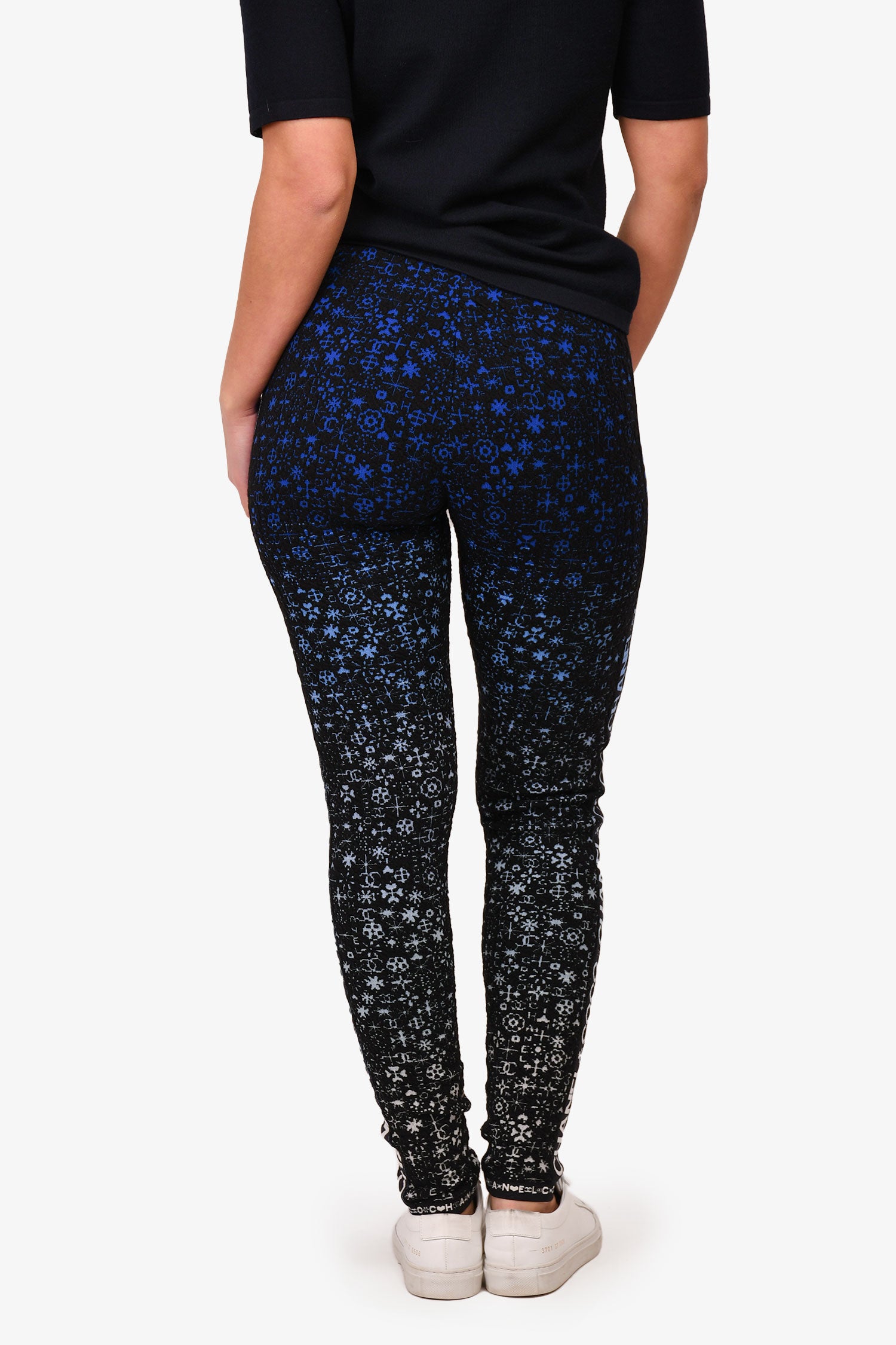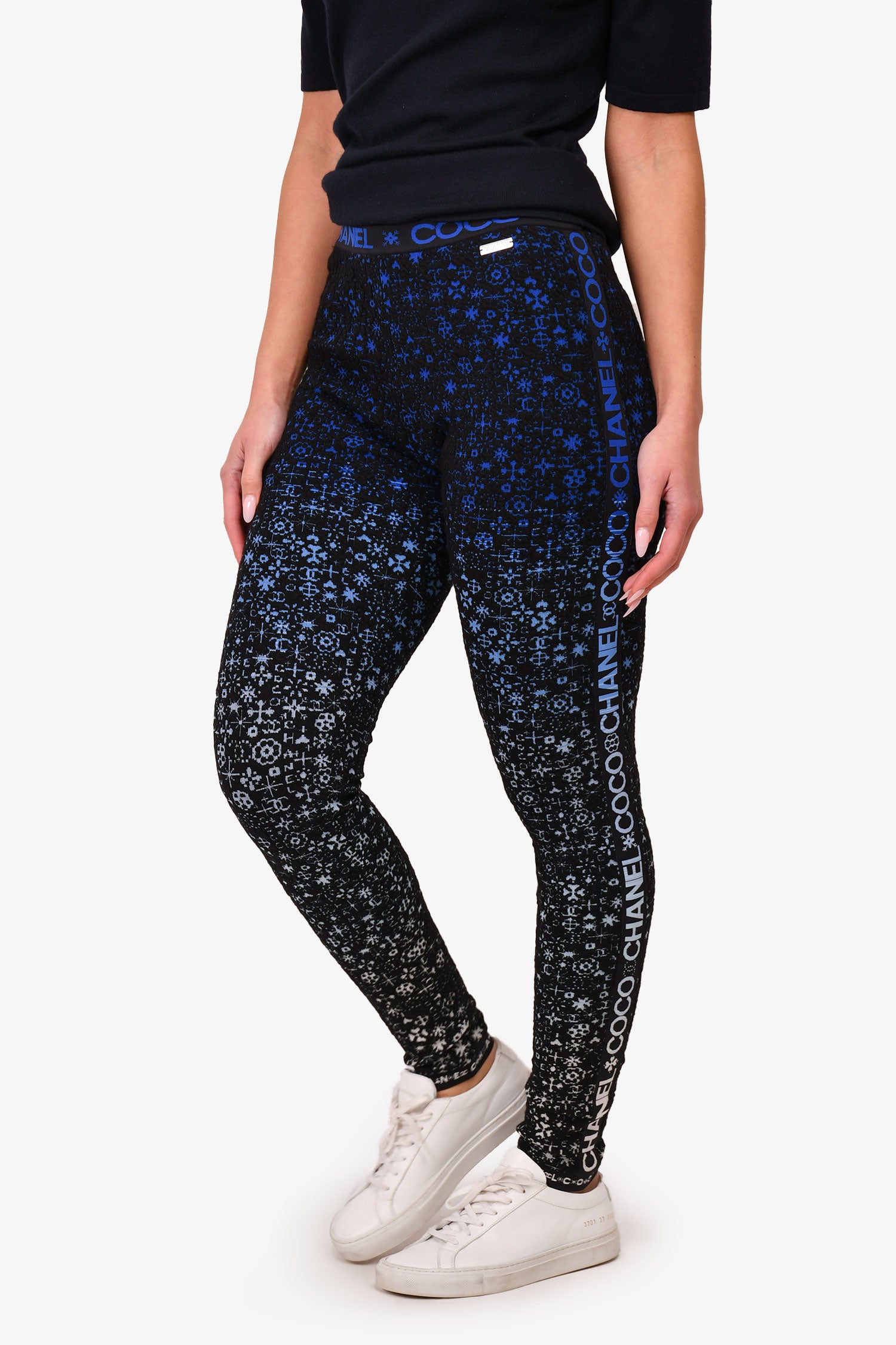 Refresh availabilityPre-Loved Chanel™ Black/Blue Coco Chanel Leggings. Elasticated waistband with 'COCO CHANEL' lettering. Black band on the seams of the legging. Gradient blue to white underlay. Elasticated bands on the ankle cuffs.