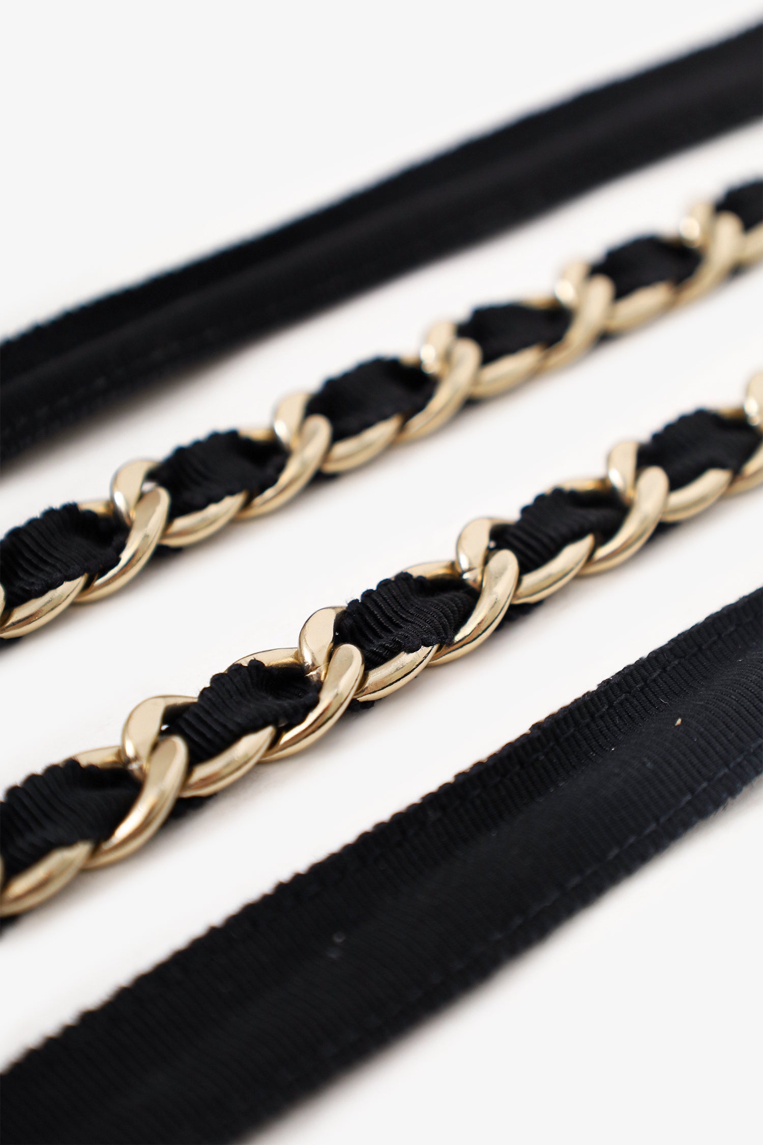 Refresh availabilityPre-Loved Chanel™ Black Canvas Chain Belt. Adjustable tie-up closure. Partial chainlink/canvas. Tonal stitching. Silver-tone hardware.