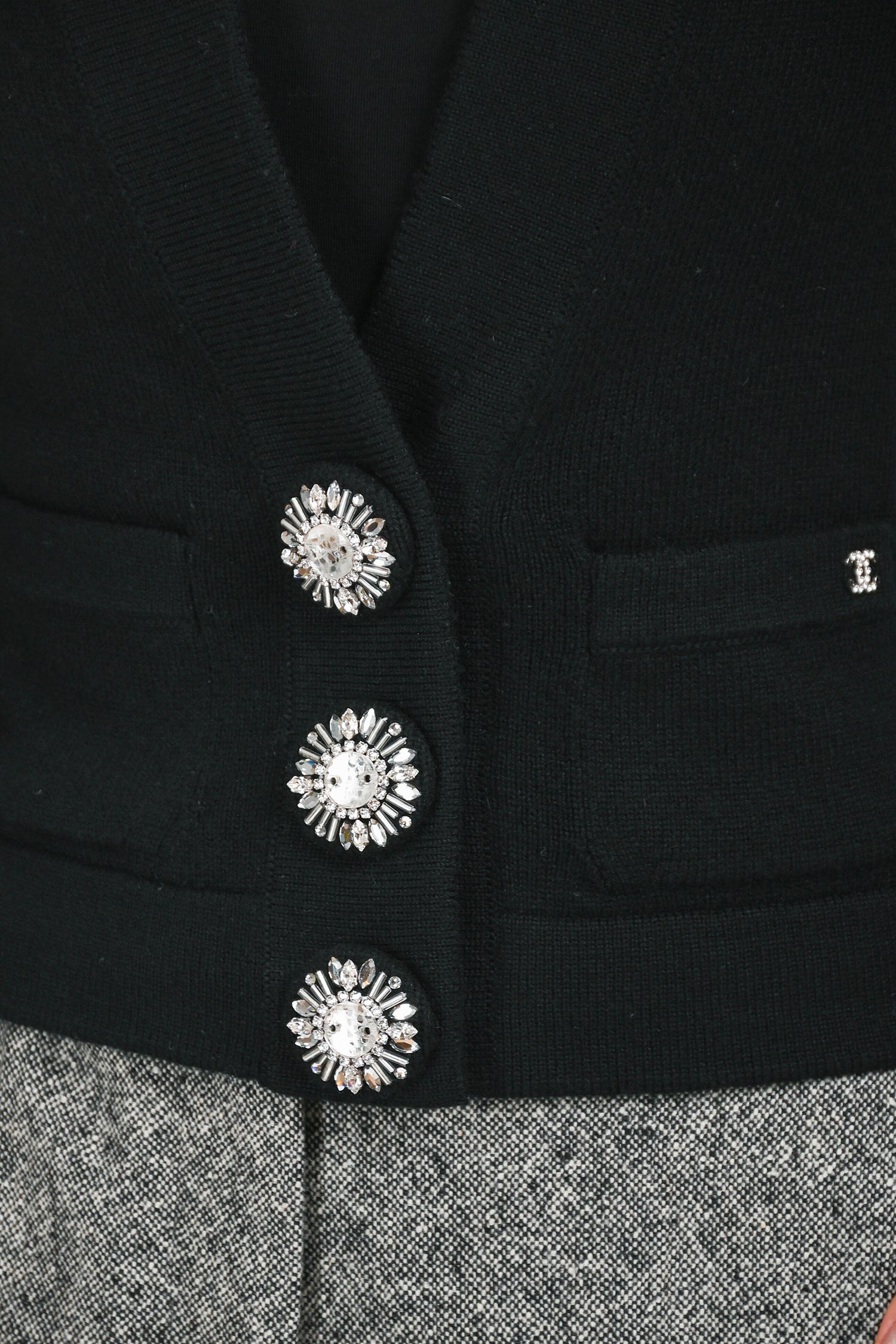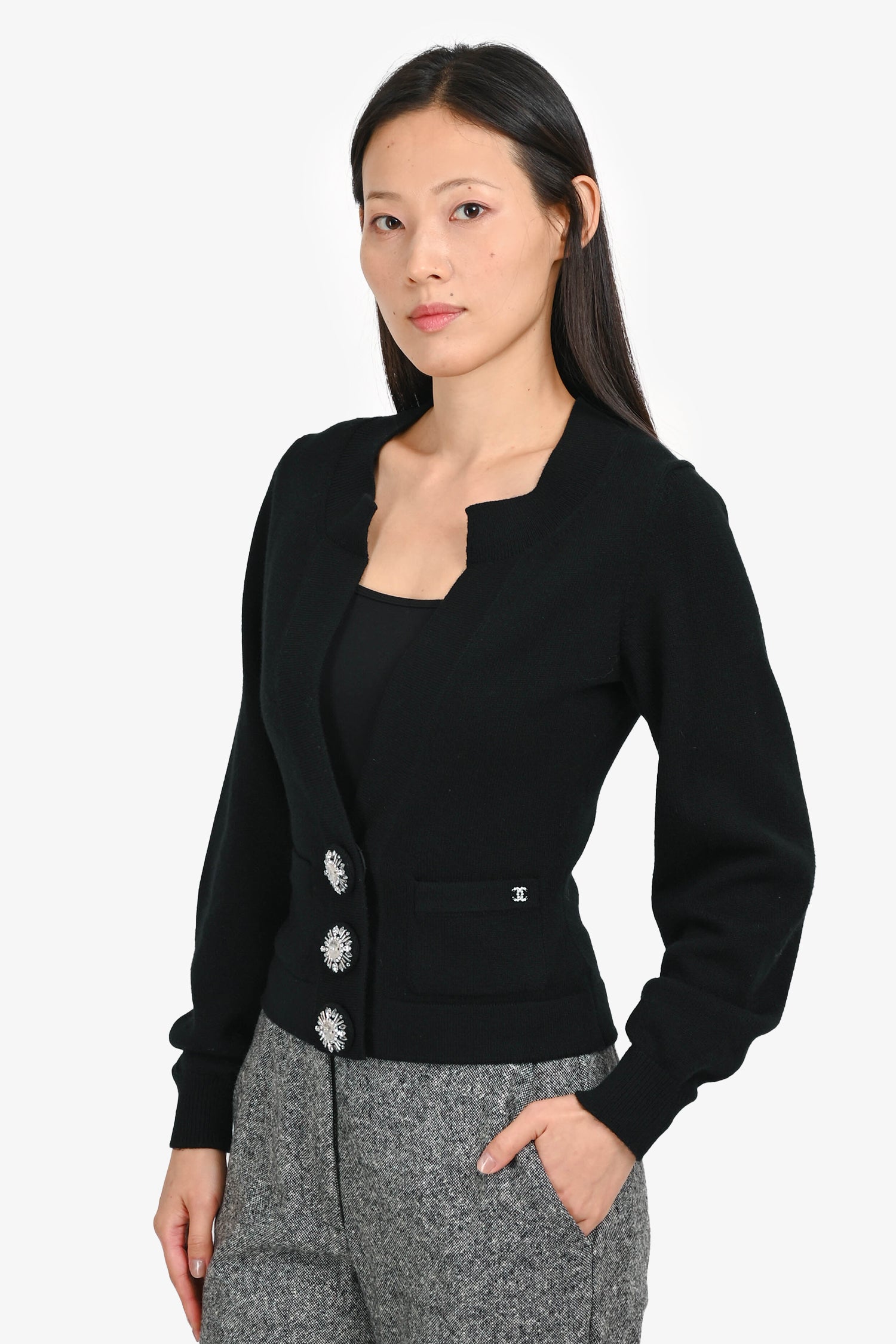 Refresh availabilityPre-Loved Chanel™ Black Cashmere Embellished Button Cardigan. Pull-on. Ribbed neckline, and cuffs. 2 slip-in pockets in the front. Embellished snap closure in the front. Tonal stitching.