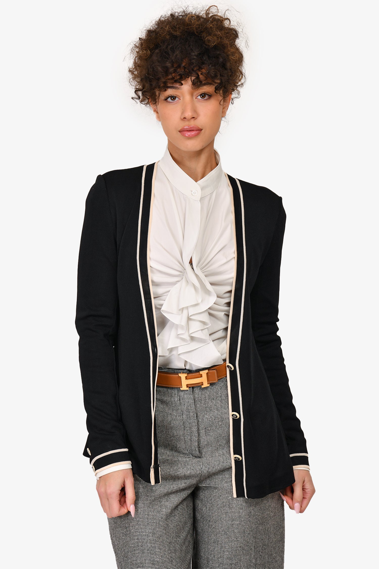 Pre-Loved Chanel™ 2014 Black/Cream CC Button Cardigan. Front button-up closure. V-neck. Front pockets. Button closure on the cuffs.