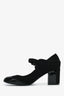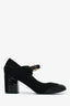Pre-Loved Chanel™ Black Fabric/Patent Leather Mary Jane Heels. Almond toe. Buckle closure. Gold-tone hardware. Tonal stitching.