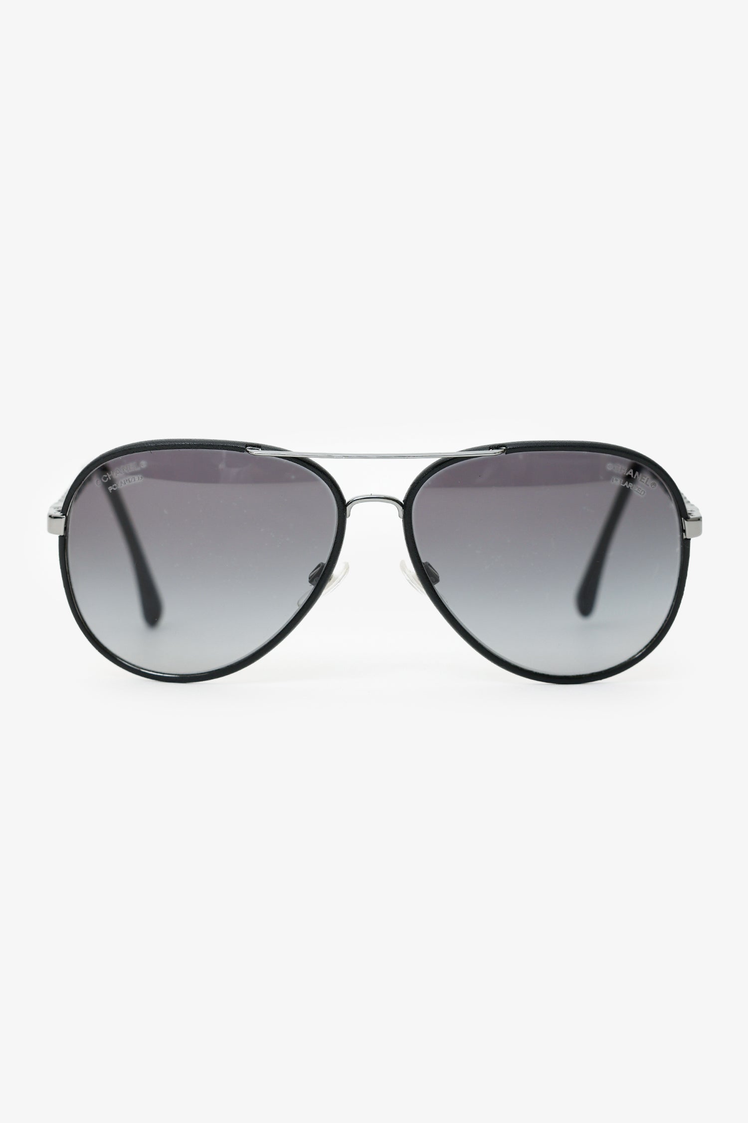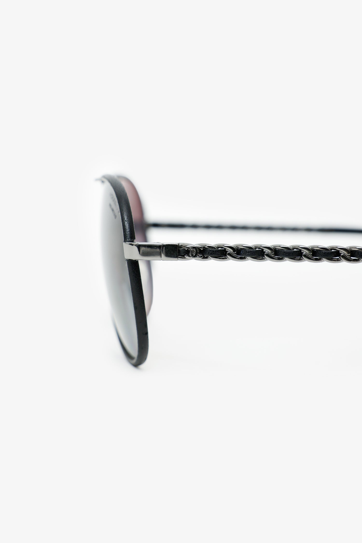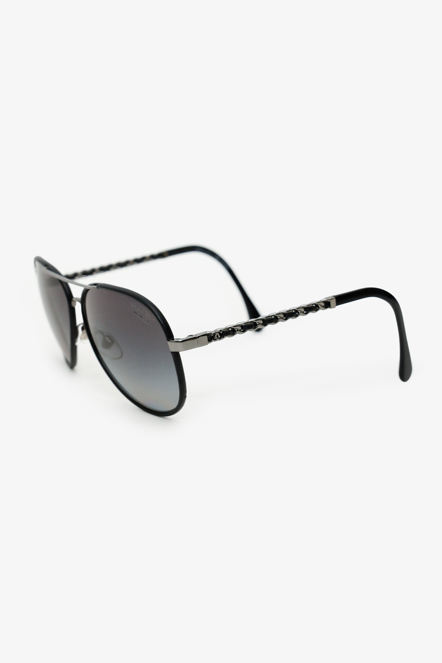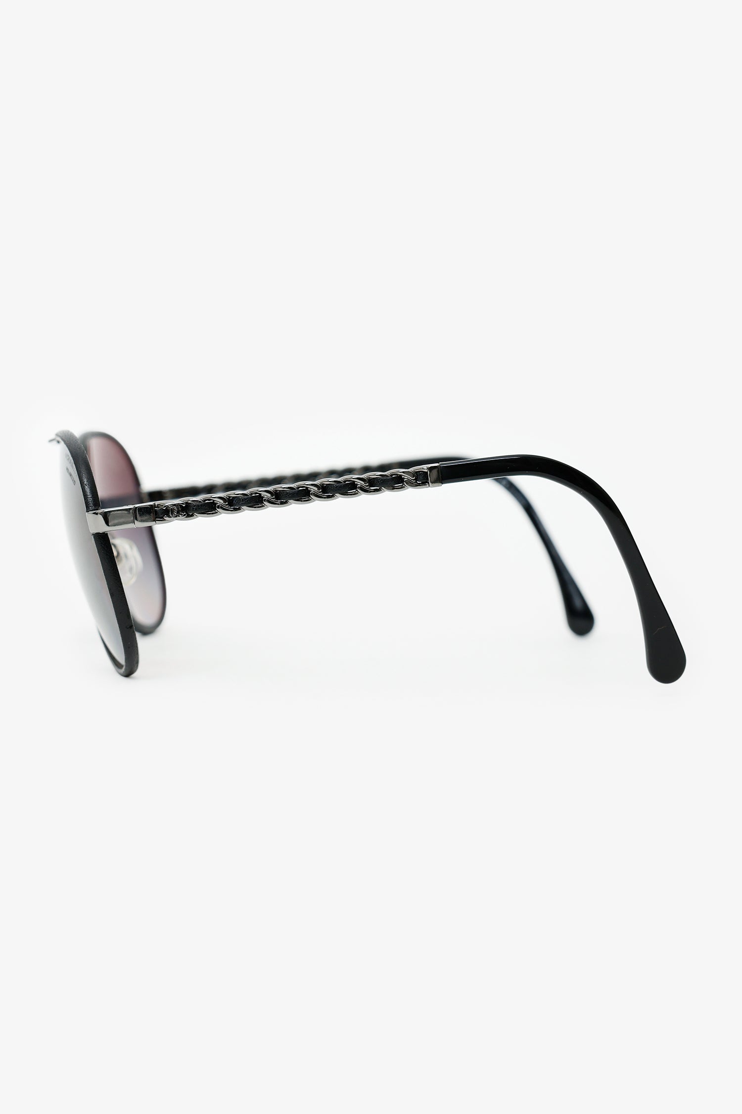 Refresh availabilityPre-Loved Chanel™ Black Frame Leather Trimmed Chain Aviator Sunglasses. Adjustable nose pads. Gunmetal-tone hardware.