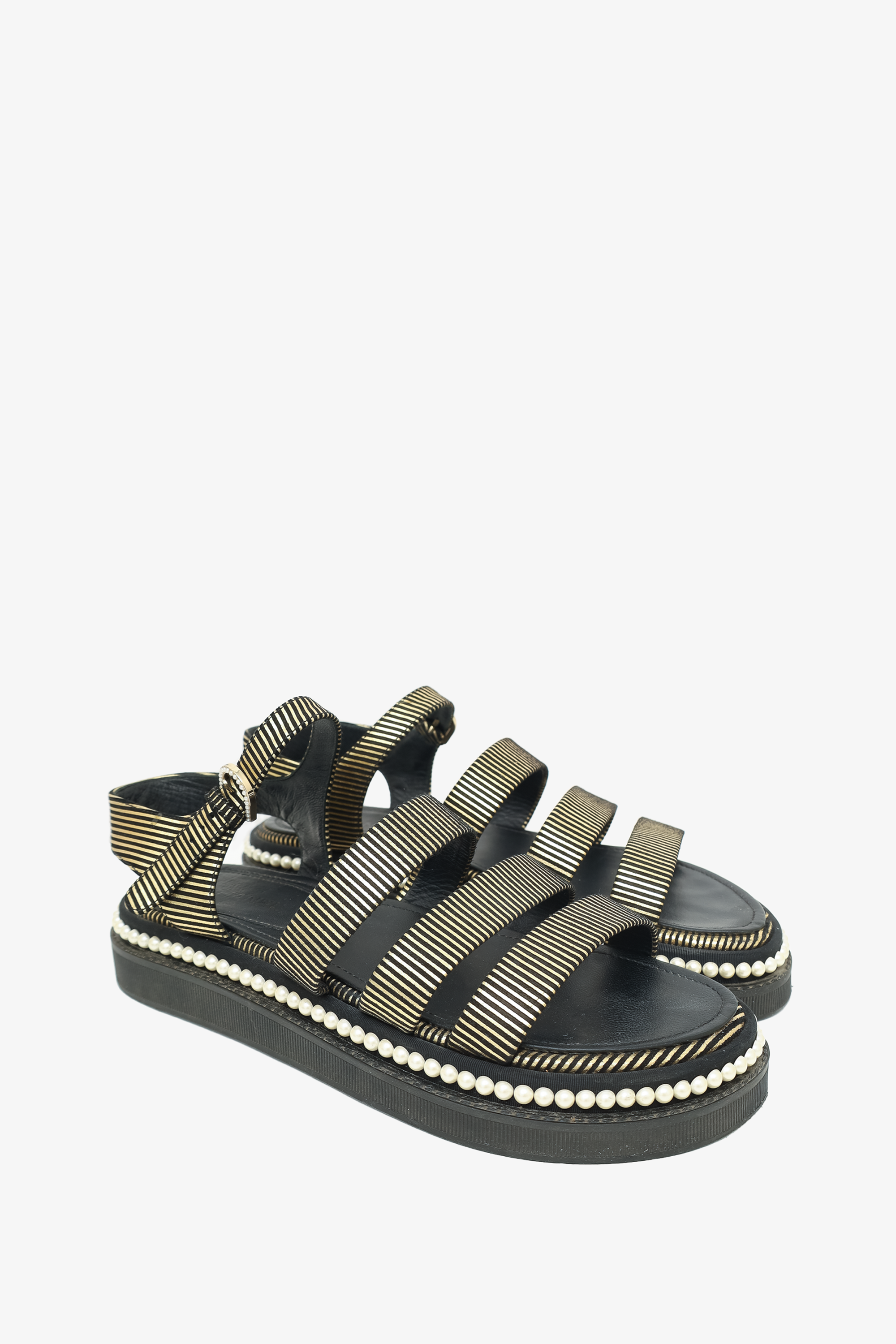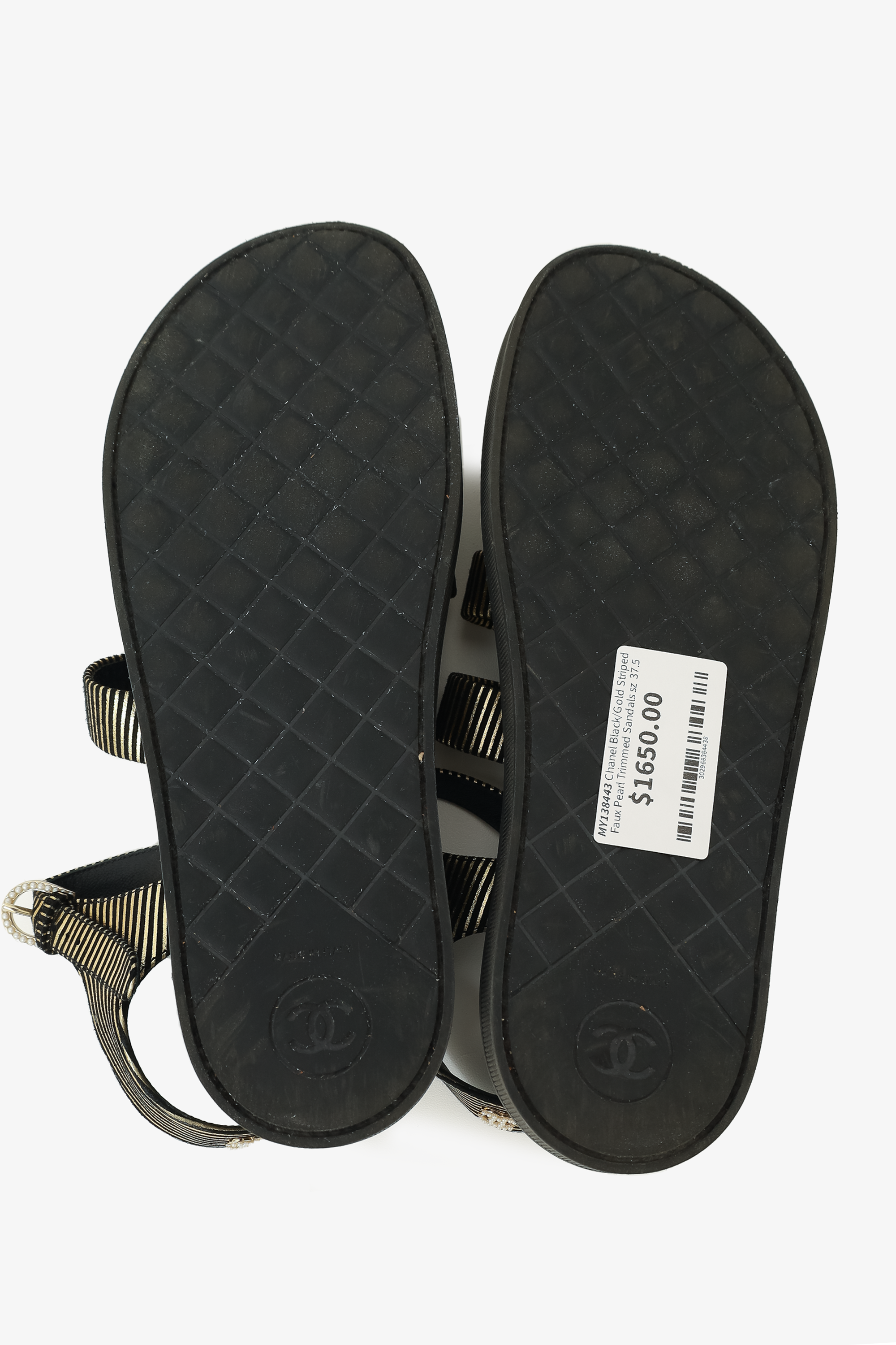 Pre-Loved Chanel™ Black/Gold Striped Faux Pearl Trimmed Sandals Size 37.5