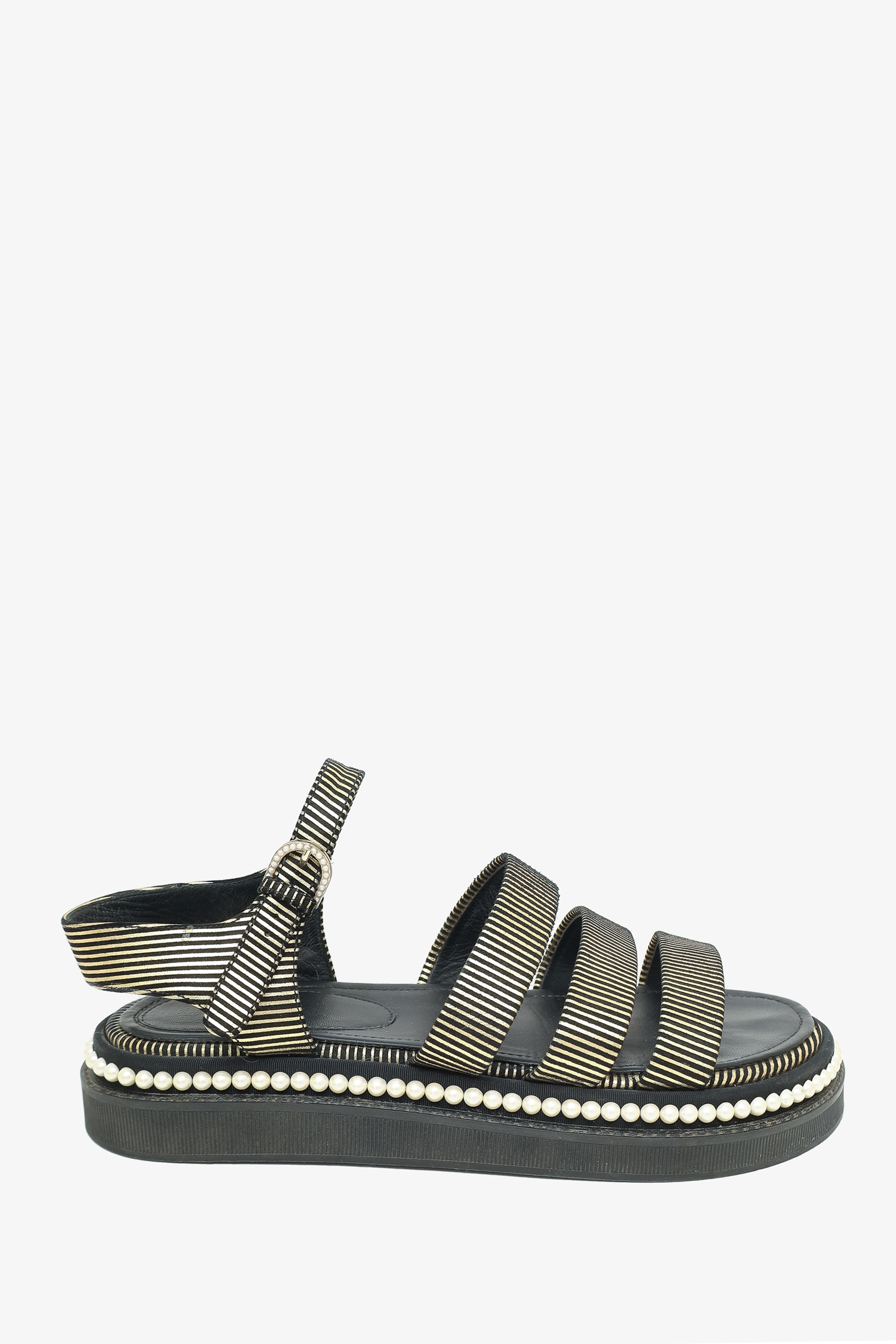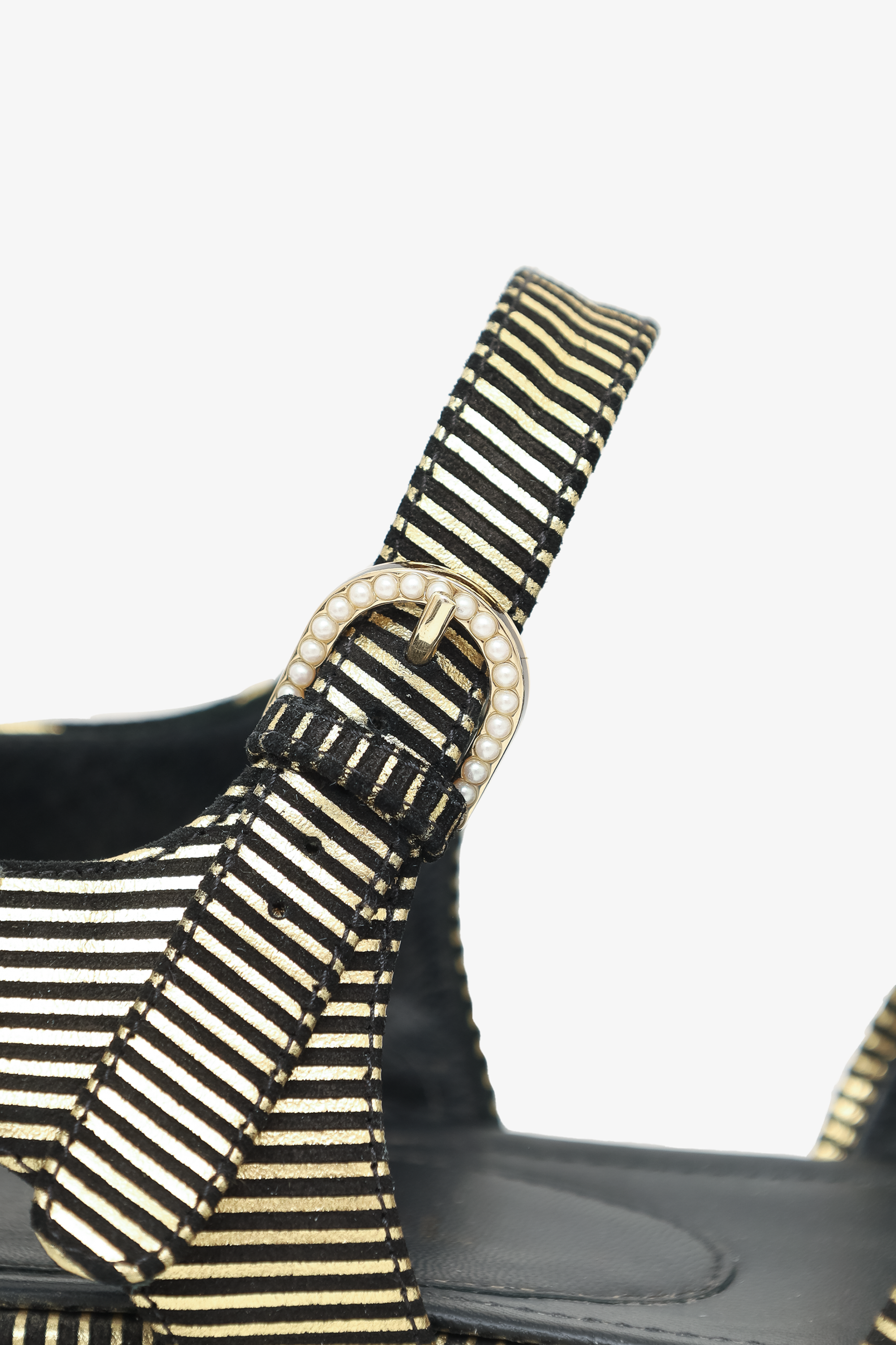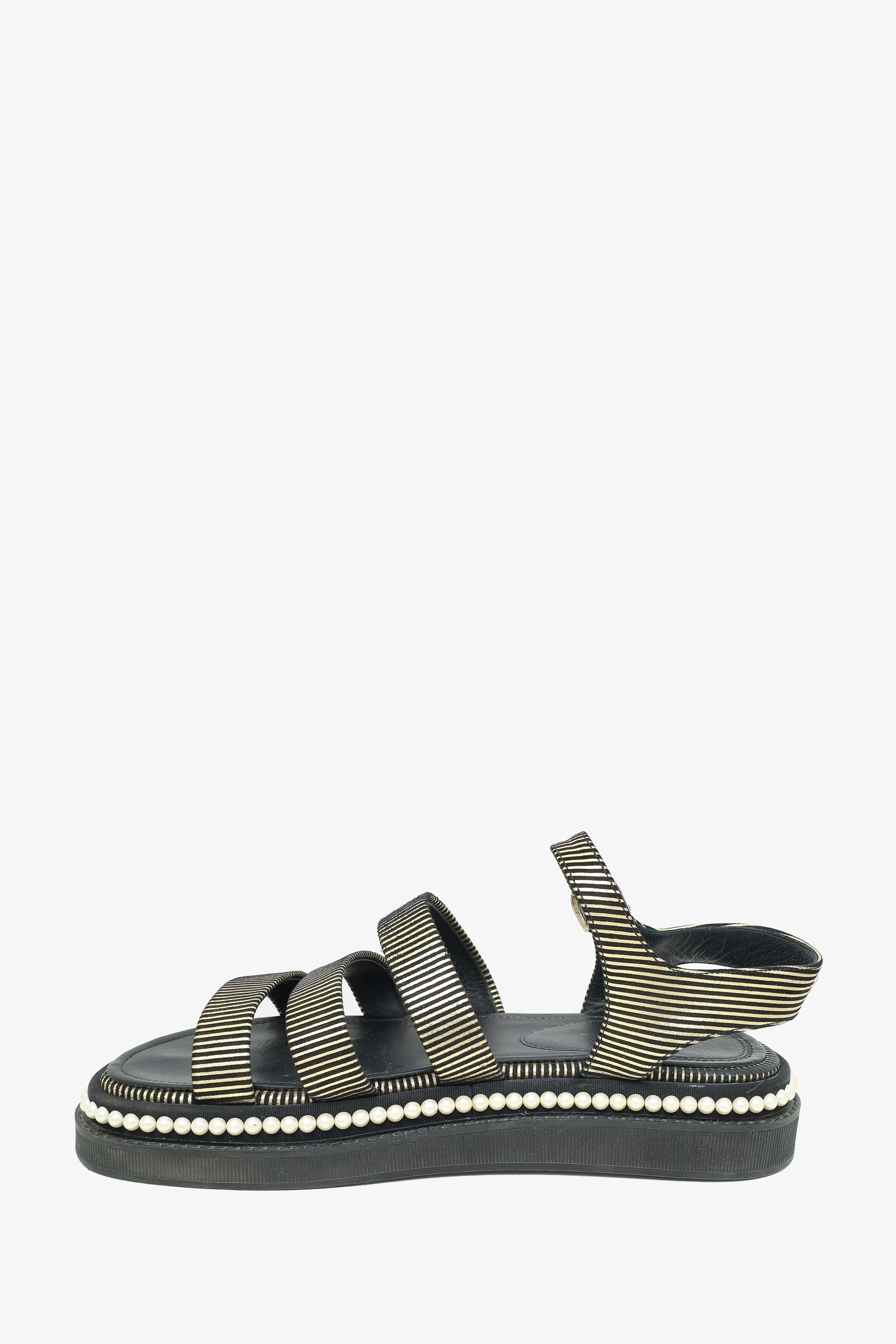 Refresh availabilityPre-Loved Chanel™ Black/Gold Striped Faux Pearl Trimmed Sandals. Ankle strap with adjustable buckle closure. Round toe. Tonal stitching. Comes with box and dustbag.