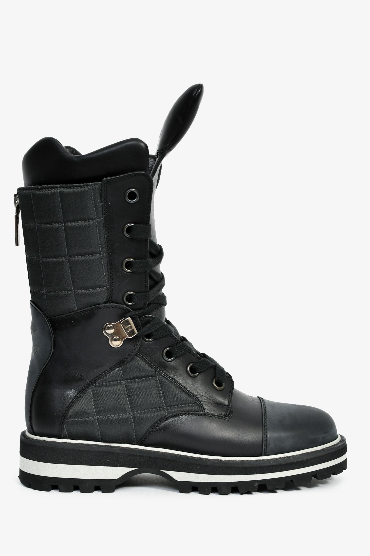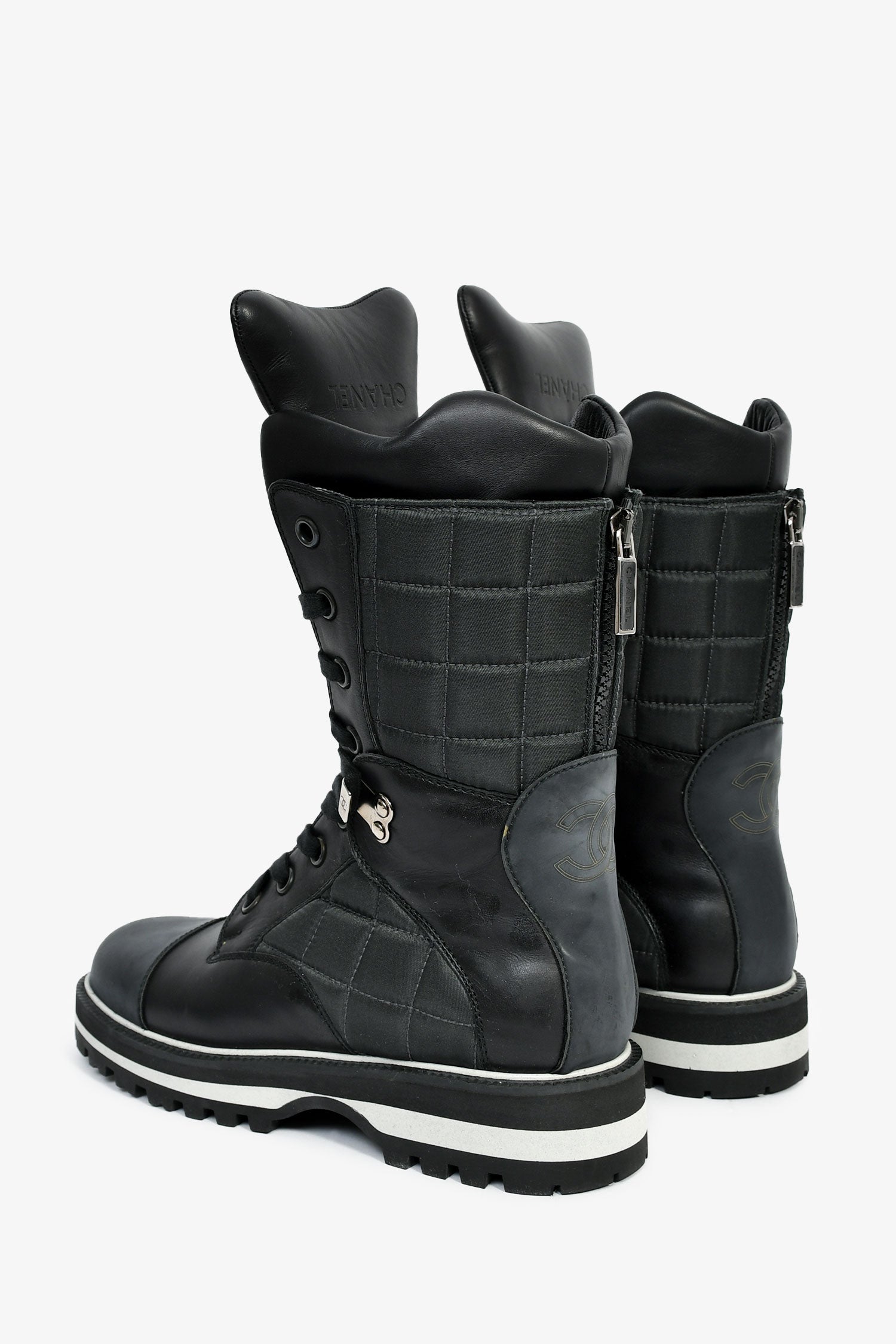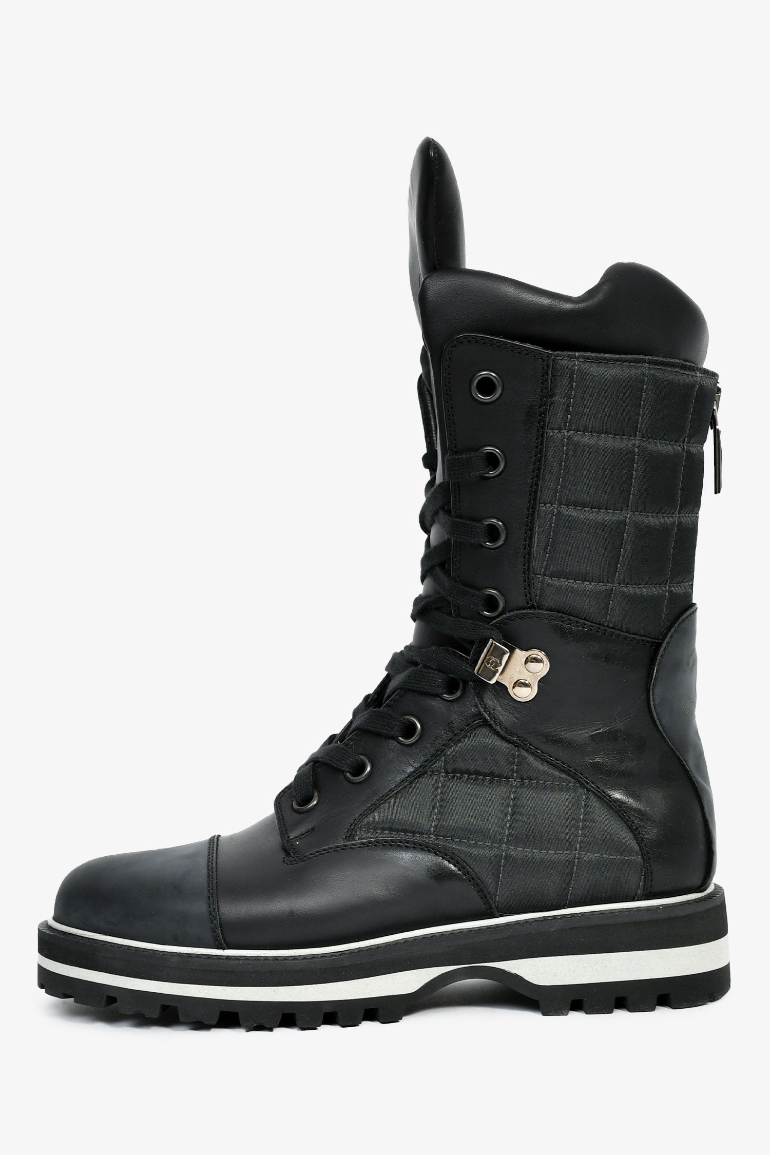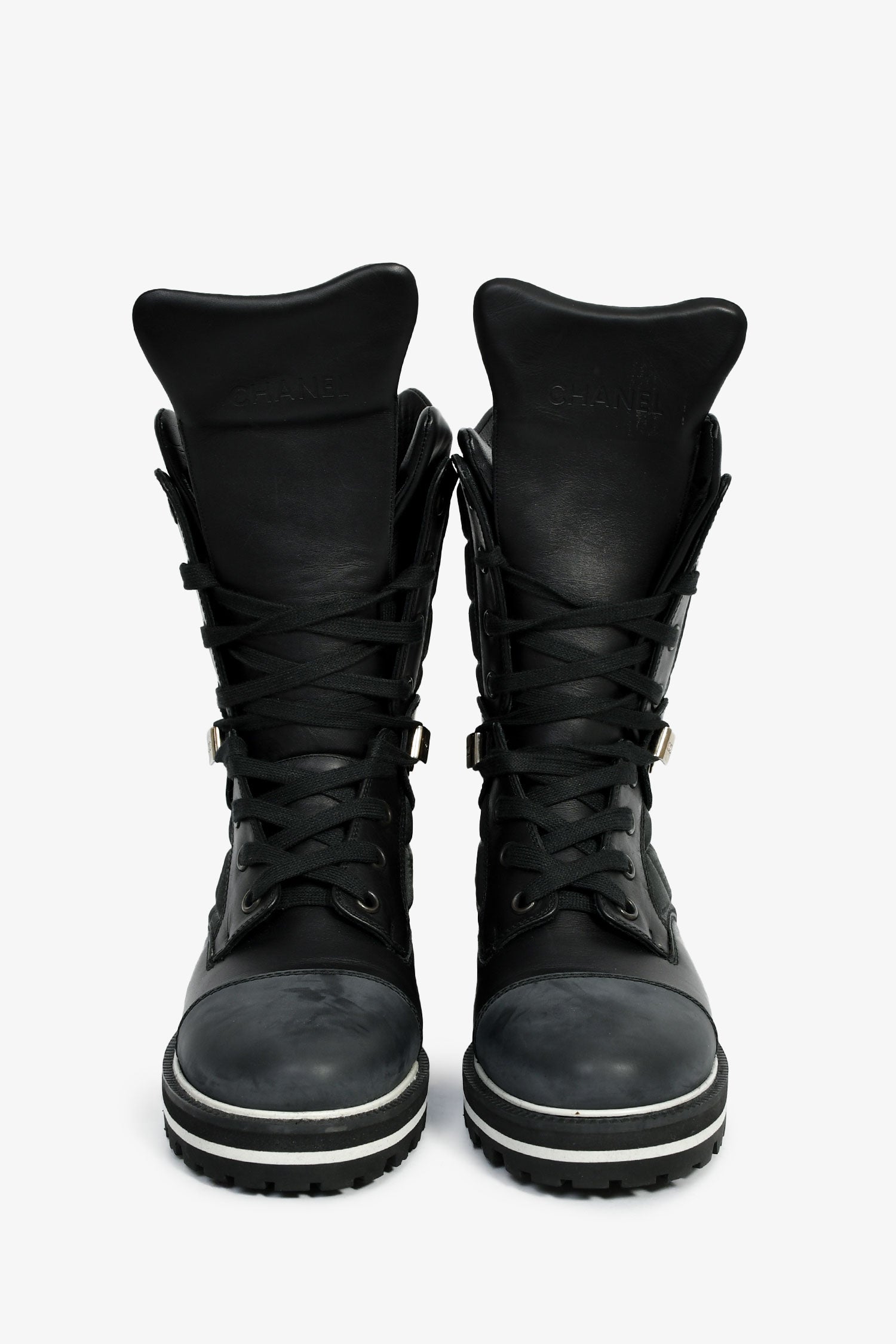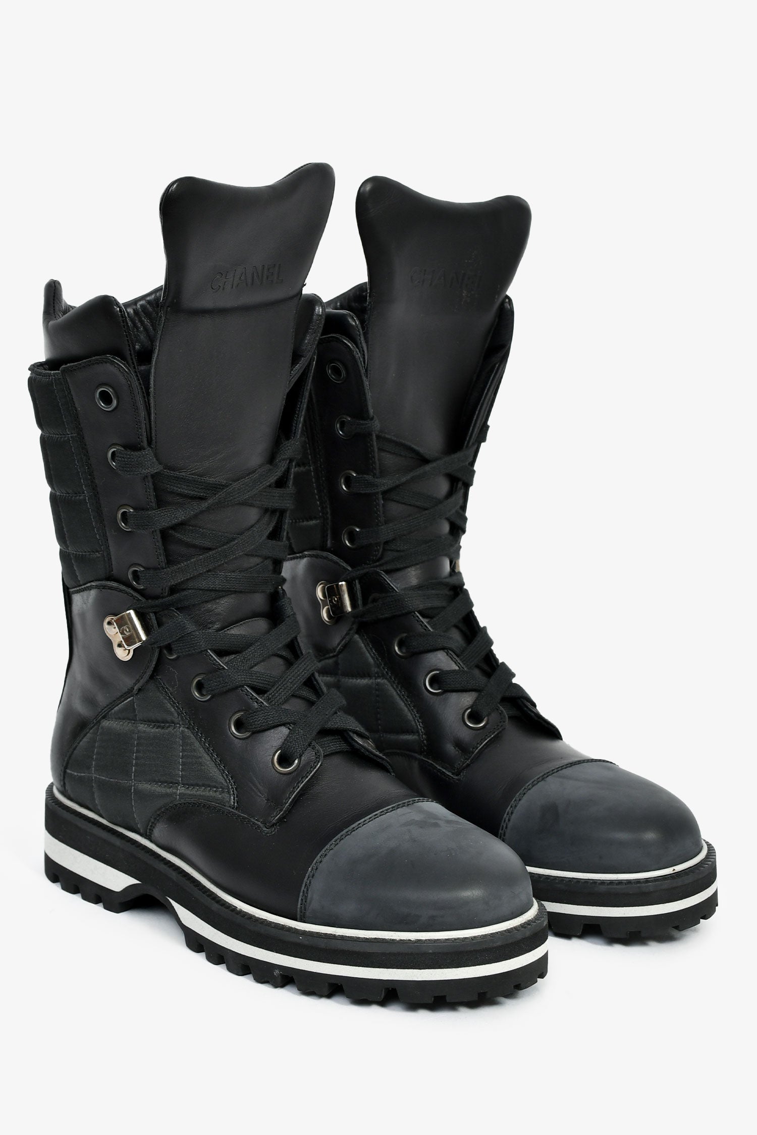 Refresh availabilityPre-Loved Chanel™ Black Leather CC Logo Combat Boots. Pull-on. Round toe. Lace-up closure. Silver-tone hardware. Tonal stitching.