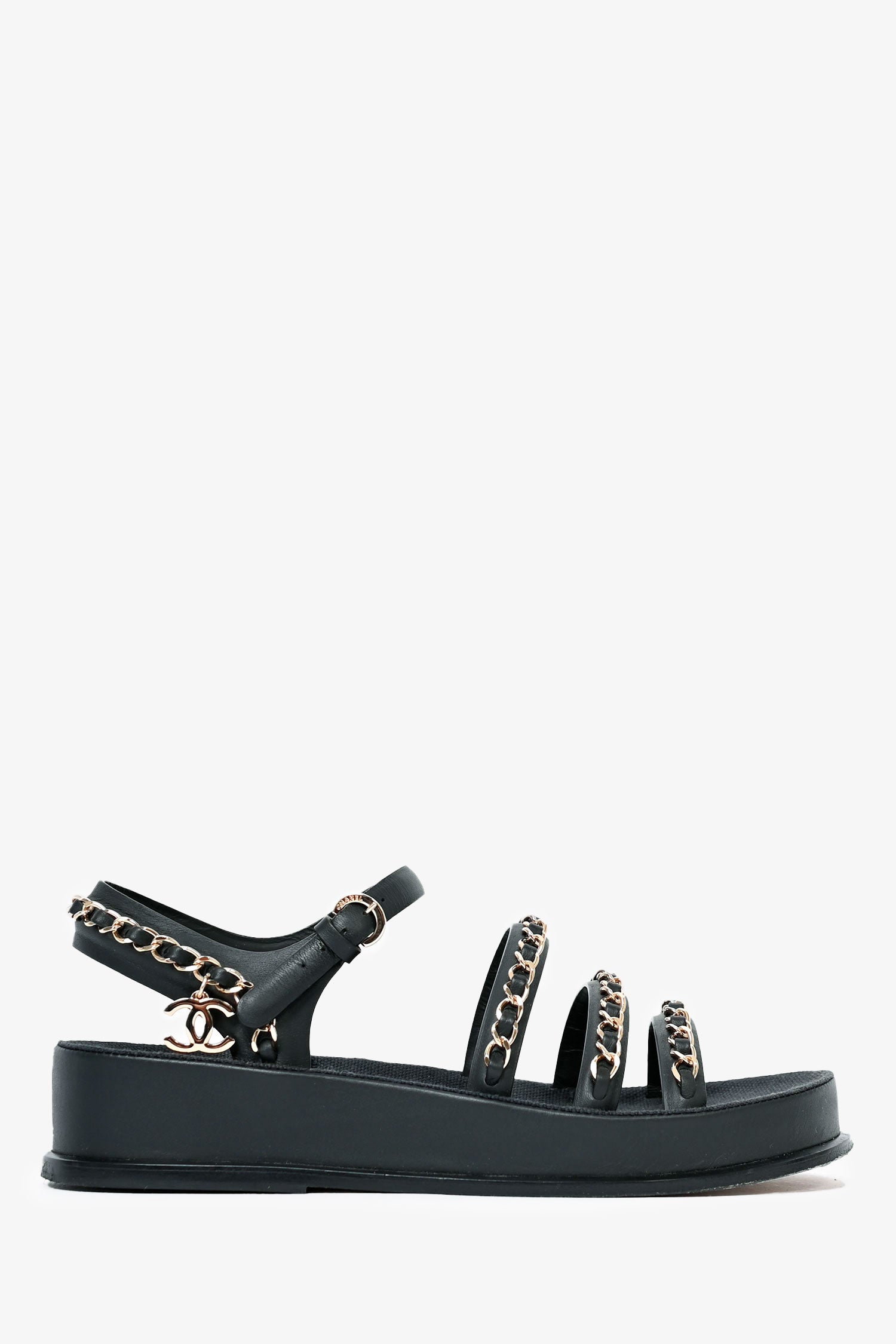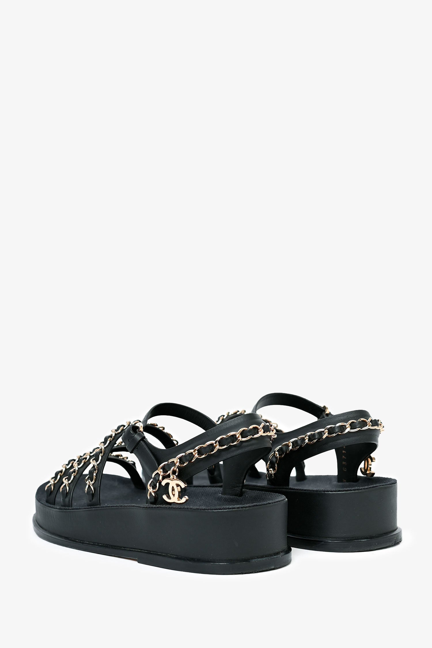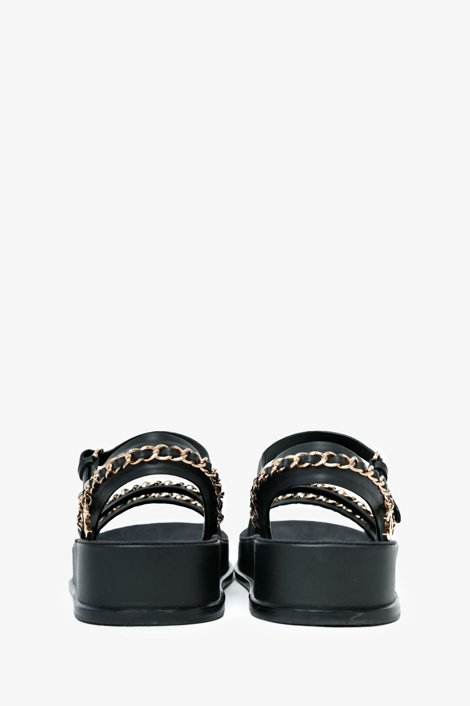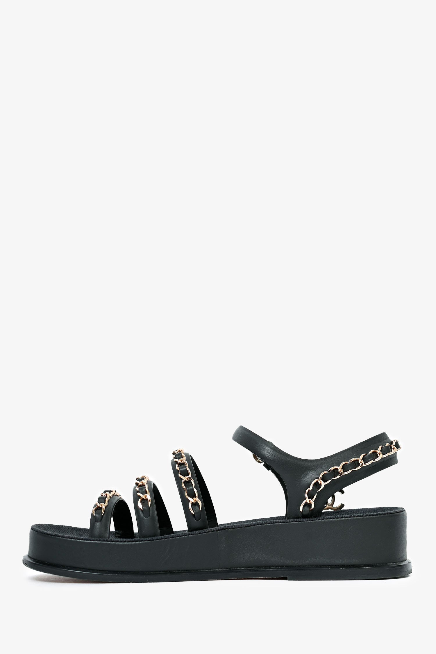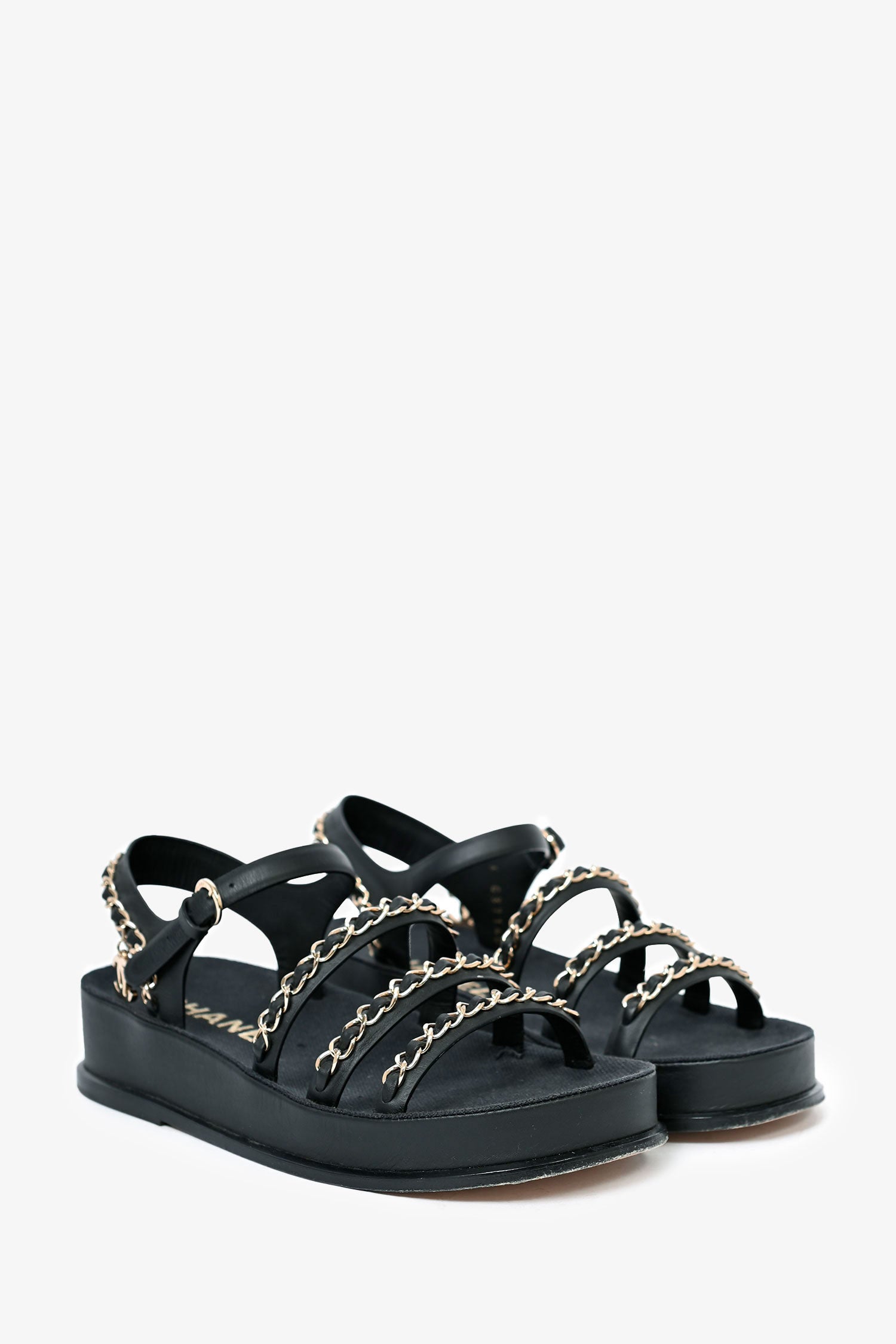 Refresh availabilityPre-Loved Chanel™ Black Leather Chain Embellished Sandals. Lined canvas interior. Chain-link and leather detailing. Pin-buckle. Tonal stitching.