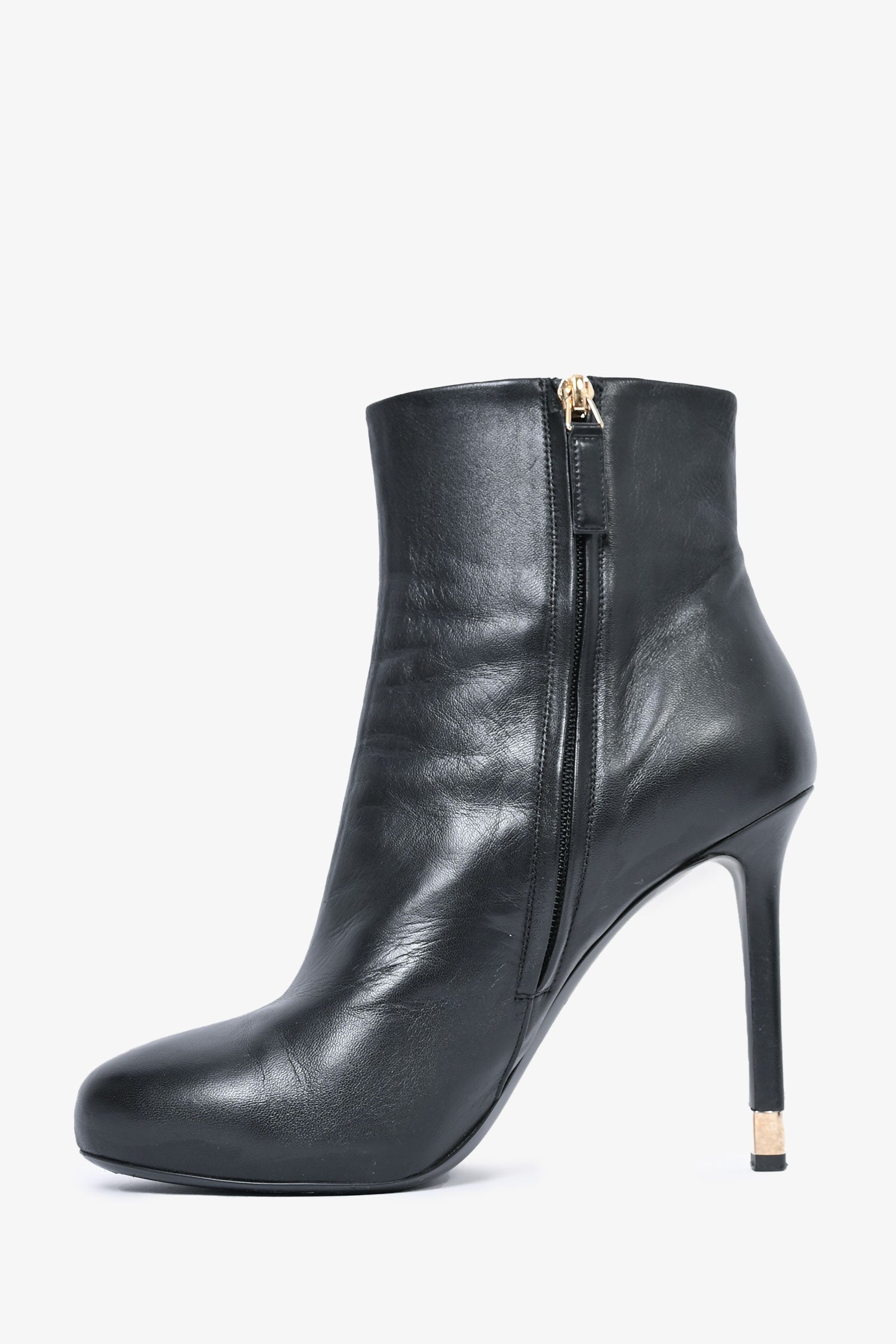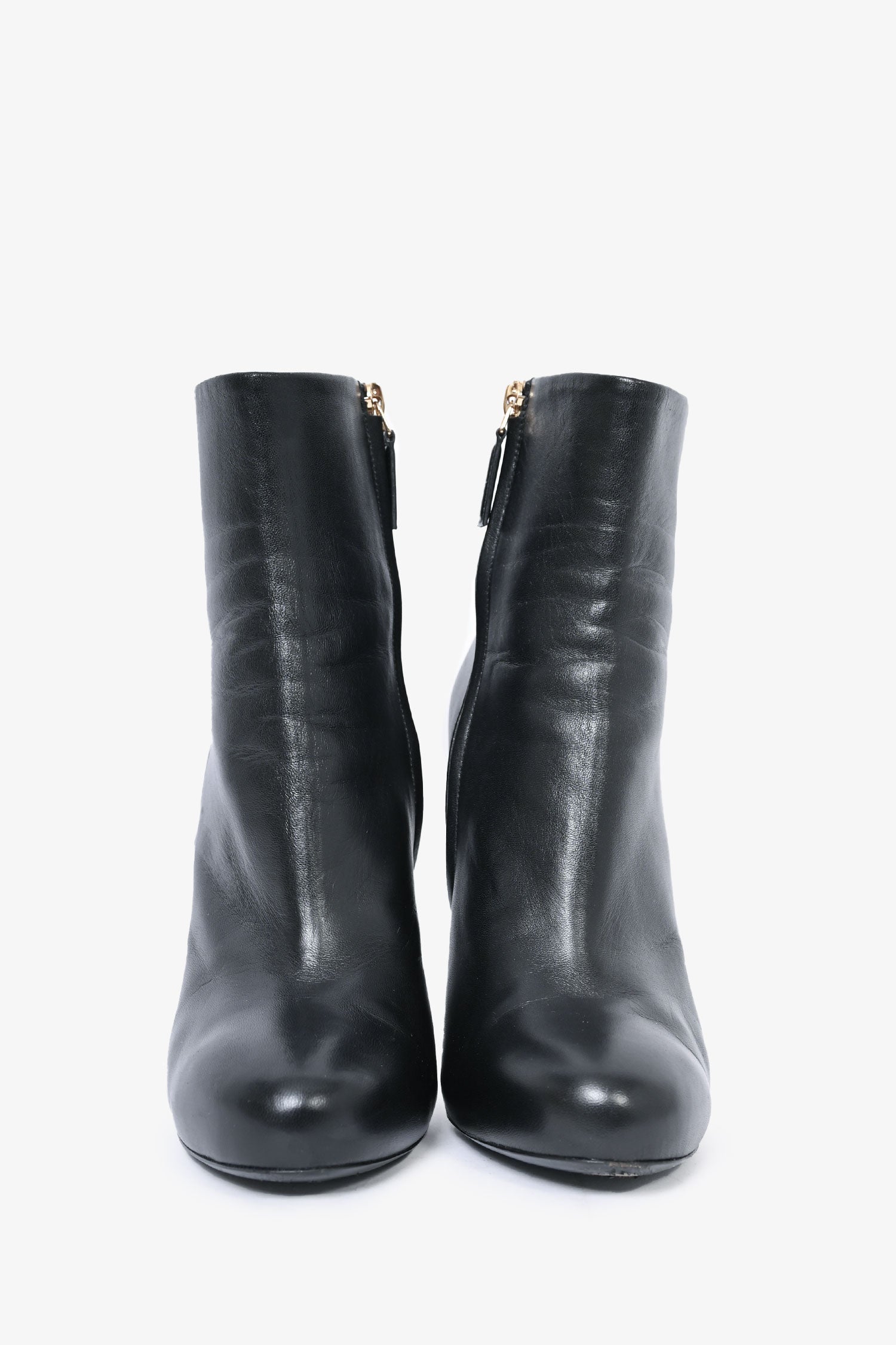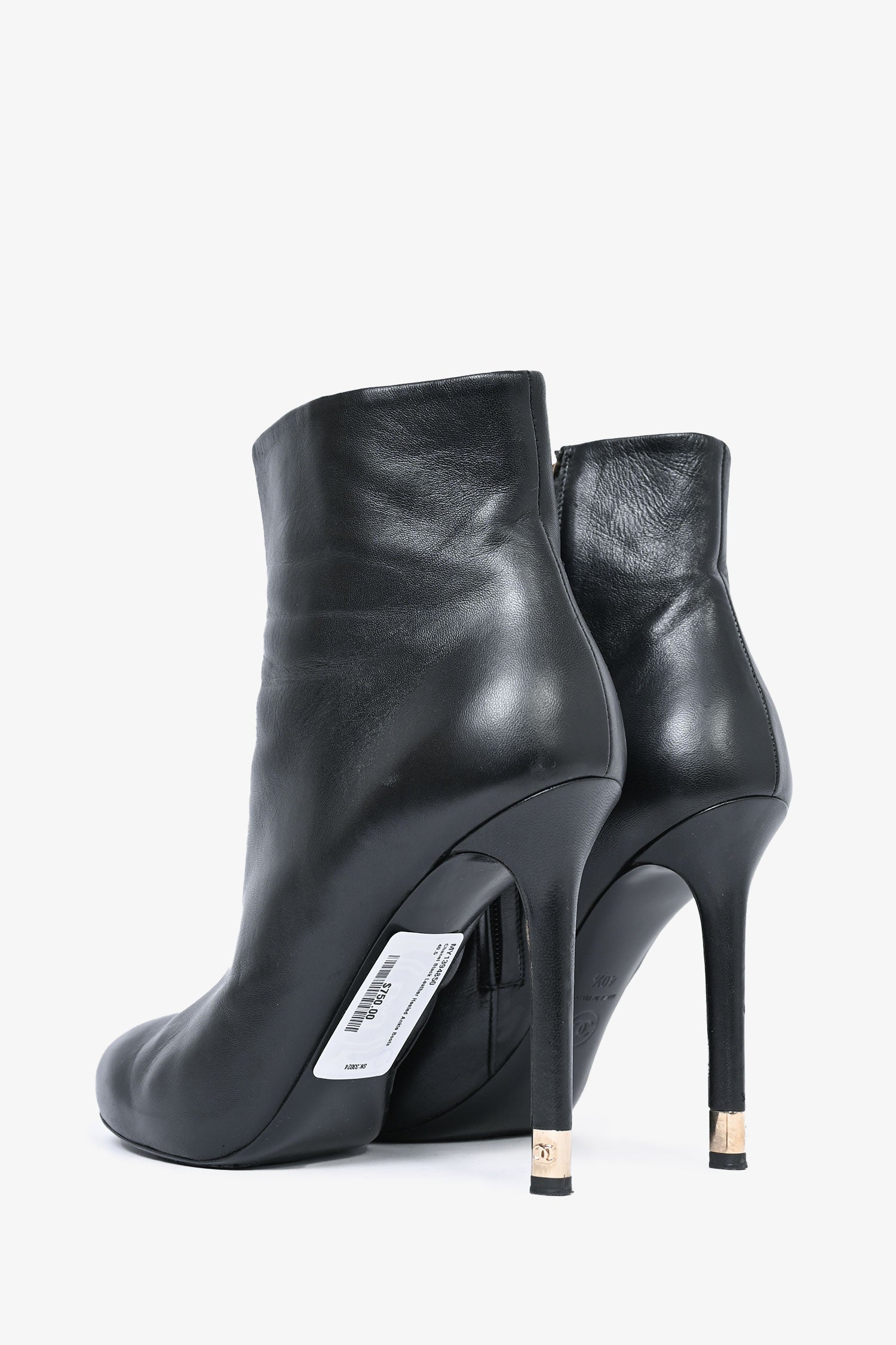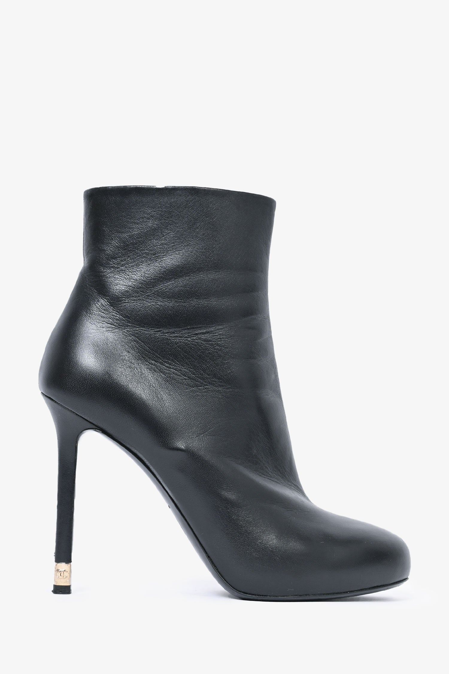 Refresh availabilityPre-Loved Chanel™ Black Leather Heeled Ankle Boots. Round toe. Gold-tone hardware.