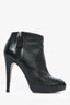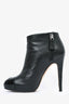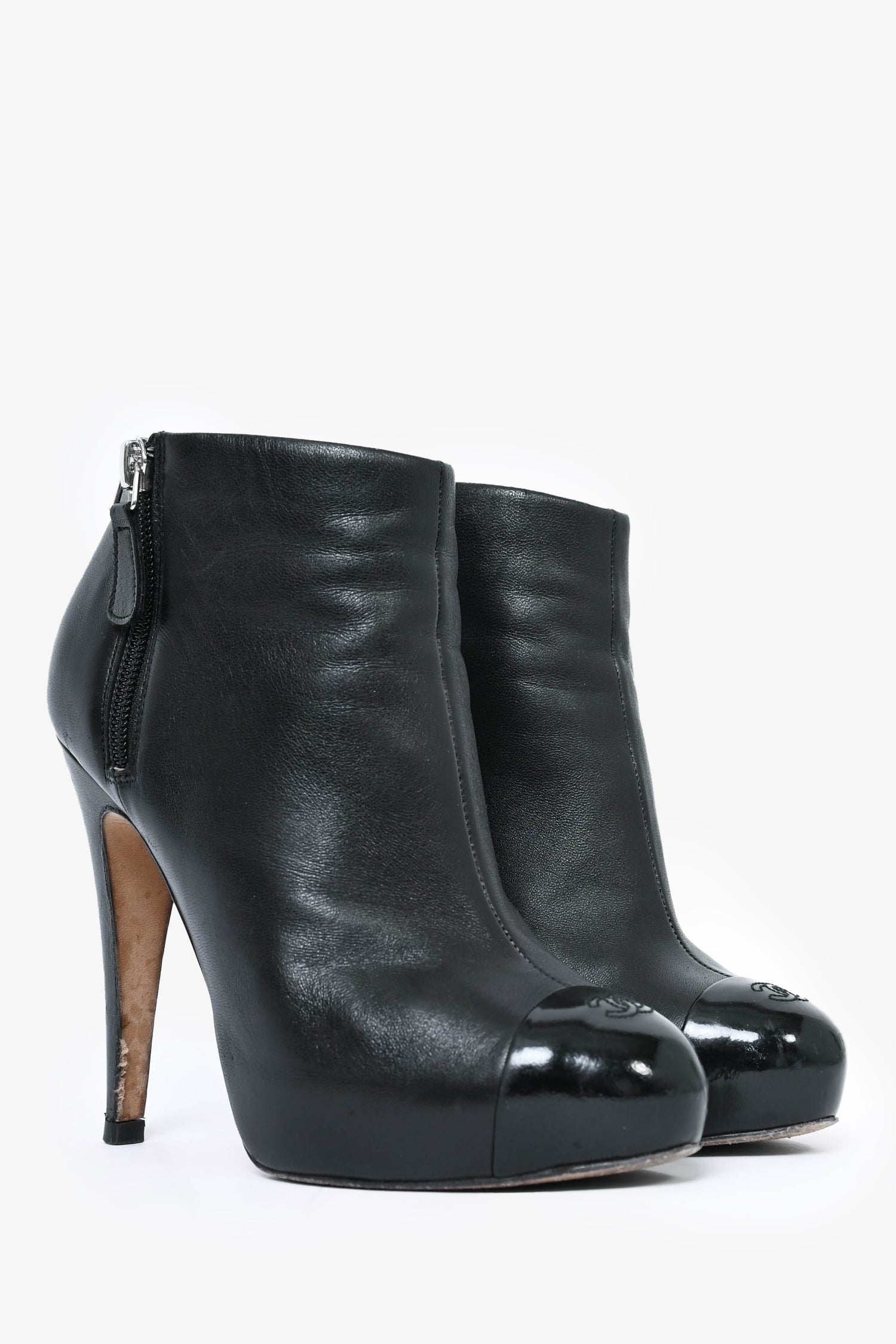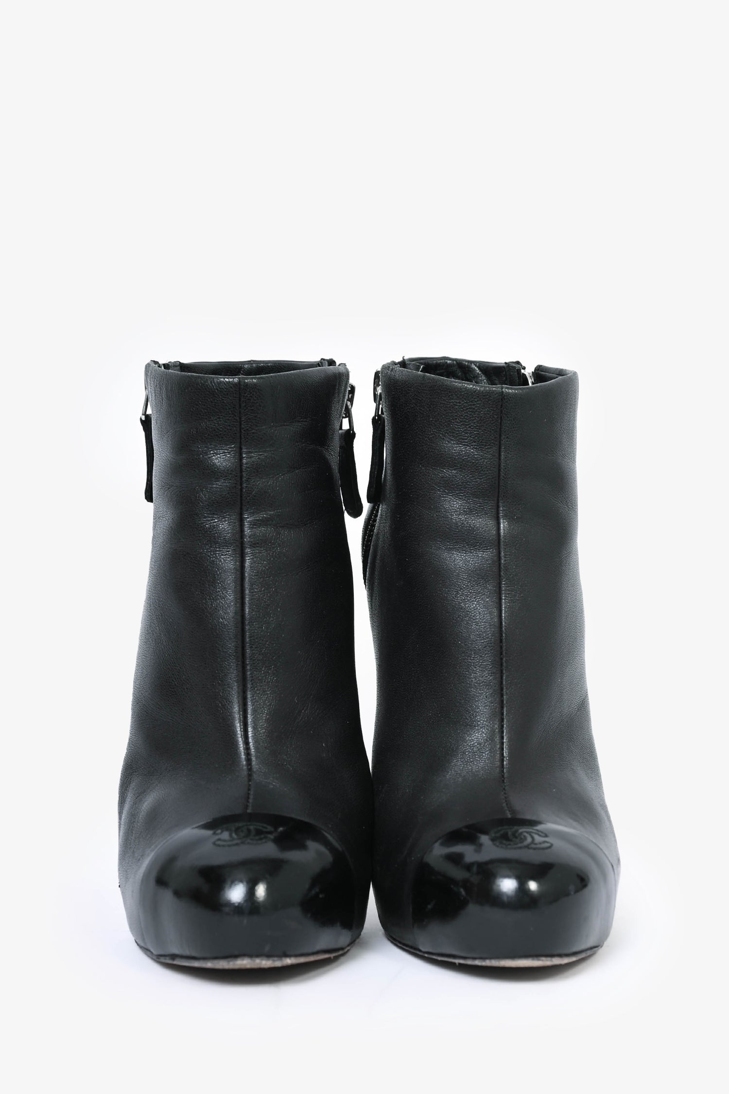 Refresh availabilityPre-Loved Chanel™ Black Leather Heeled Booties with Patent Toe Cap. Tonal stitching. Round toe. Covered stiletto heel in leather.