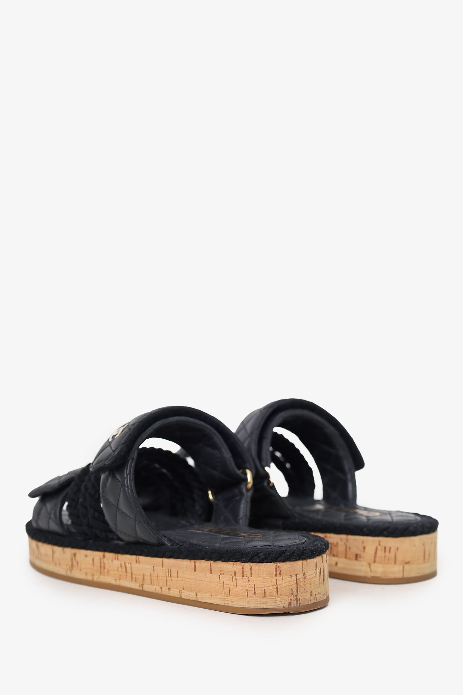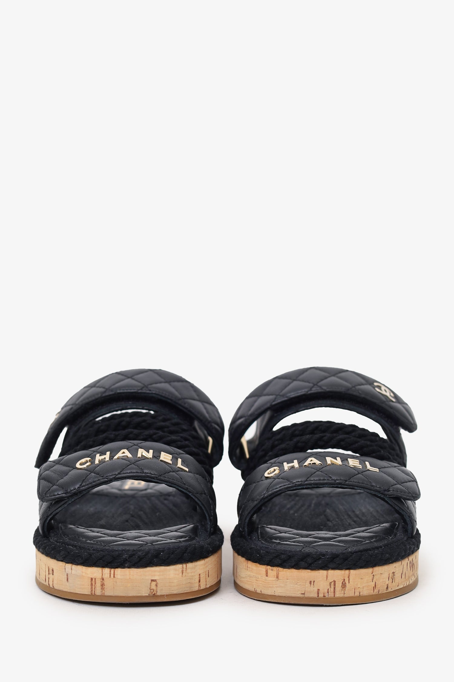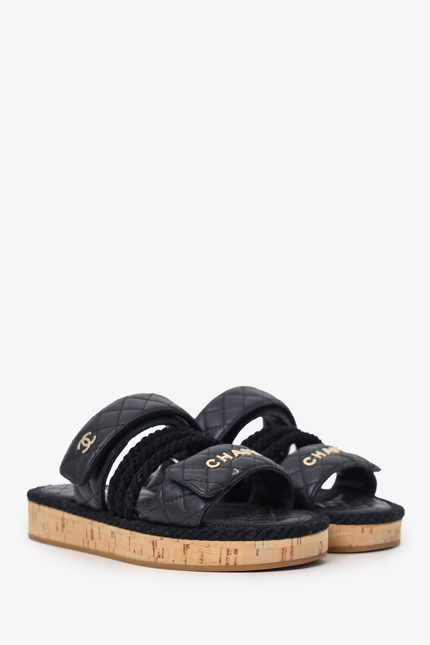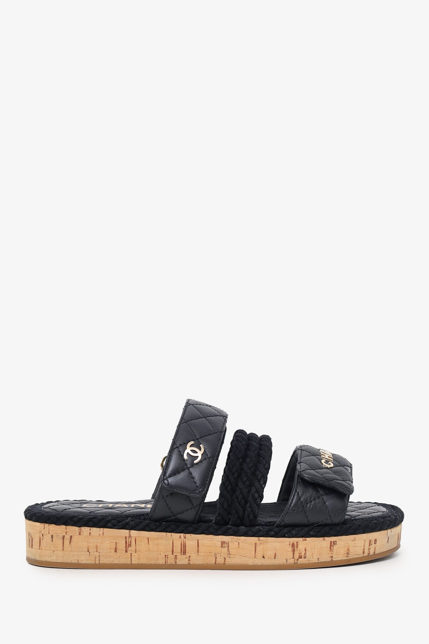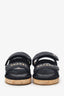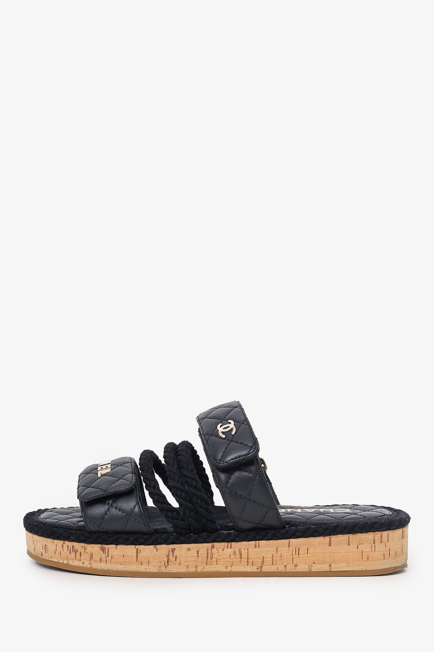 Pre-Loved Chanel™ Black Leather Quilted Rope CC Flat Sandals. Slip-on. Open round-toe. Two top adjustable velcro closure. Gold-tone hardware. Tonal stitching.