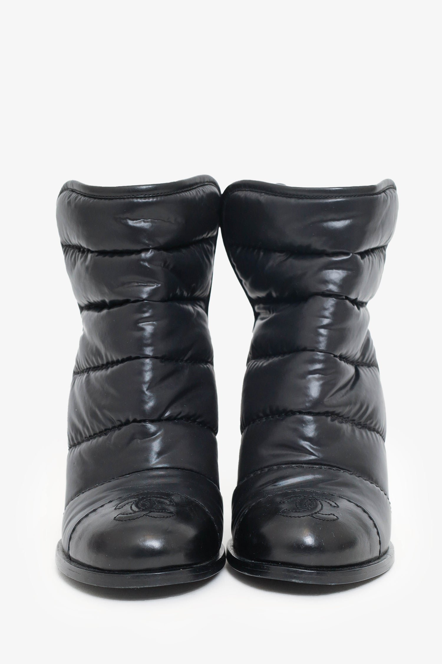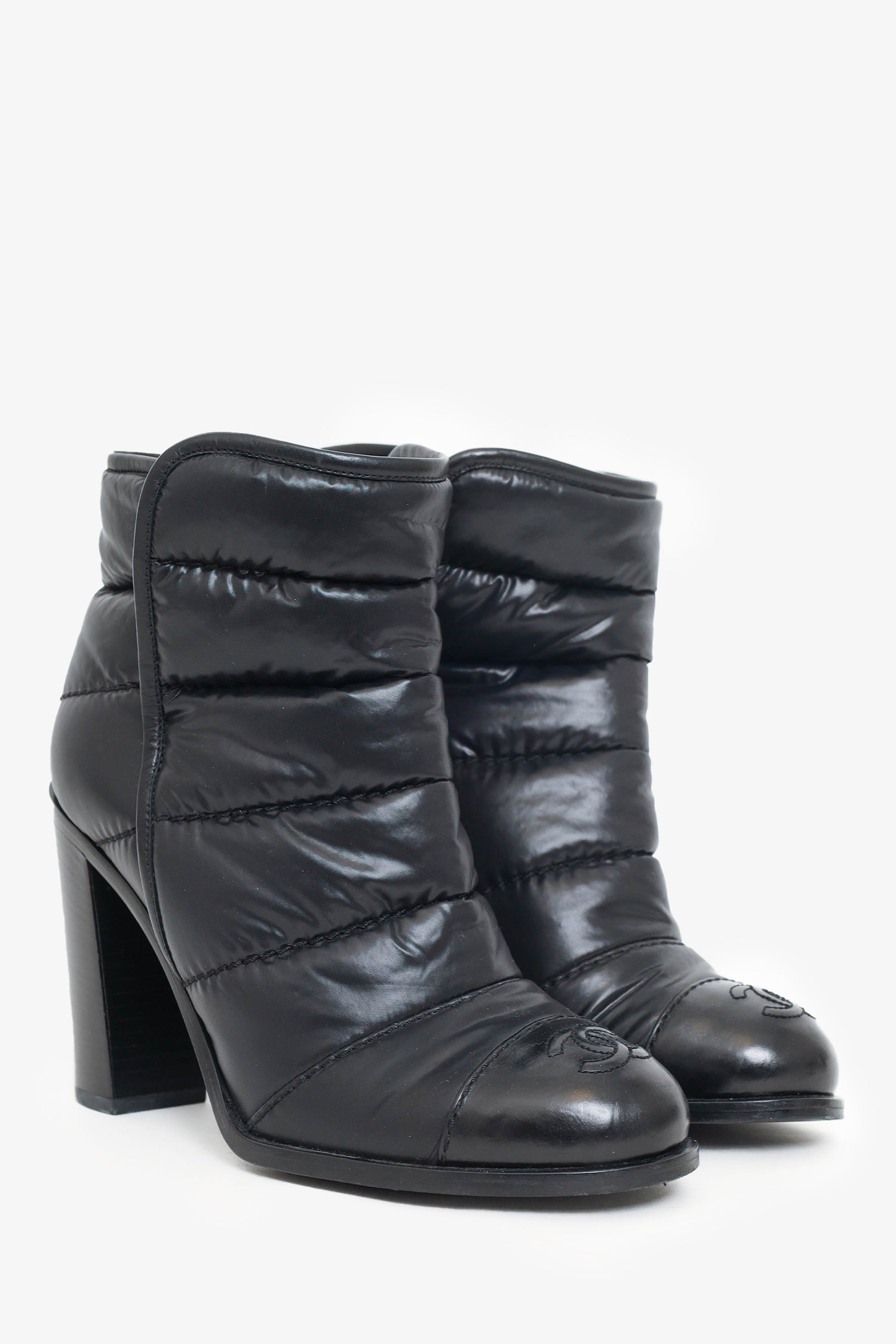 Refresh availabilityPre-Loved Chanel™ Black Nylon/Leather Quilted Cap Toe Ankle Boots. Pull-on. Round toe. Overlapping side slits. Logo on toe cap. Tonal stitching.