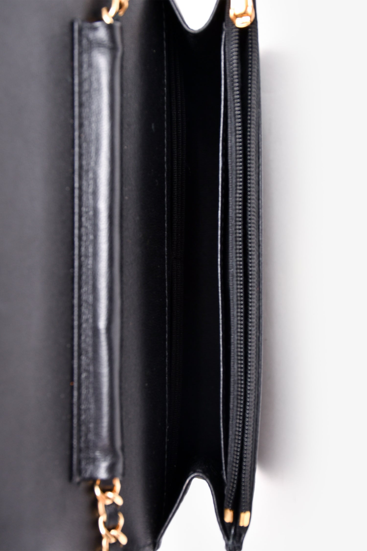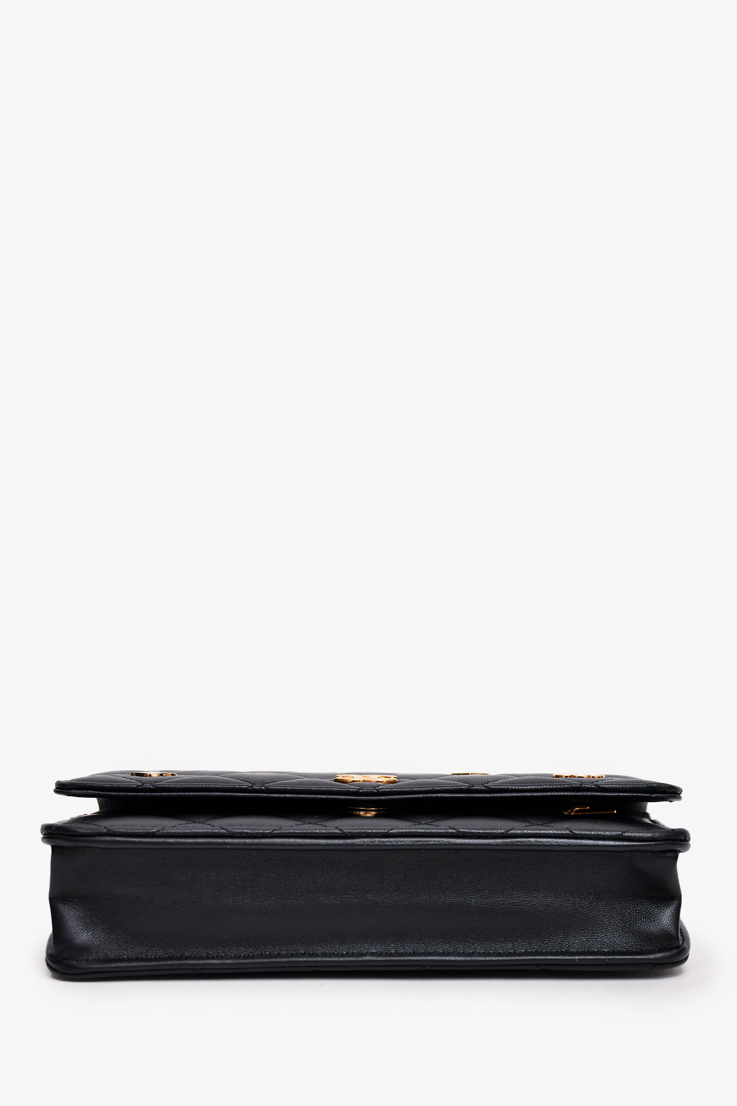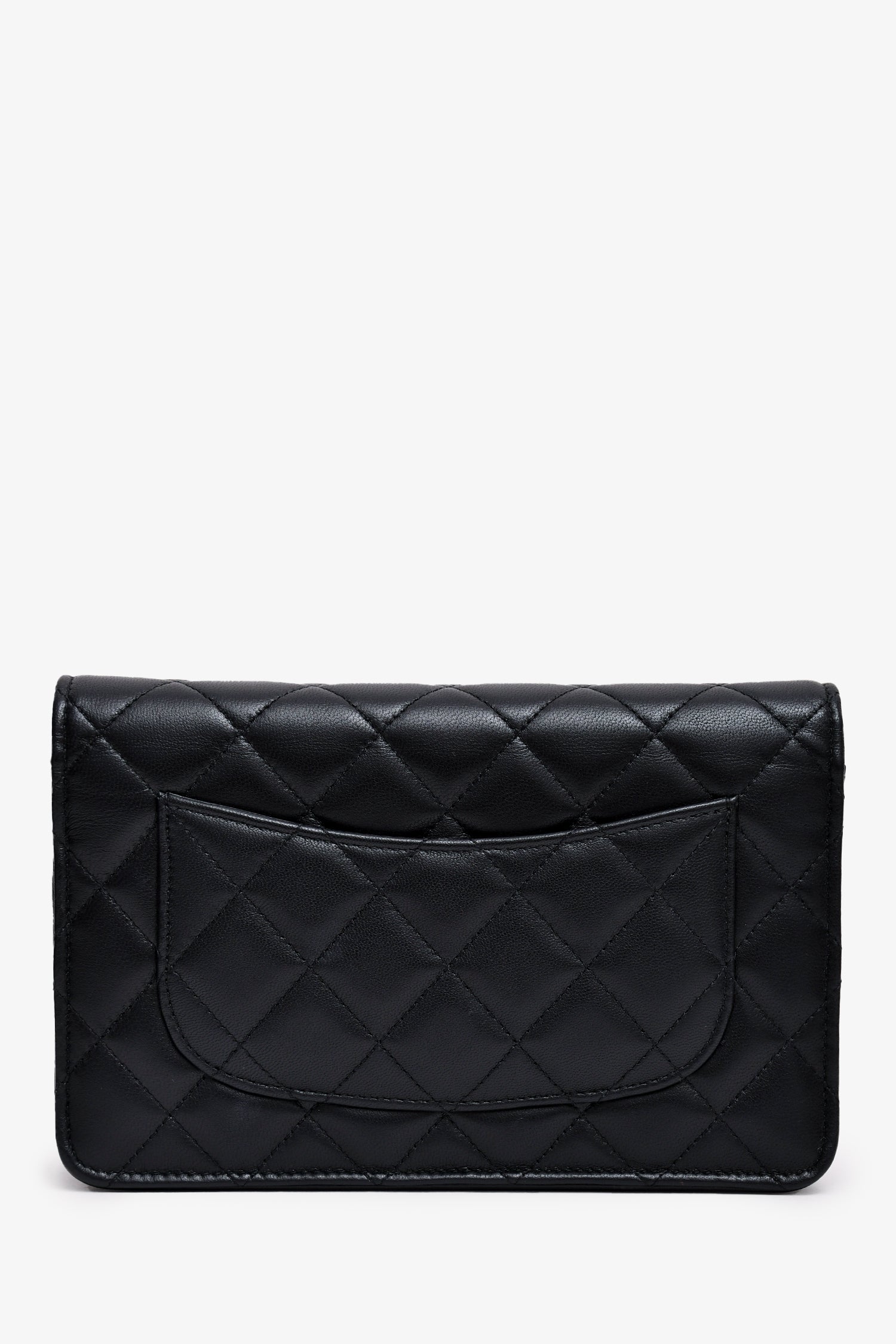 Pre-Loved Chanel™ Black Quilted Leather Coco Casino Wallet On Chain. Front fold-over flap with magnetic button closure. Front slip pocket. 6 card slots. Interior zip pocket on the interior of the front flap. 1 slip interior wall pocket. 1 zippered pocket. Gold-tone hardware. Outer rear slip pocket.