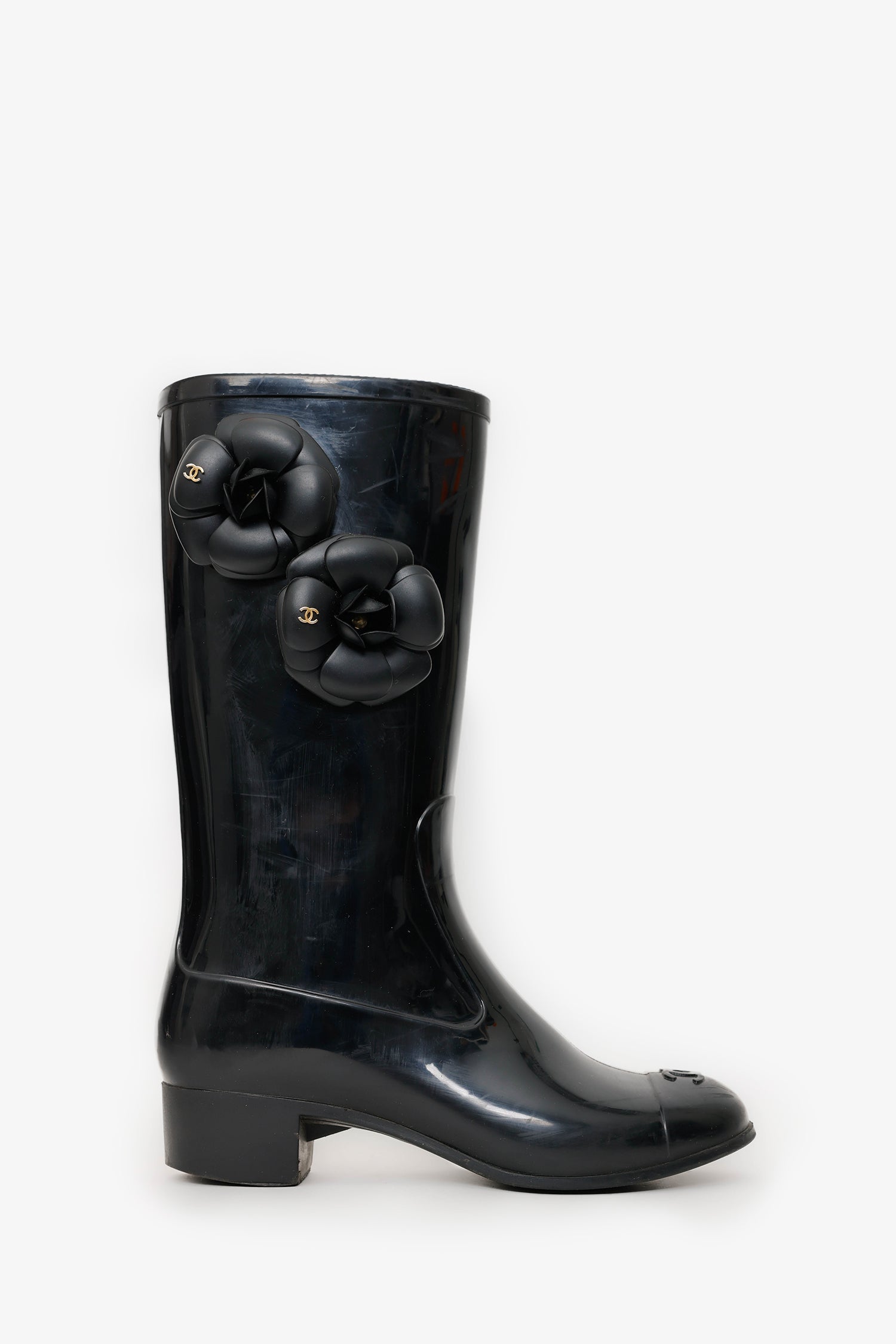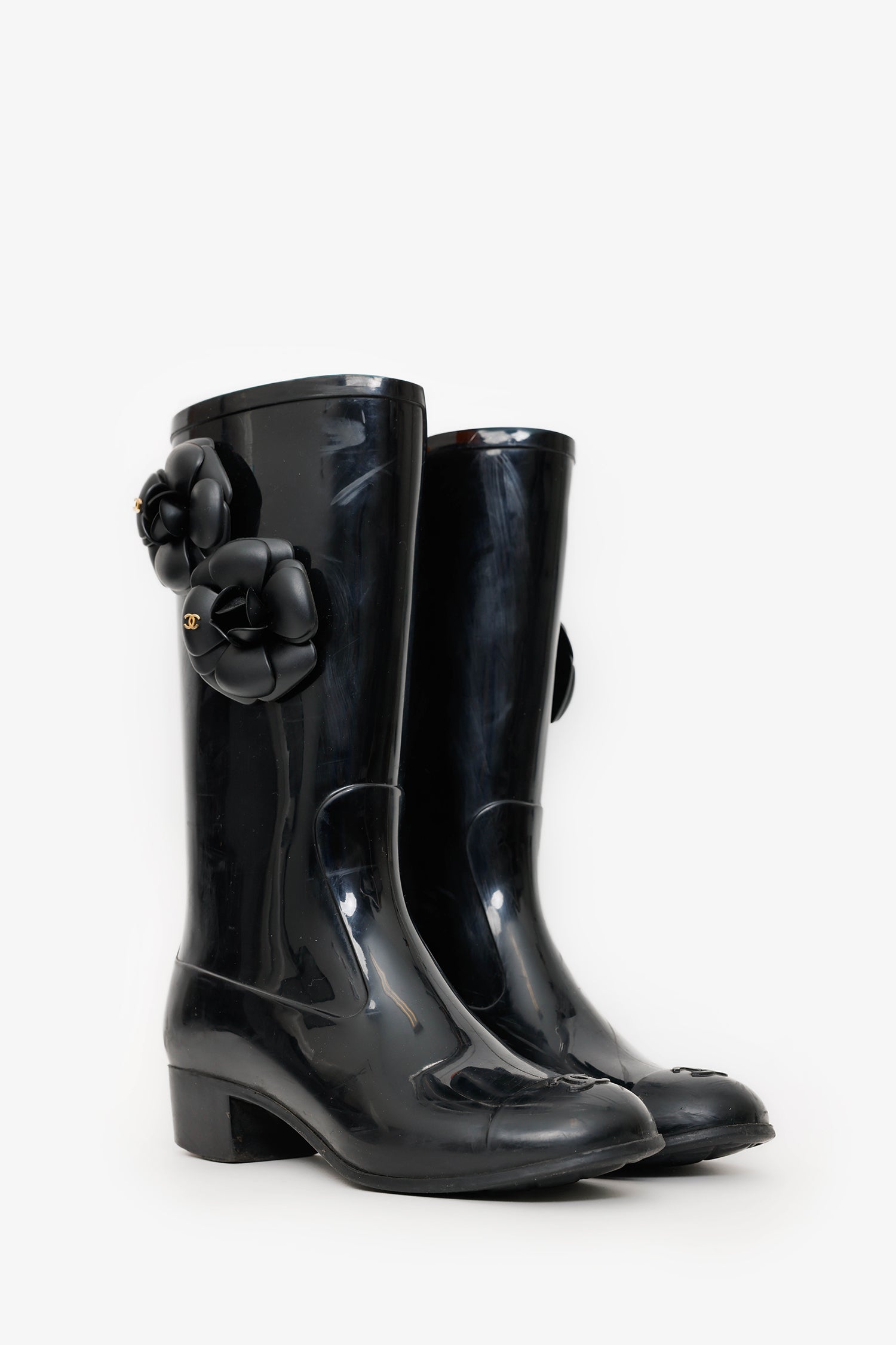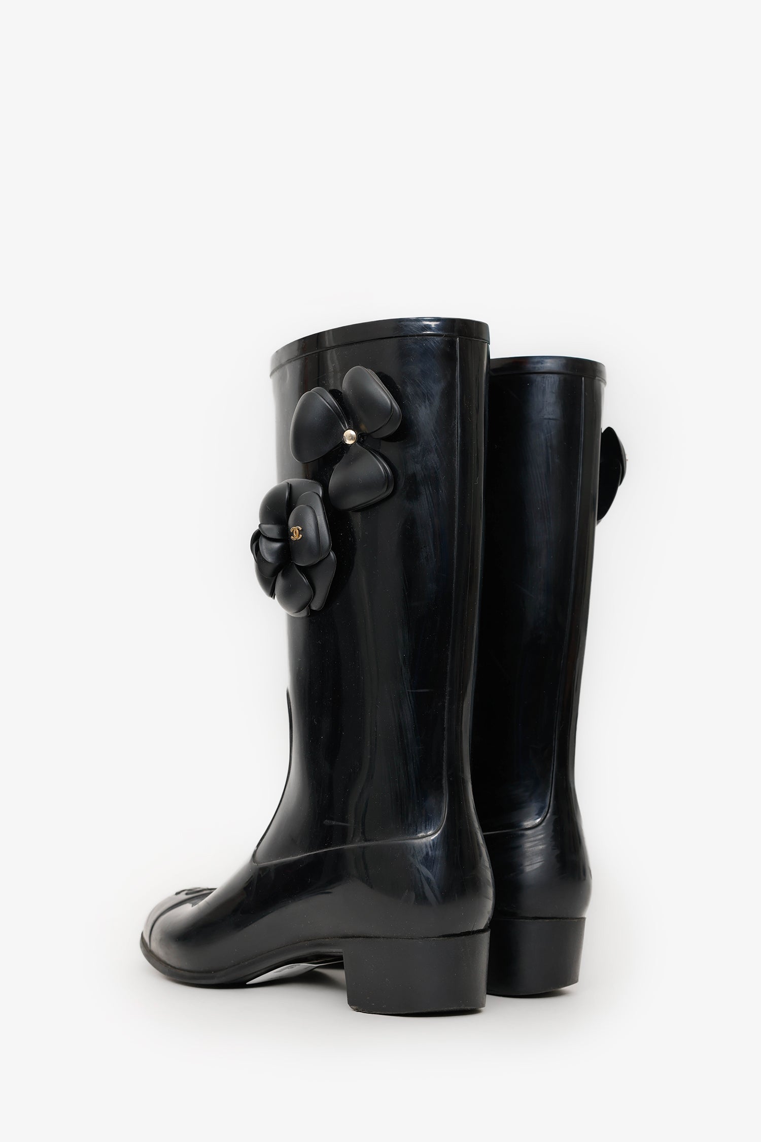 Refresh availabilityPre-Loved Chanel™ Black Rubber Camellia Flower Rain Boots. Round toe. Block heel. Gold-tone hardware. Tonal stitching.