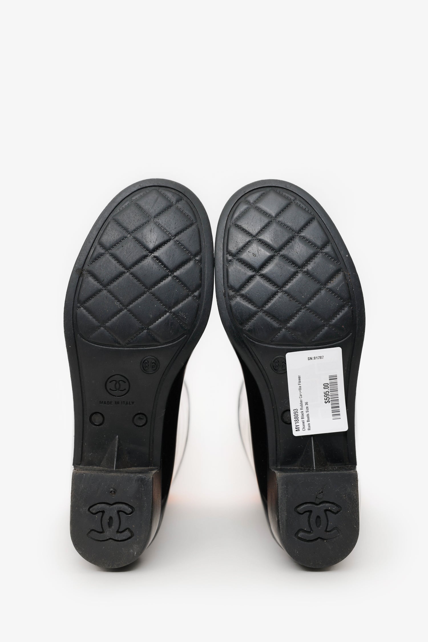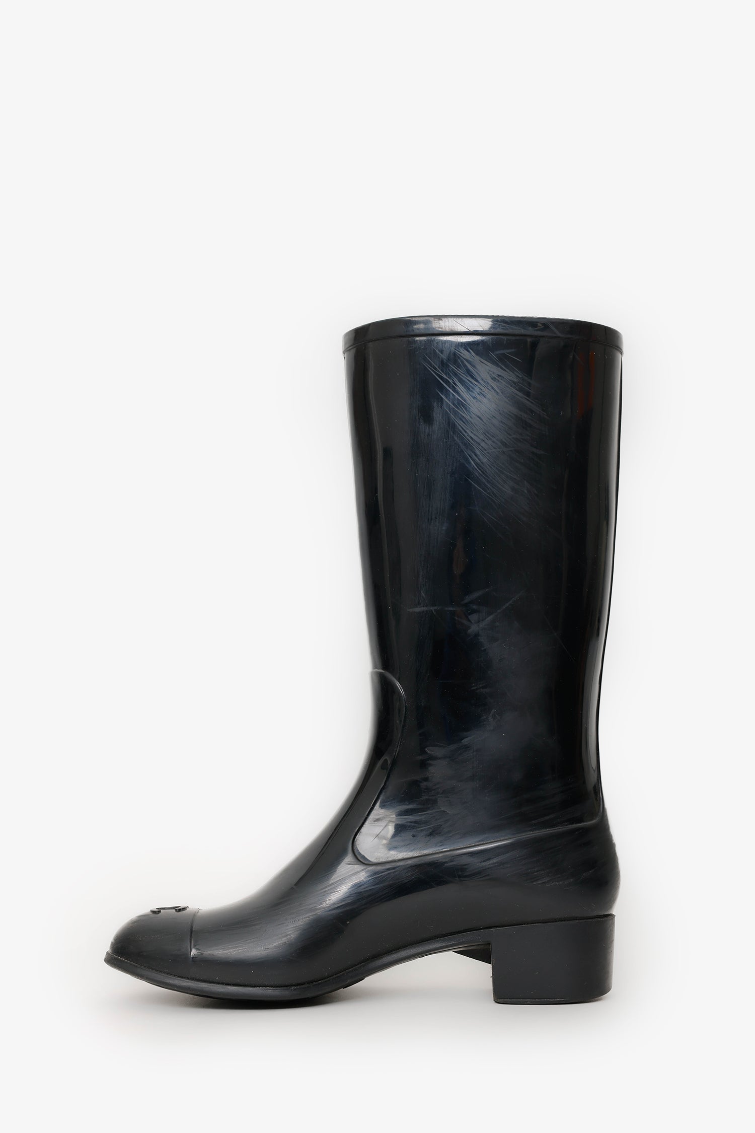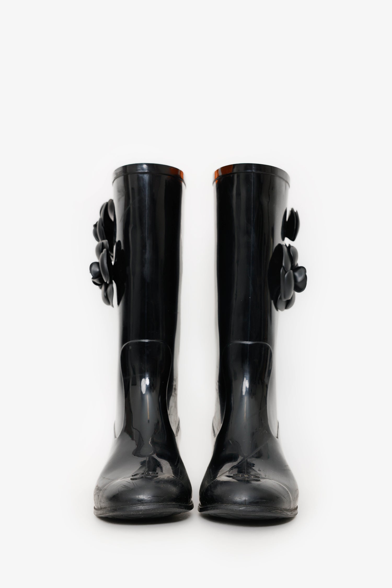 Refresh availabilityPre-Loved Chanel™ Black Rubber Camellia Flower Rain Boots. Round toe. Block heel. Gold-tone hardware. Tonal stitching.