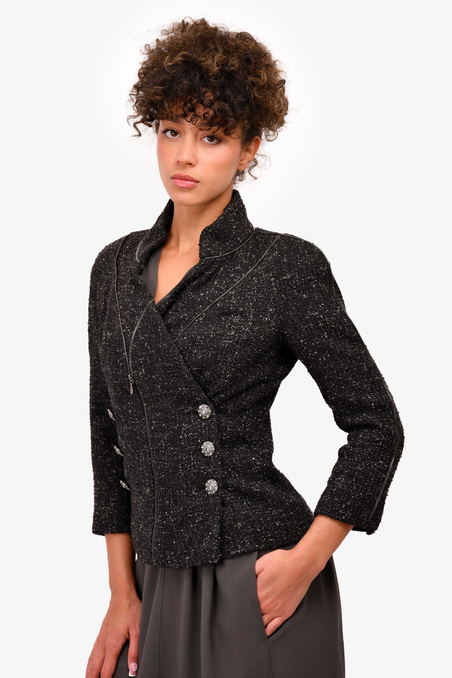 Refresh availabilityPre-Loved Chanel™ Black Silk/Tweed Crystal Button Zip-Up Blazer. Lined. Front button-up closure.