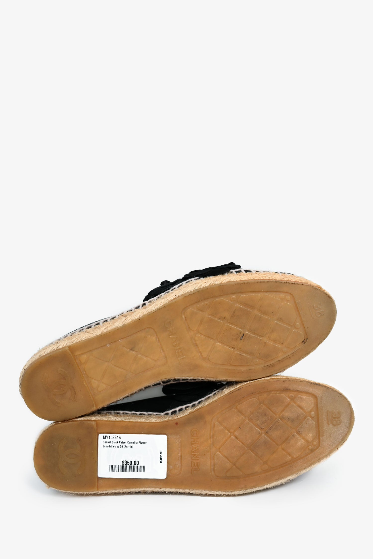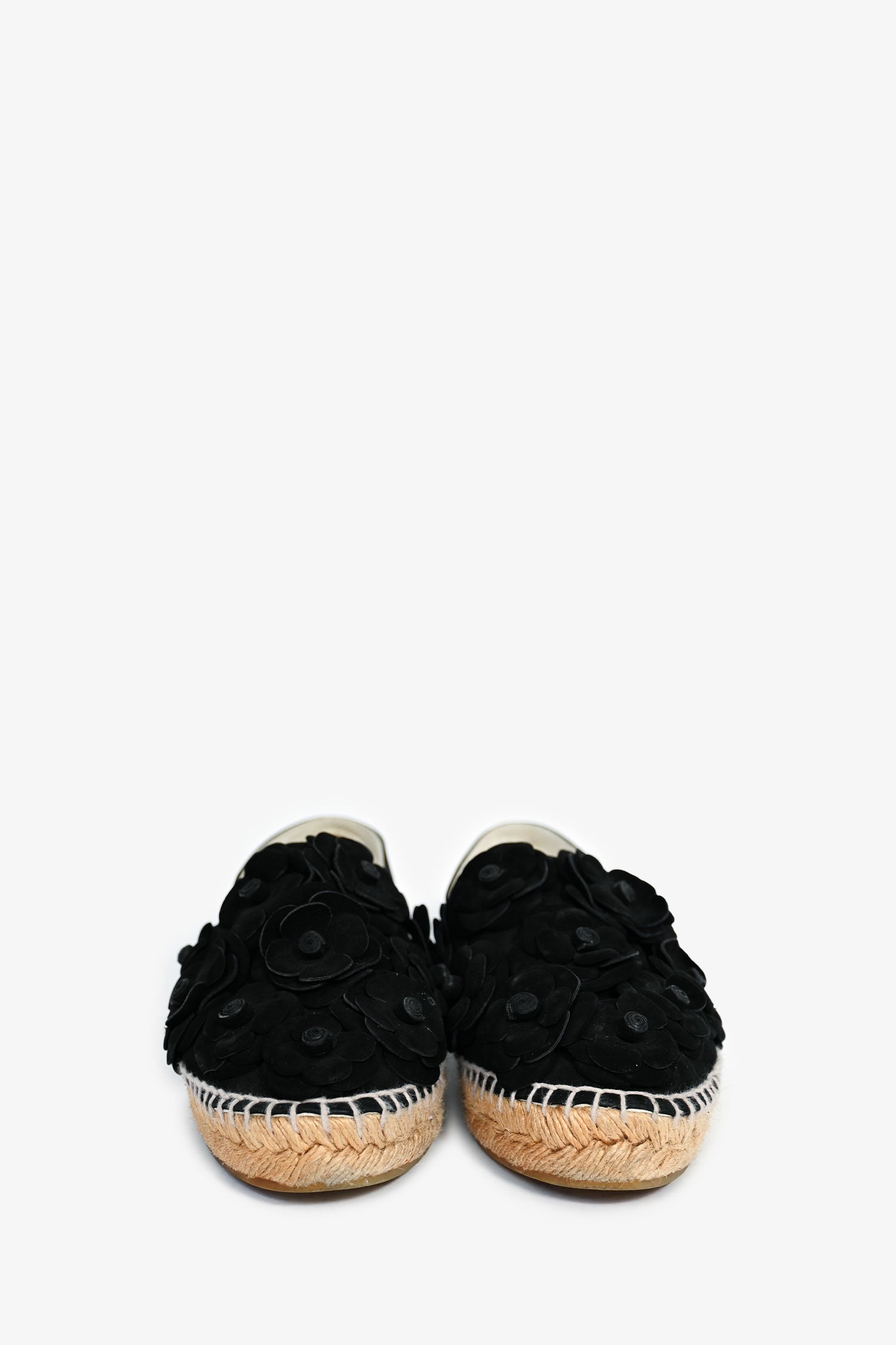 Refresh availabilityPre-Loved Chanel™ Black Velvet Camellia Flower Espadrilles. Almond toe. Slip-on. Flower leather details. Silver-tone hardware. Tonal stitching.
