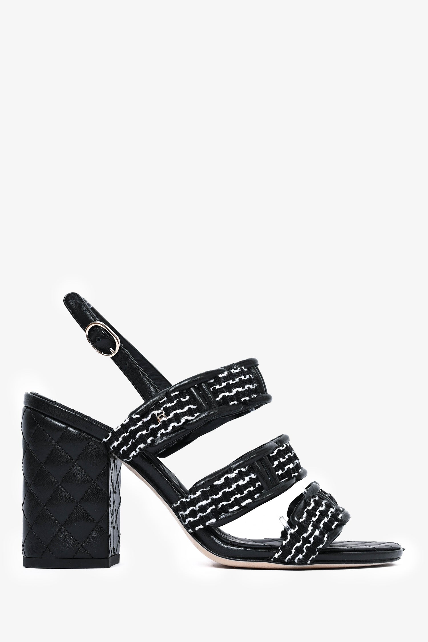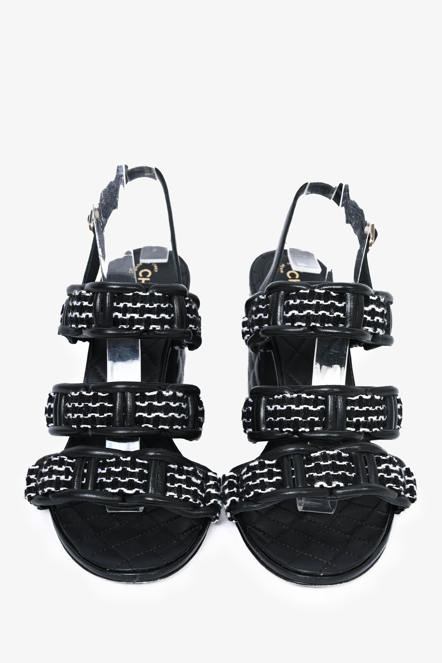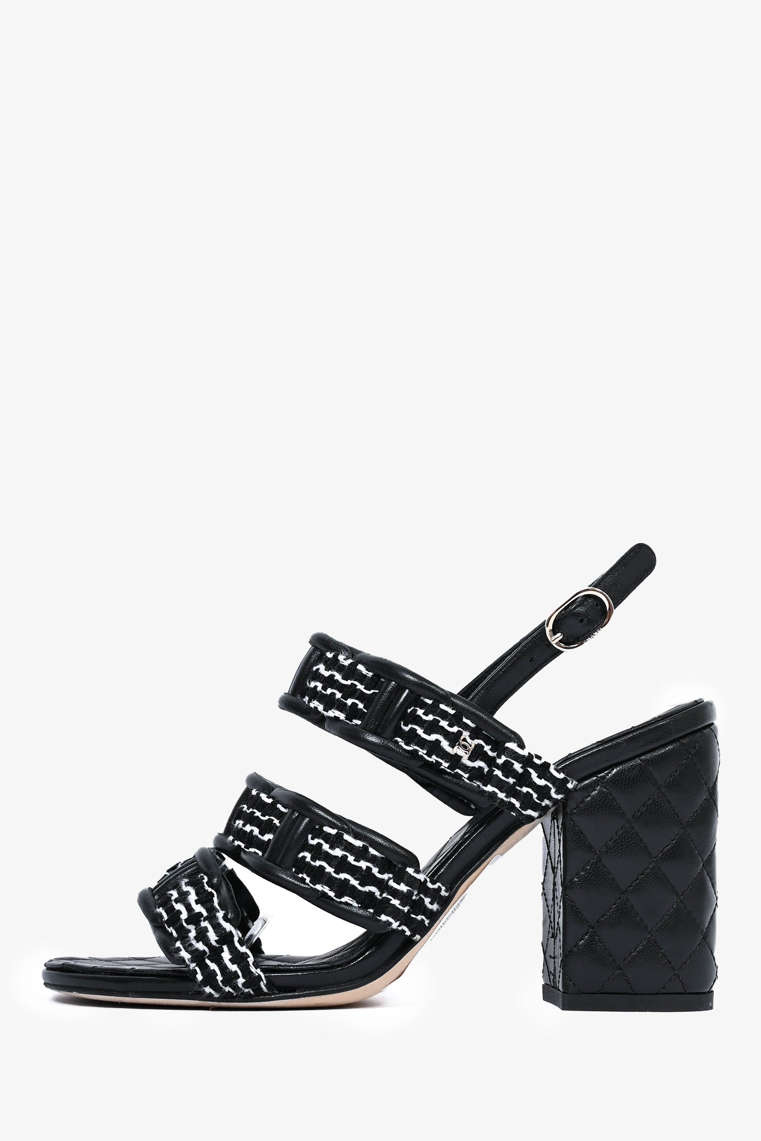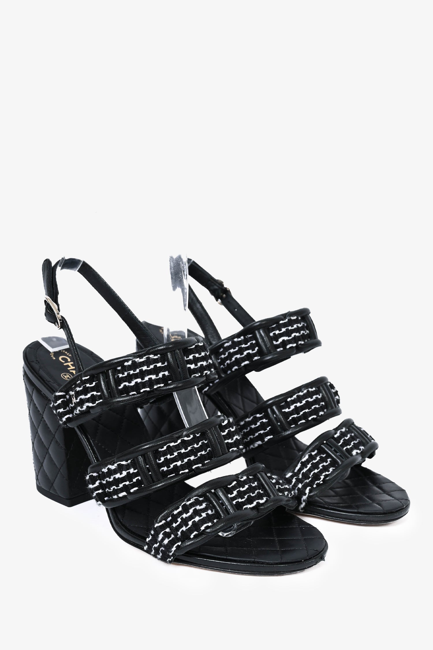 Refresh availabilityPre-Loved Chanel™ Black/White Leather/Tweed Quilted Block Heels. "CC" hardware on outer edge of top strap. Adjustable ankle strap. Gold-tone hardware. Tonal stitching.