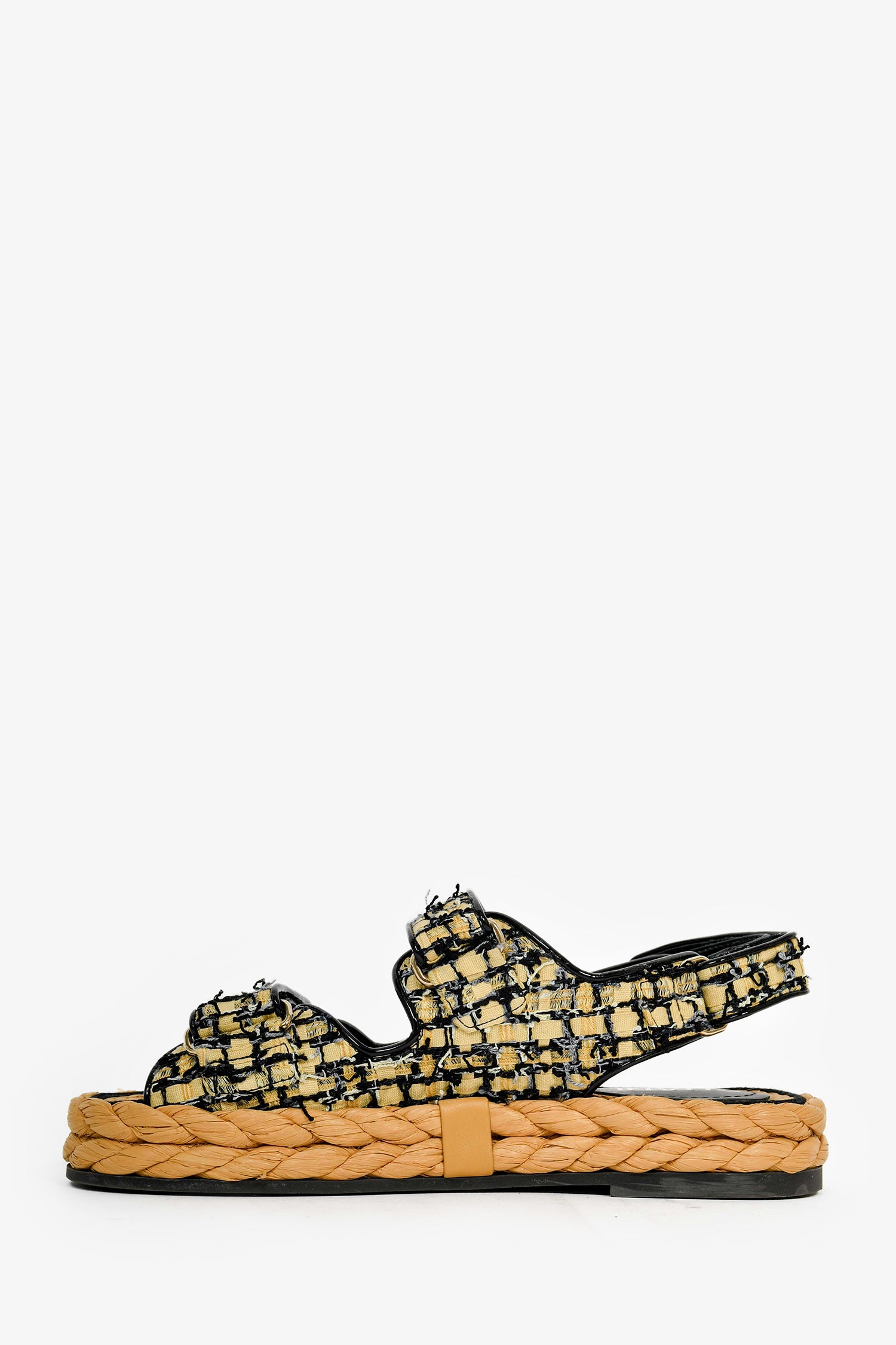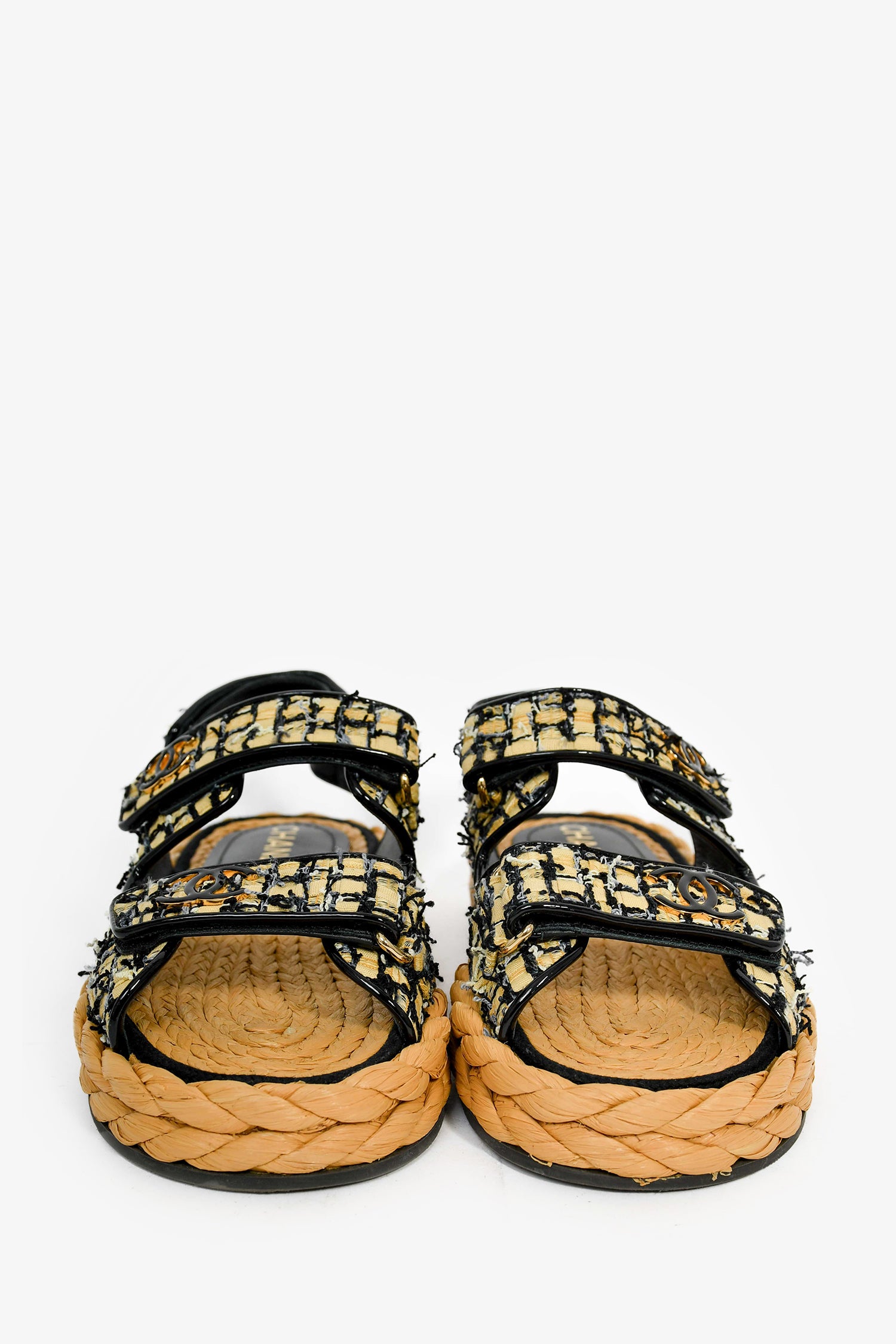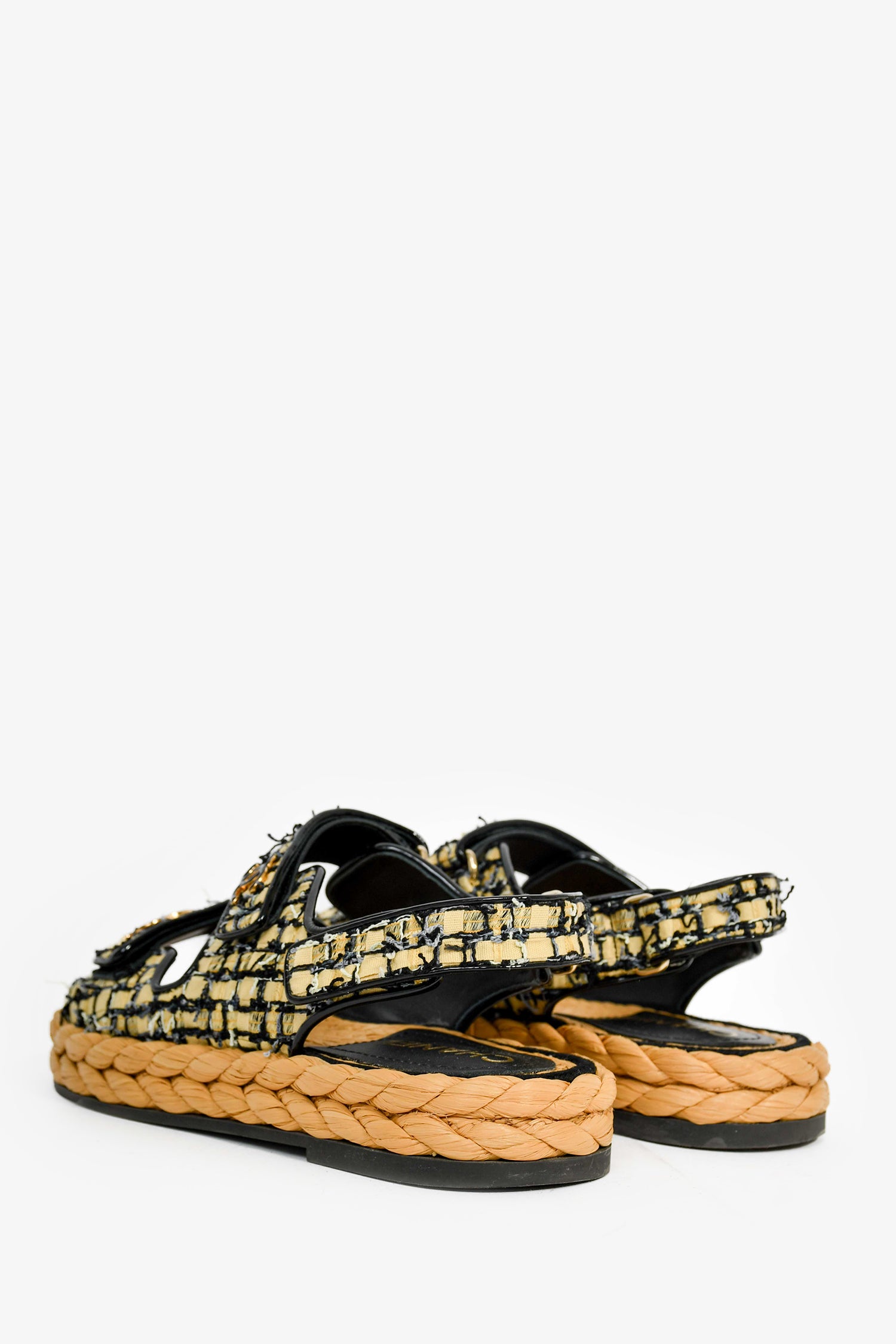 Refresh availabilityPre-Loved Chanel™ Black/Yellow Tweed CC Braided Dad Sandals. Open toe. Top strap with velcro closures. Gold-tone hardware.