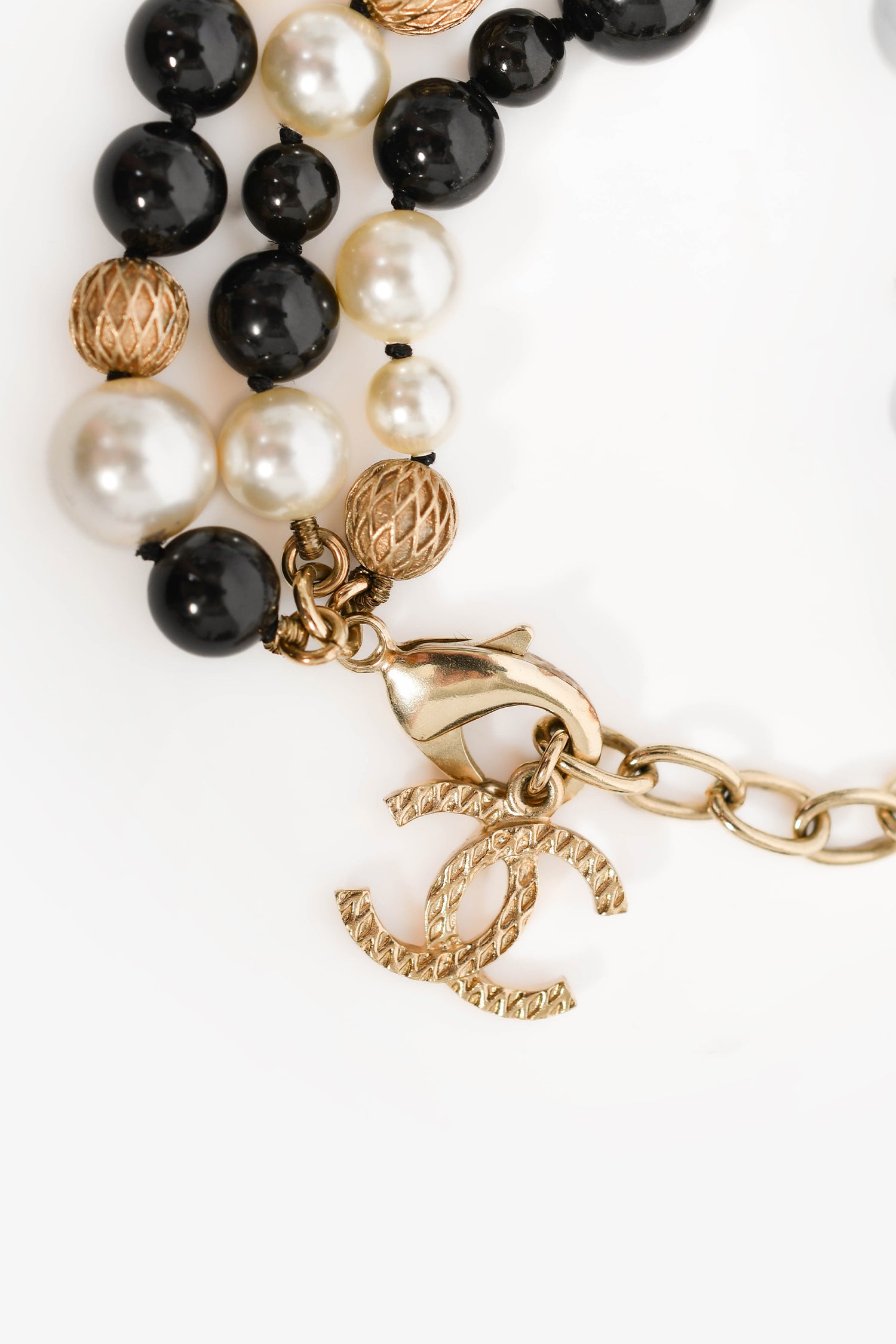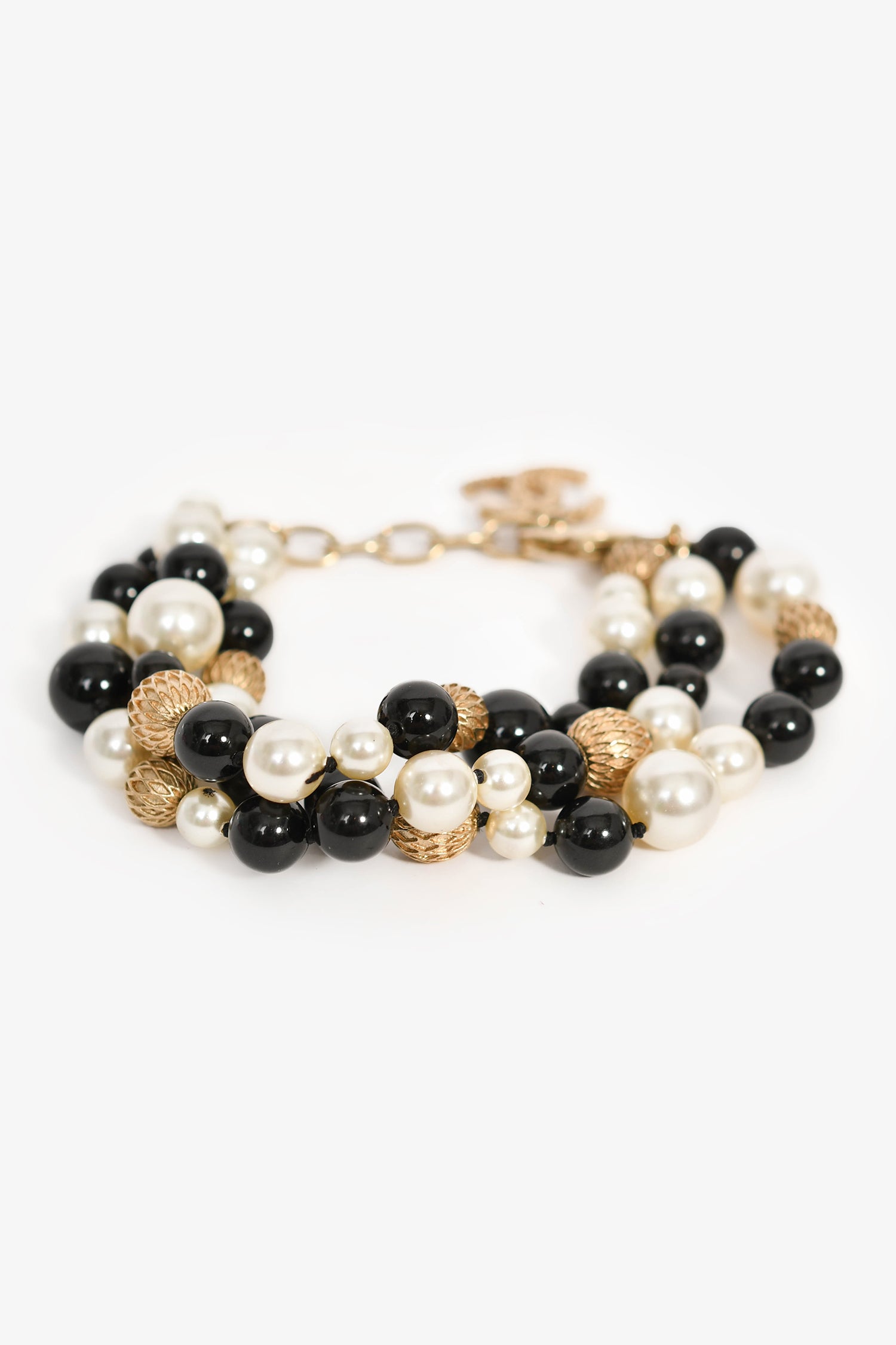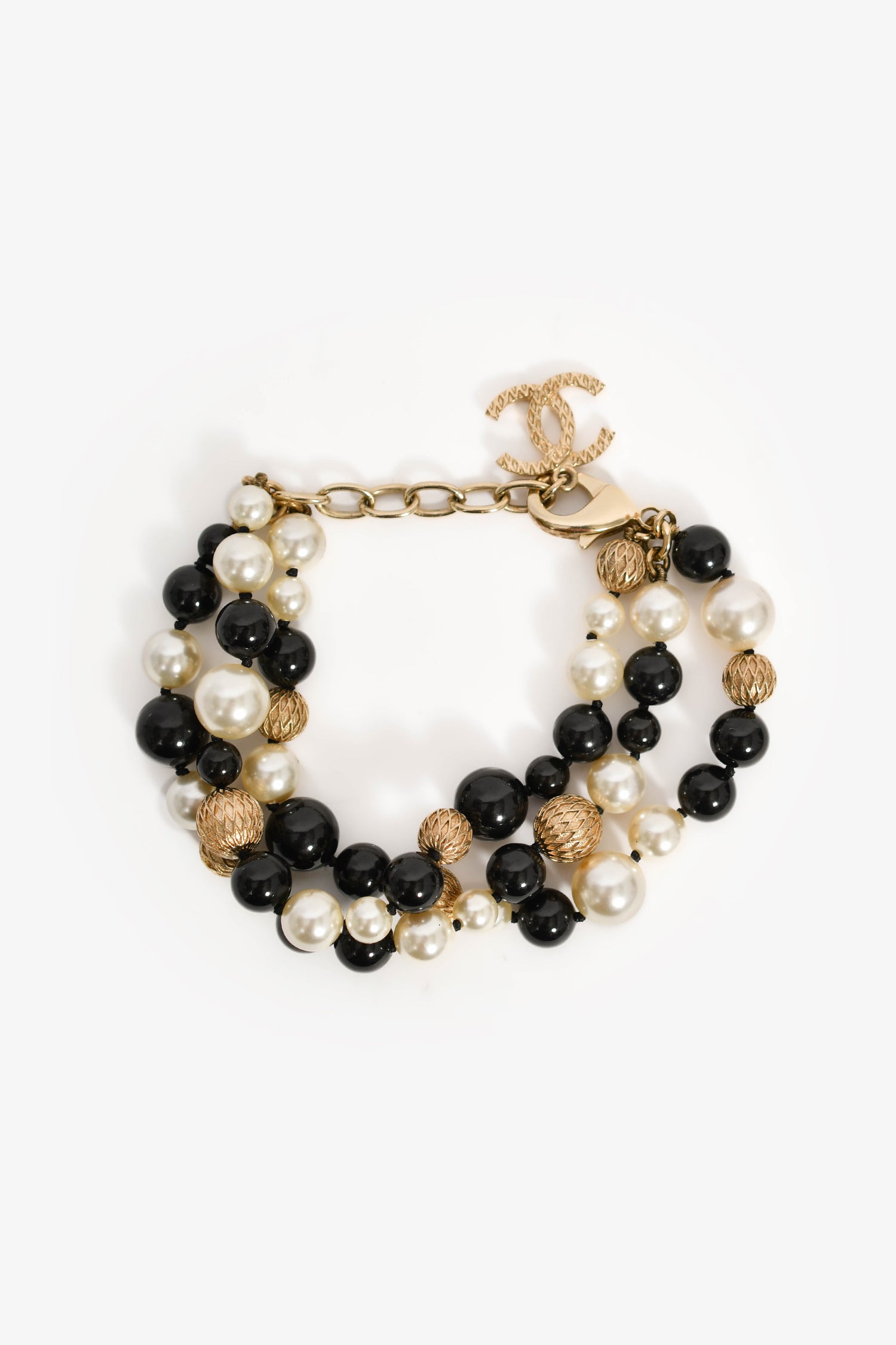 Refresh availabilityPre-Loved Chanel™ Black/White/Gold Toned Faux Pearl Beaded CC Logo Triple Strand Bracelet. Chain-link with 'CC' charm. Lobster clasp closure.