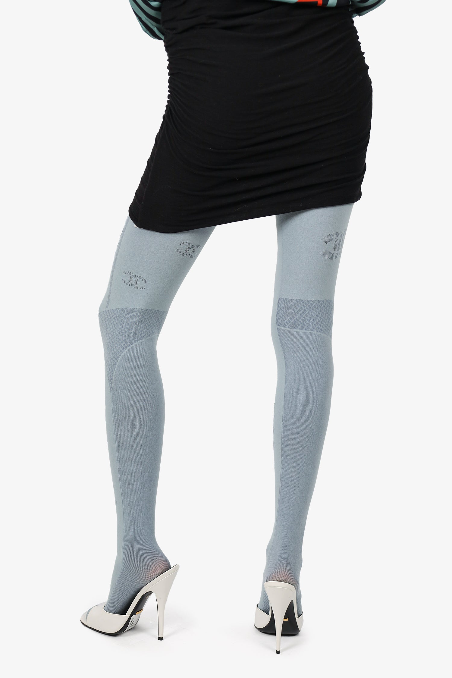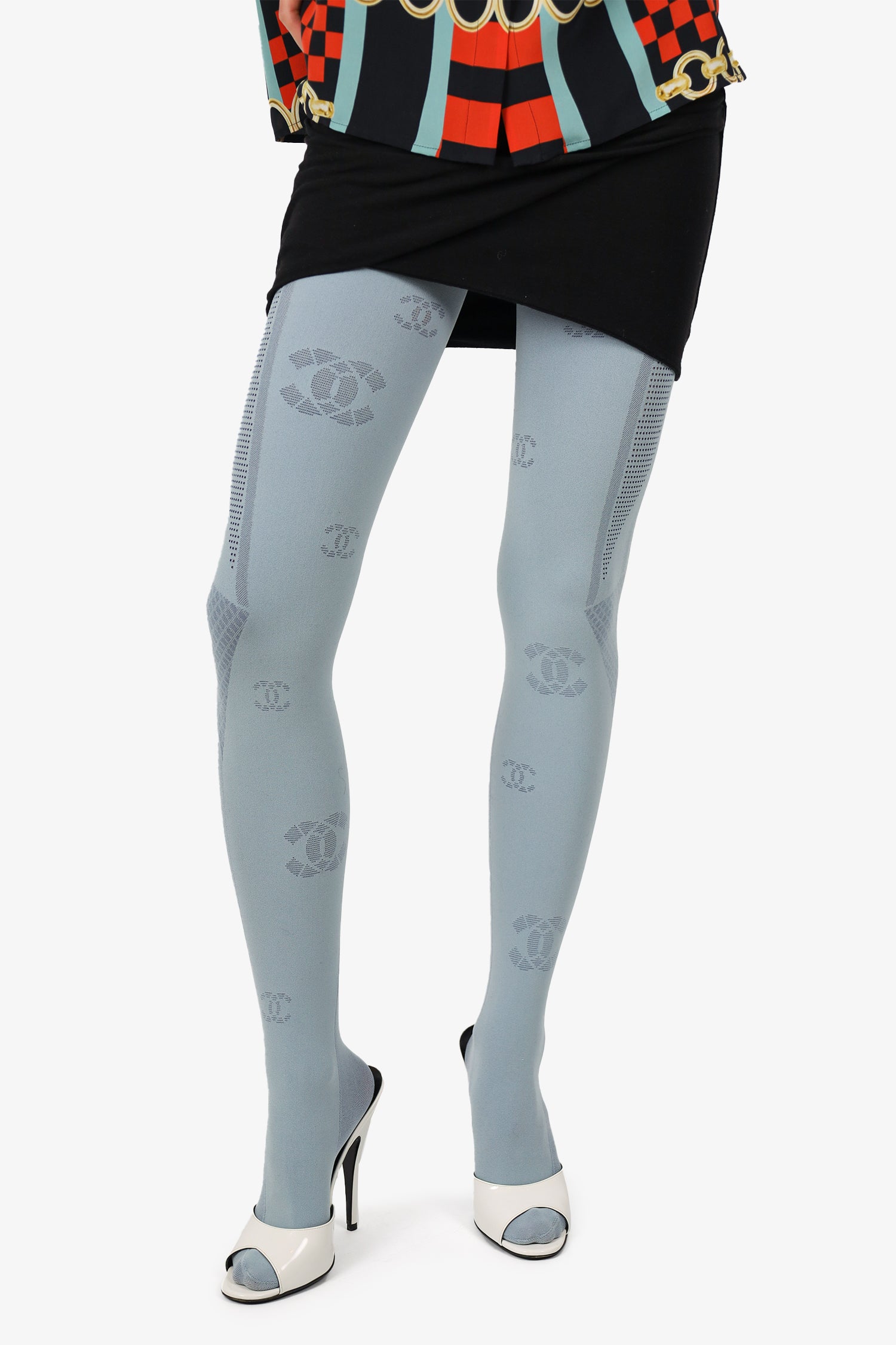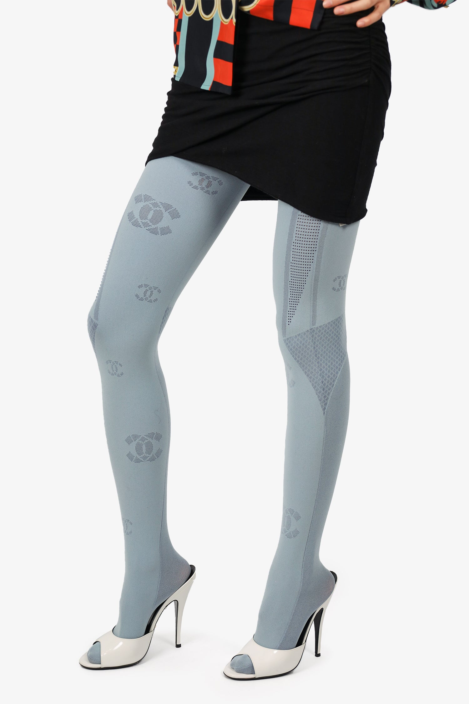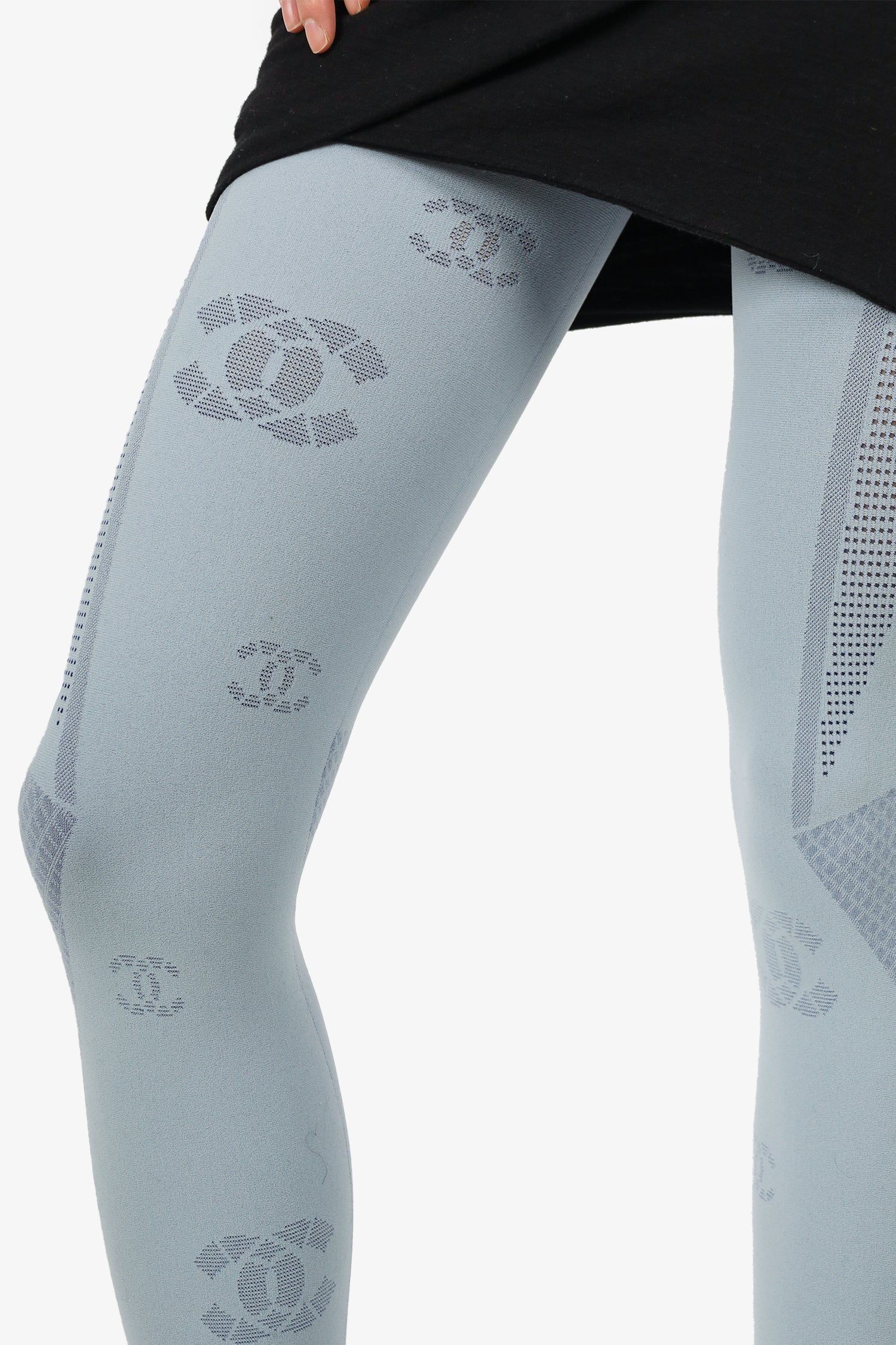 Refresh availabilityPre-Loved Chanel™ Blue CC logo Leggings. Pull-on. Elasticated waistband. Chanel charm on waistband. Full-footed. Partially see-through panels along each side. Silver-tone hardware. Tonal stitching.
