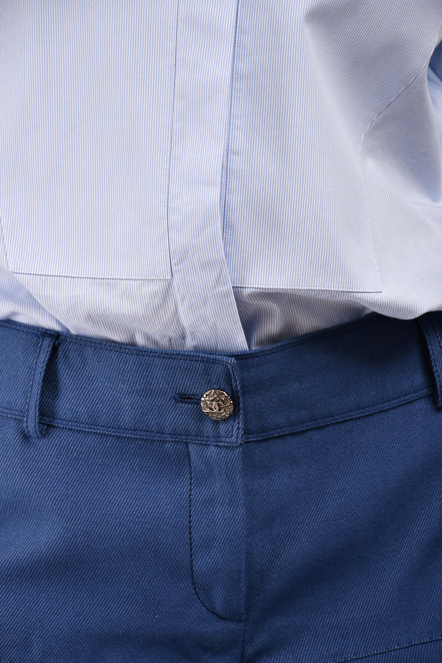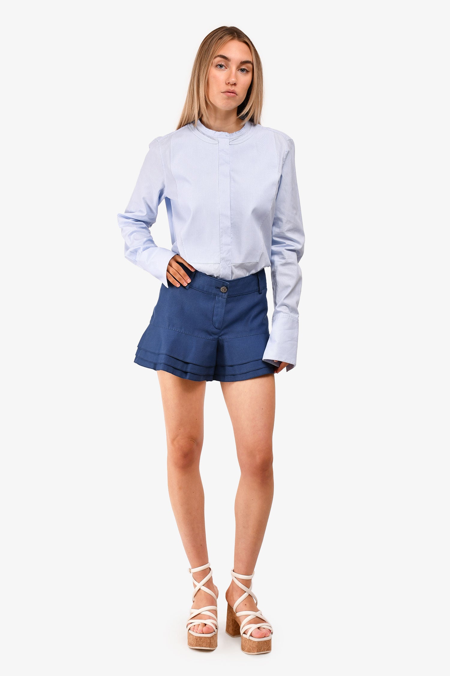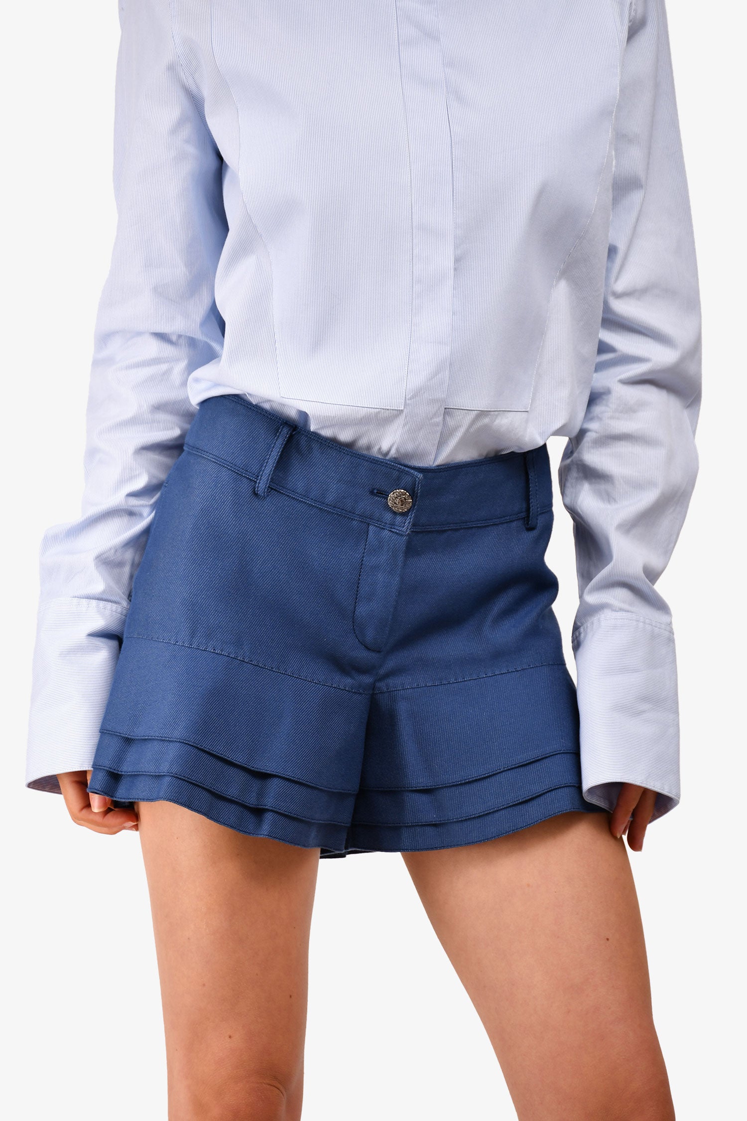 Pre-Loved Chanel™ Blue Denim CC Ruffle Shorts. Front zip and button closure. Waist belt loops. Silver-tone hardware. Tonal stitching.