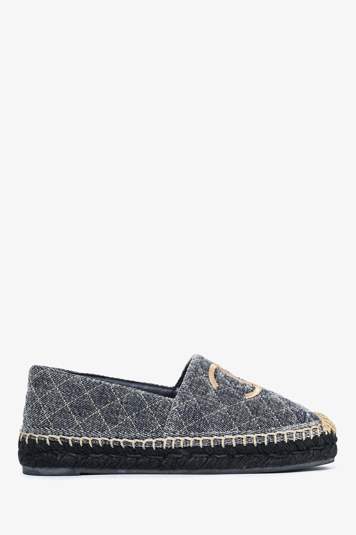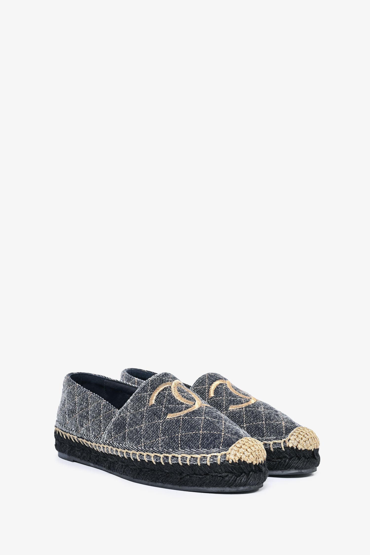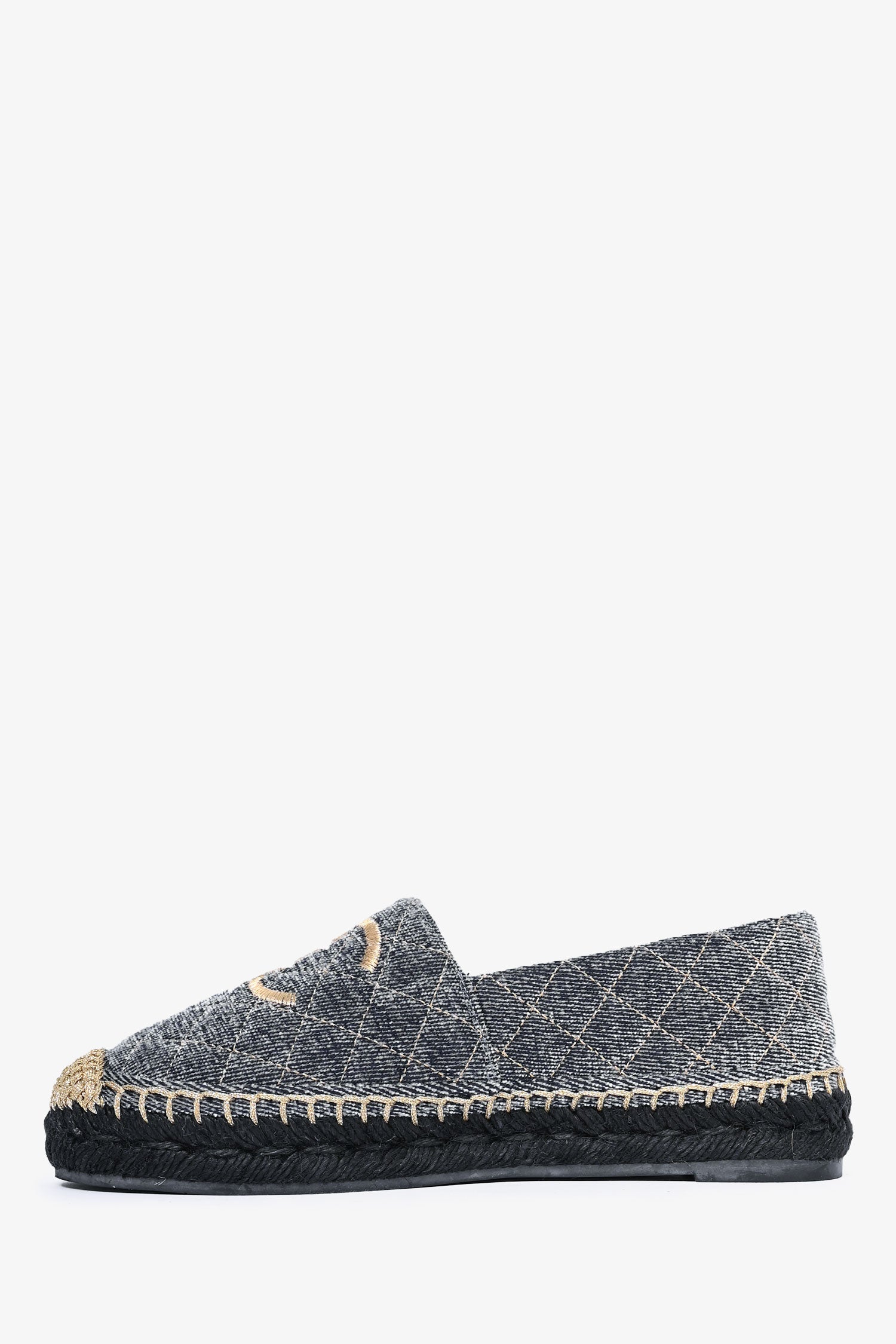 Refresh availabilityPre-Loved Chanel™ Blue/Gold Velvet CC Espadrilles. Round toe. Gold-foil topstitching. Leather lined insole. Rubber outsole.