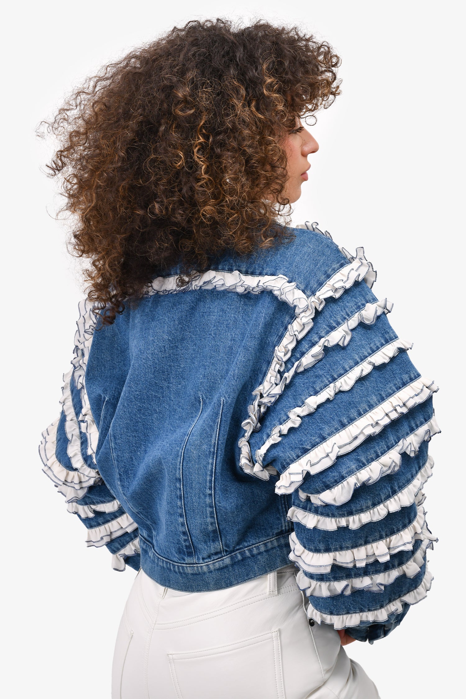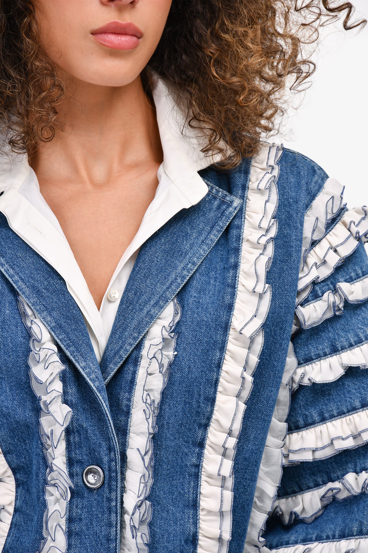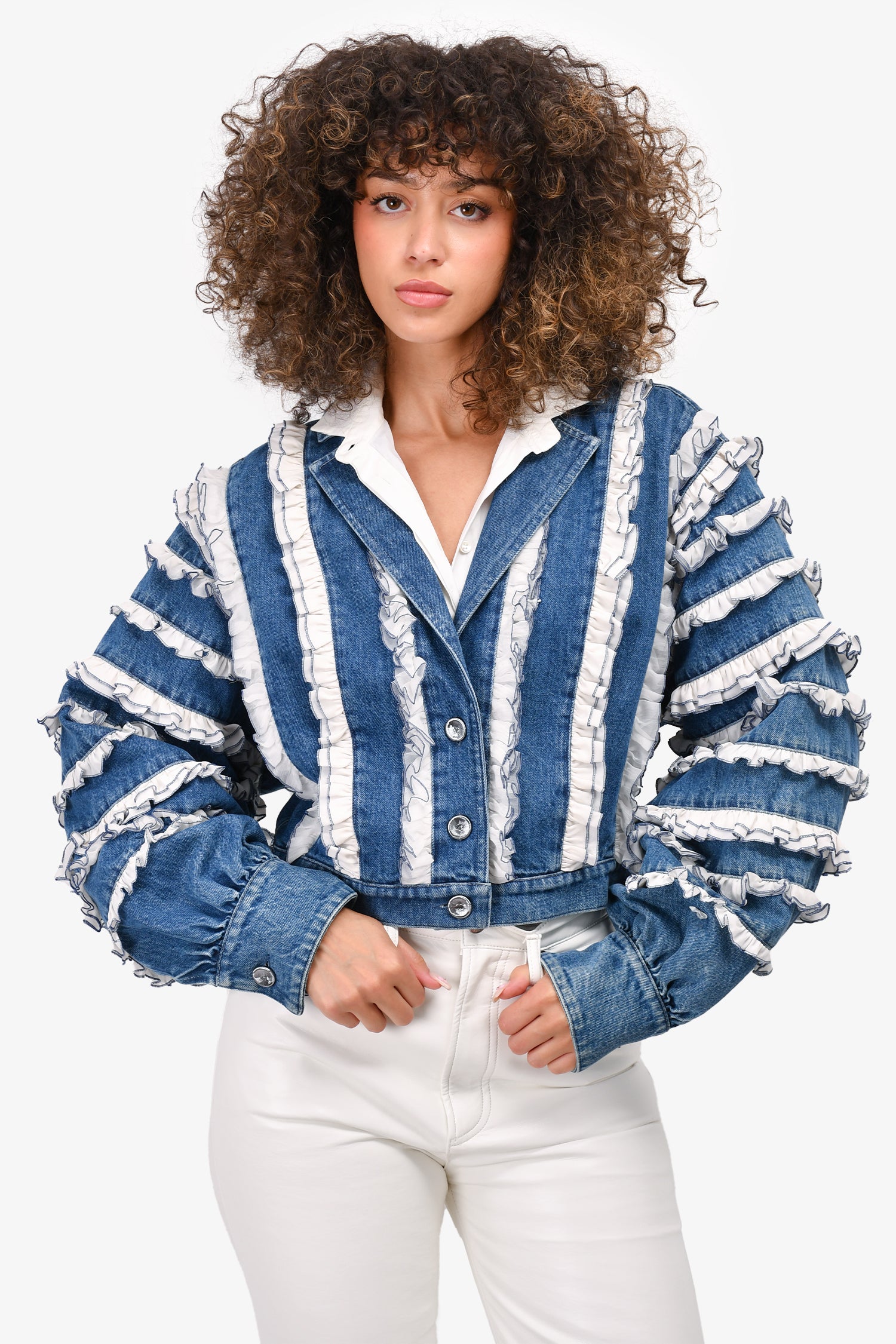 Refresh availabilityPre-Loved Chanel™ Blue/White Denim/Silk Ruffle Detail Jacket. Front button-up closure. V-neck. Front pockets. Button closure on the cuffs. Unlined.