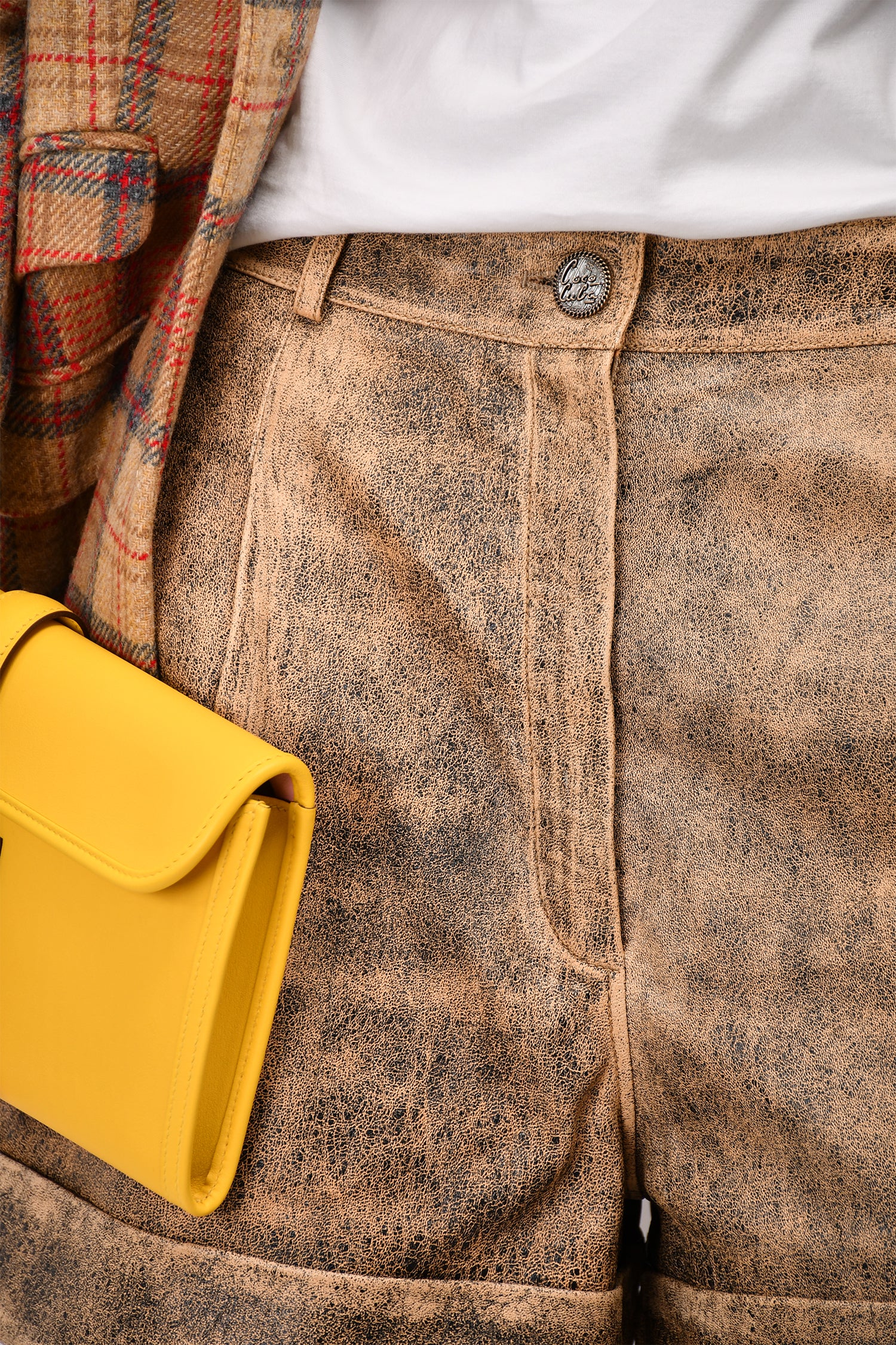 Refresh availabilityPre-Loved Chanel™ Brown/Black Lambskin Leather 'Coco Cuba' Shorts. Front zip and button closure. Front and rear pockets. Waist belt loops. Lined.