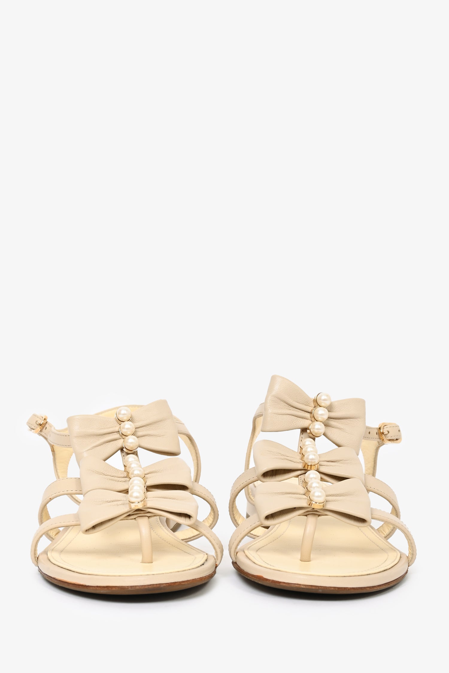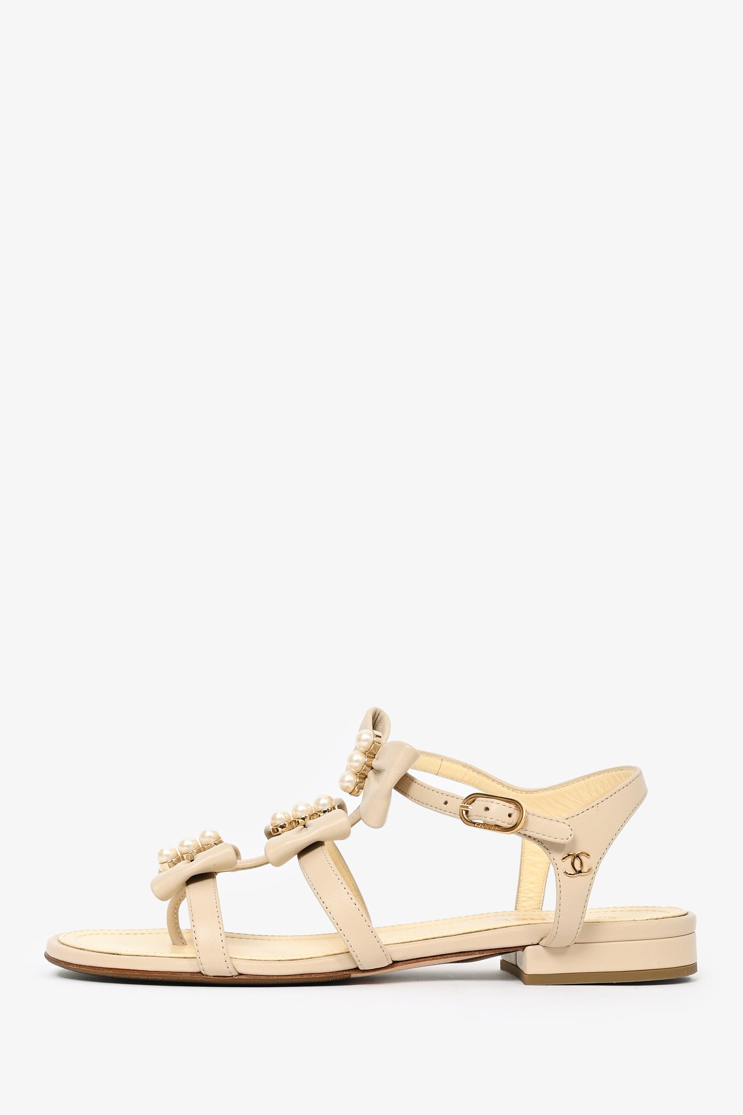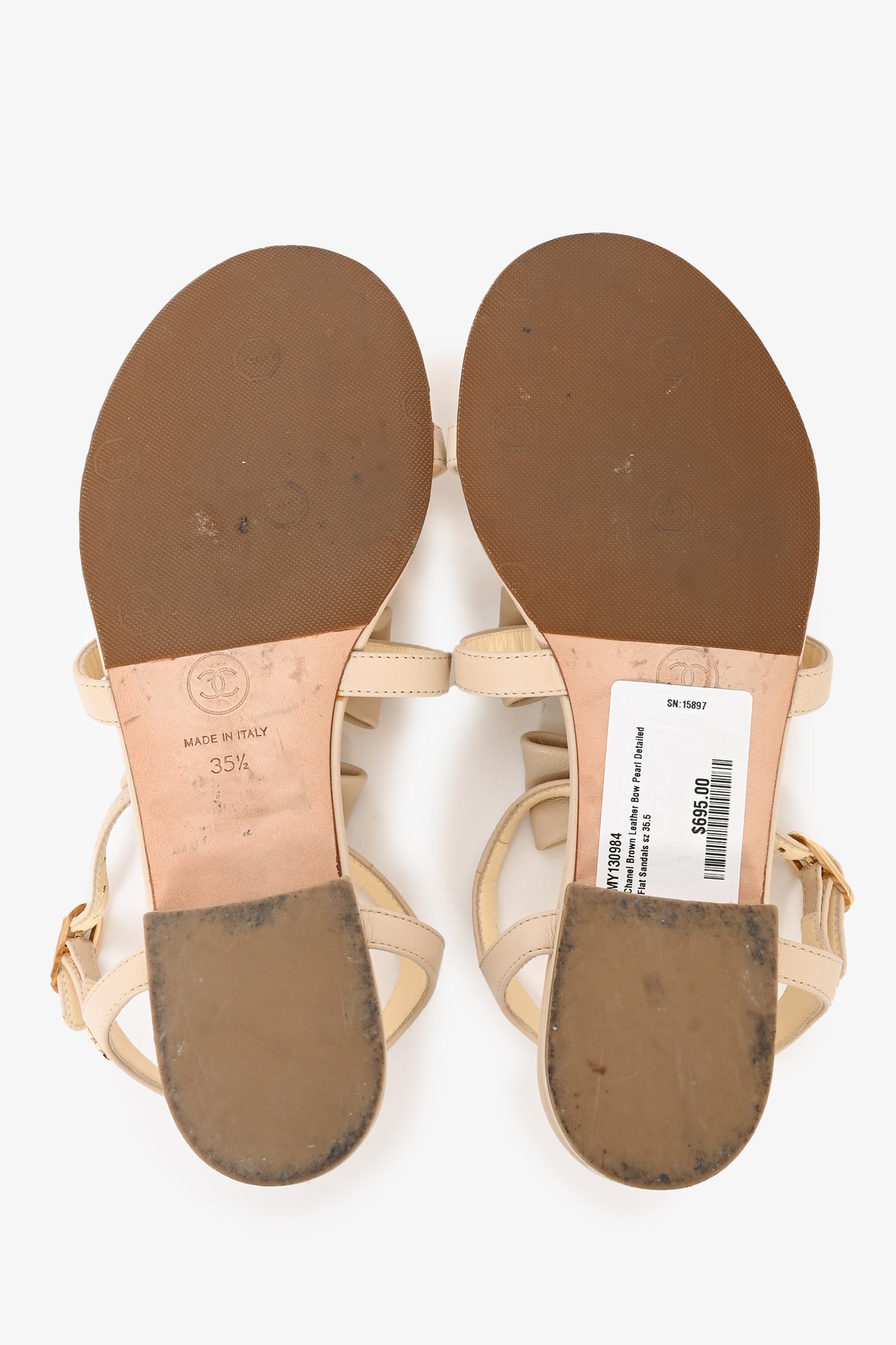 Pre-Loved Chanel™ Cream Leather Bow Pearl Detailed Flat Sandals Size 35.5