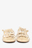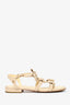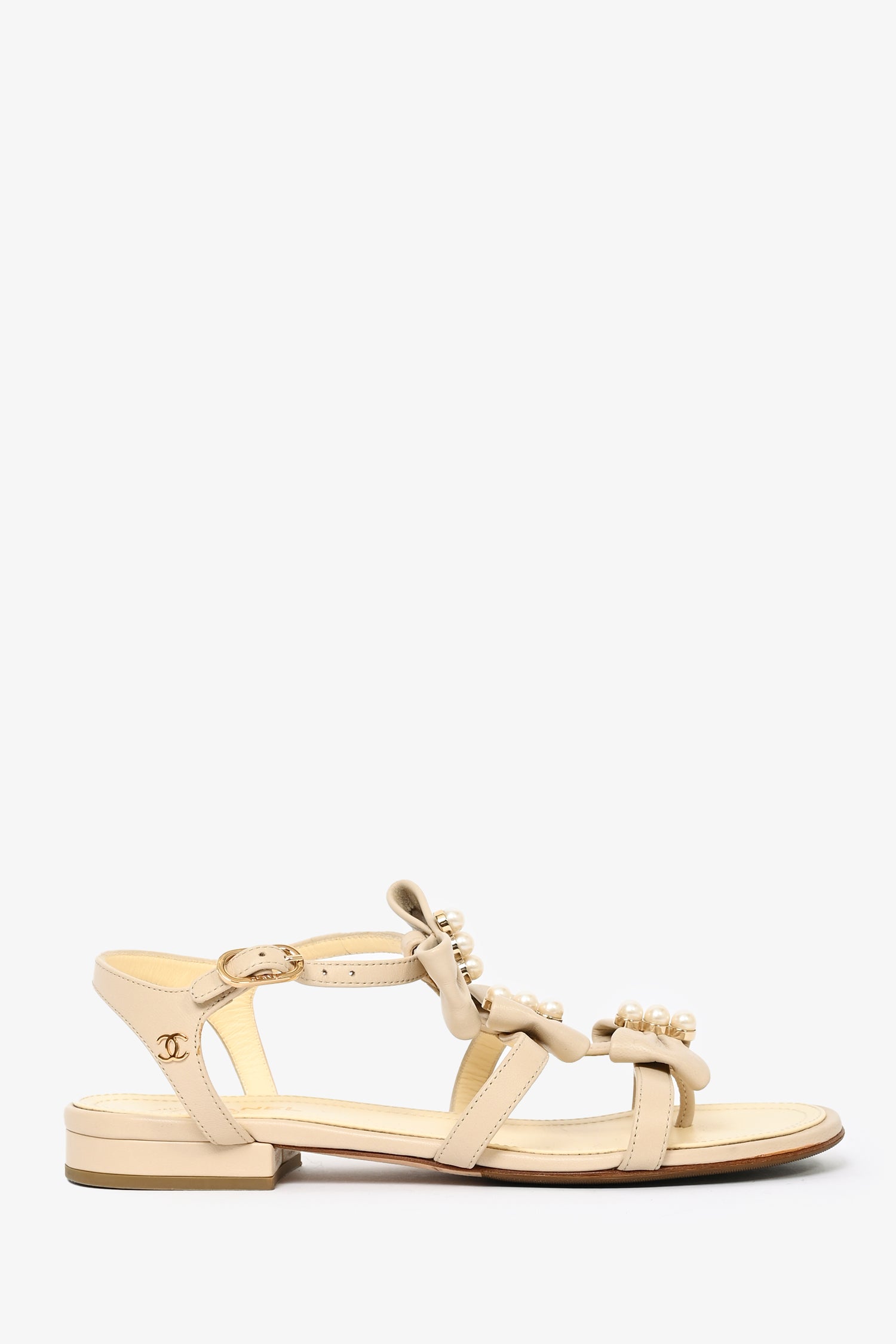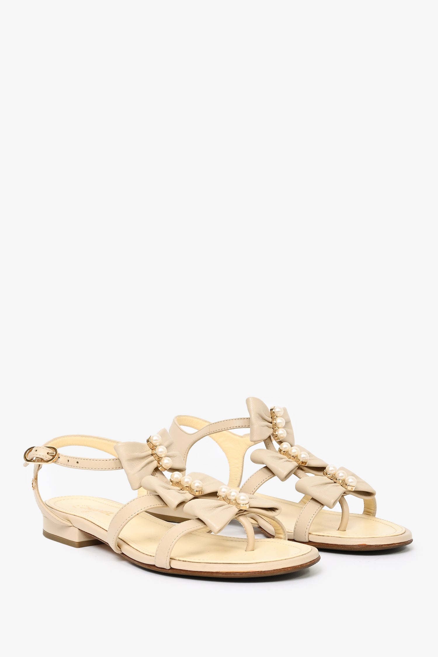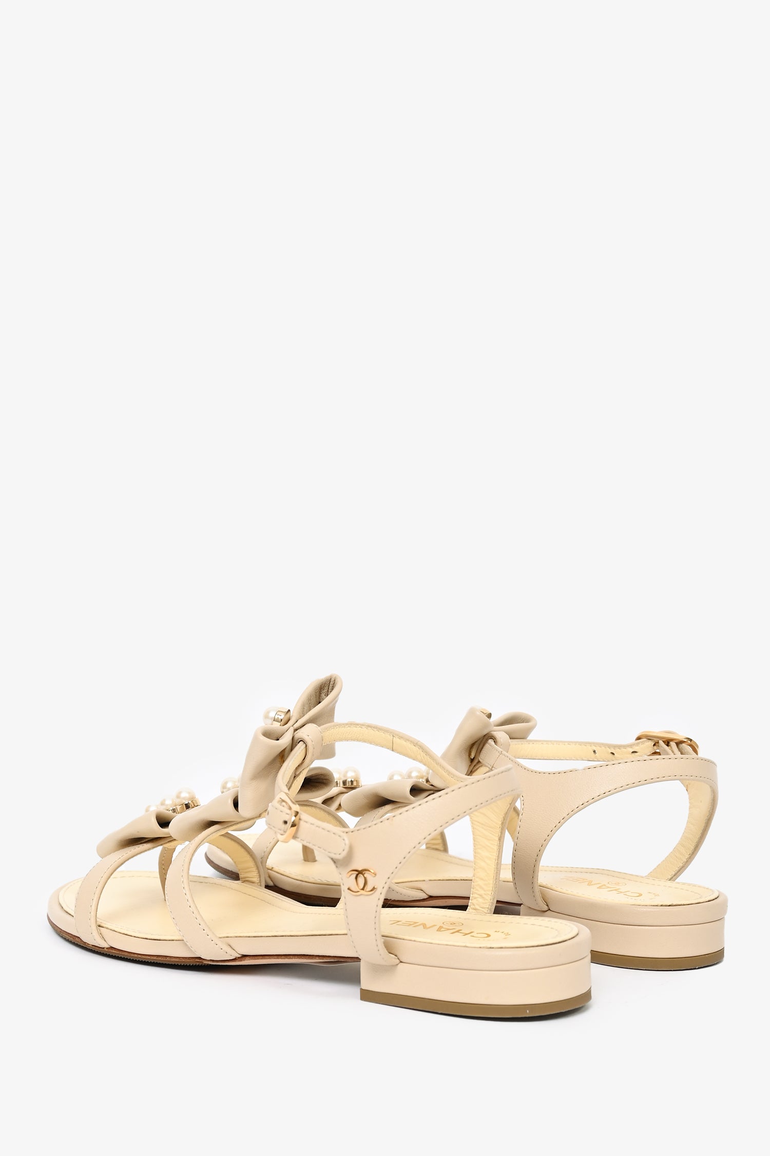 Pre-Loved Chanel™ Cream Leather Bow Pearl Detailed Flat Sandals Size 35.5