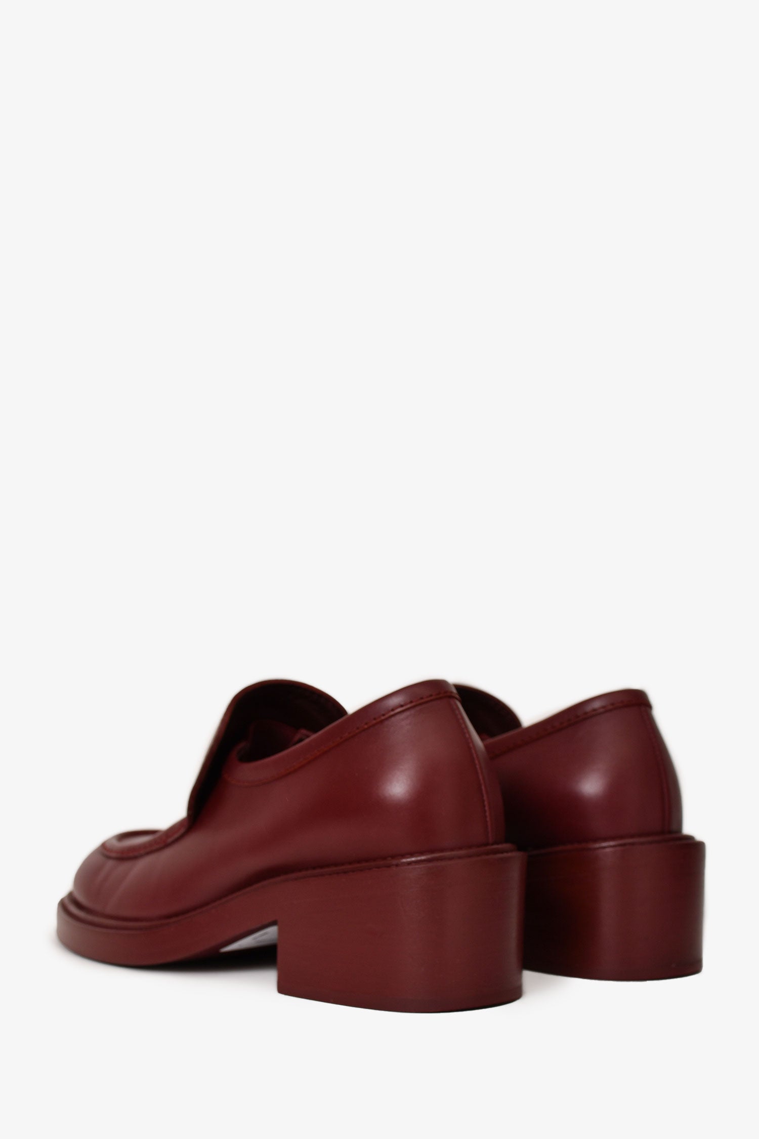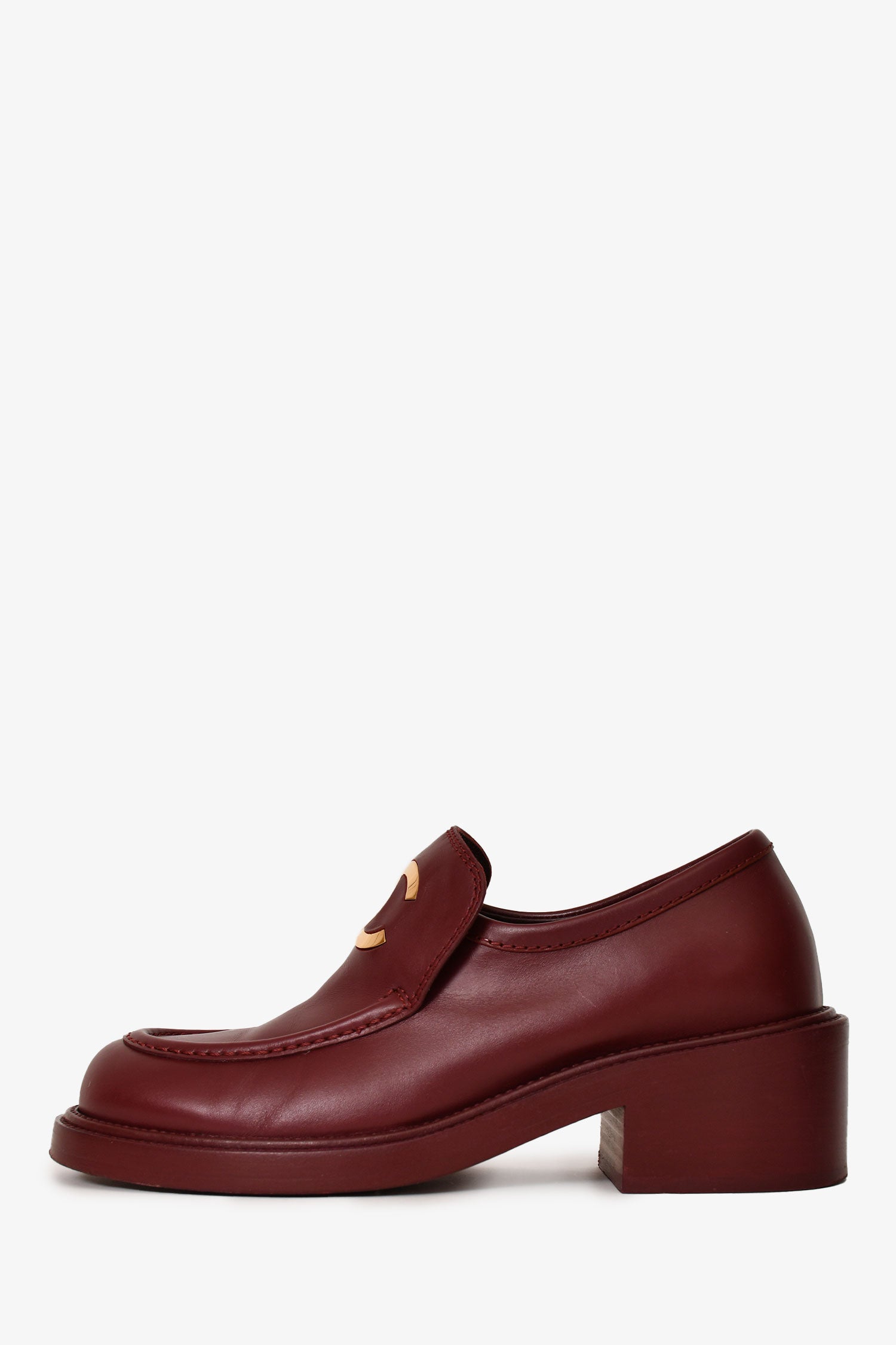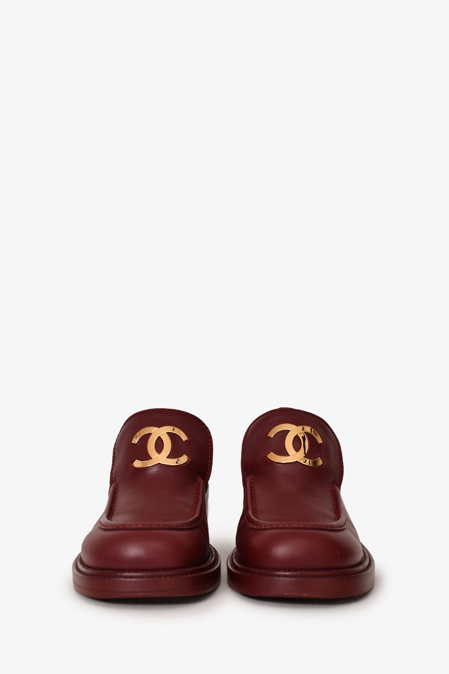 Refresh availabilityPre-Loved Chanel™ Burgundy Leather Gold CC Loafers. Slip-on. Round toe. Gold-toned hardware. Tonal stitching.