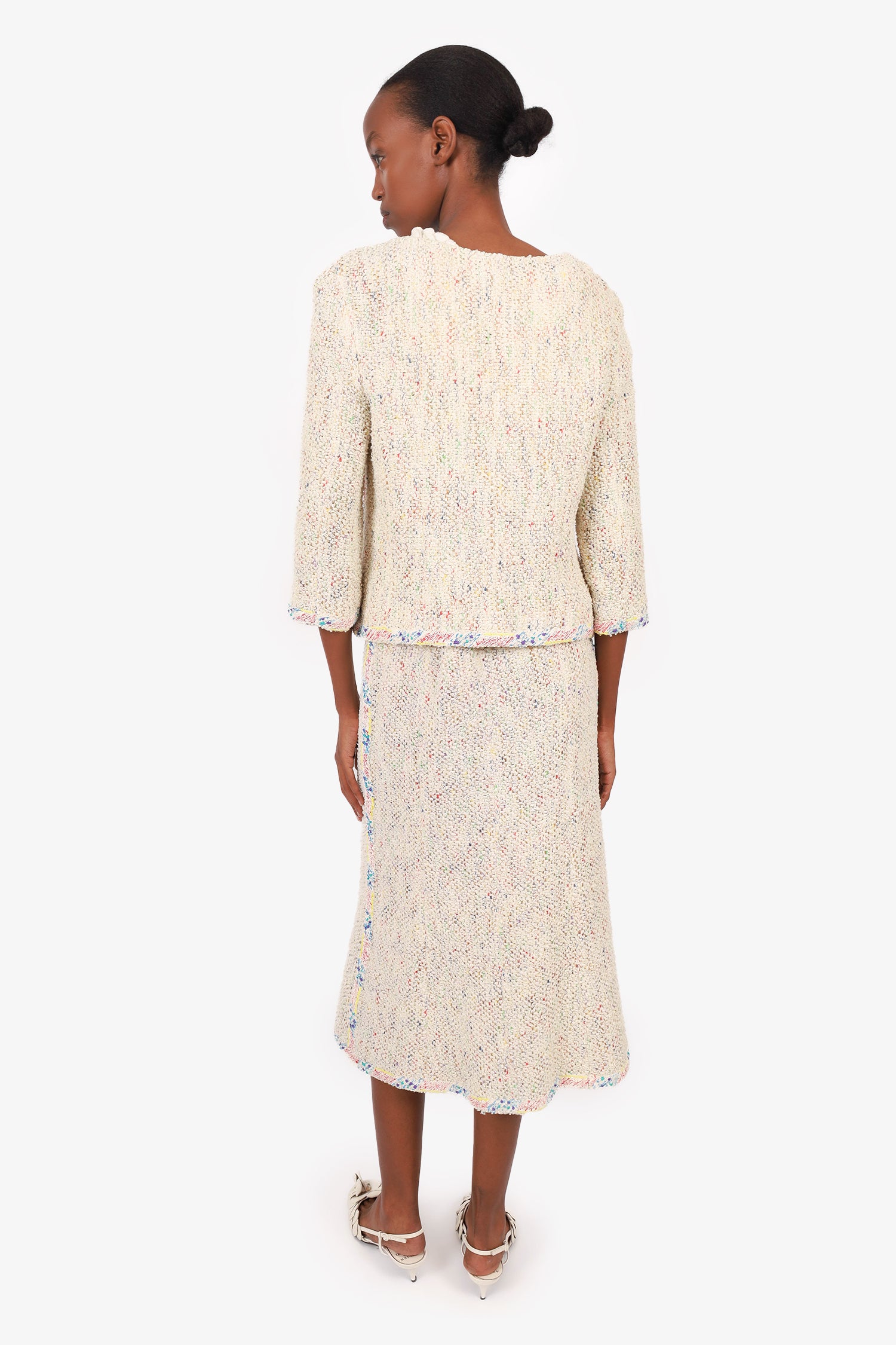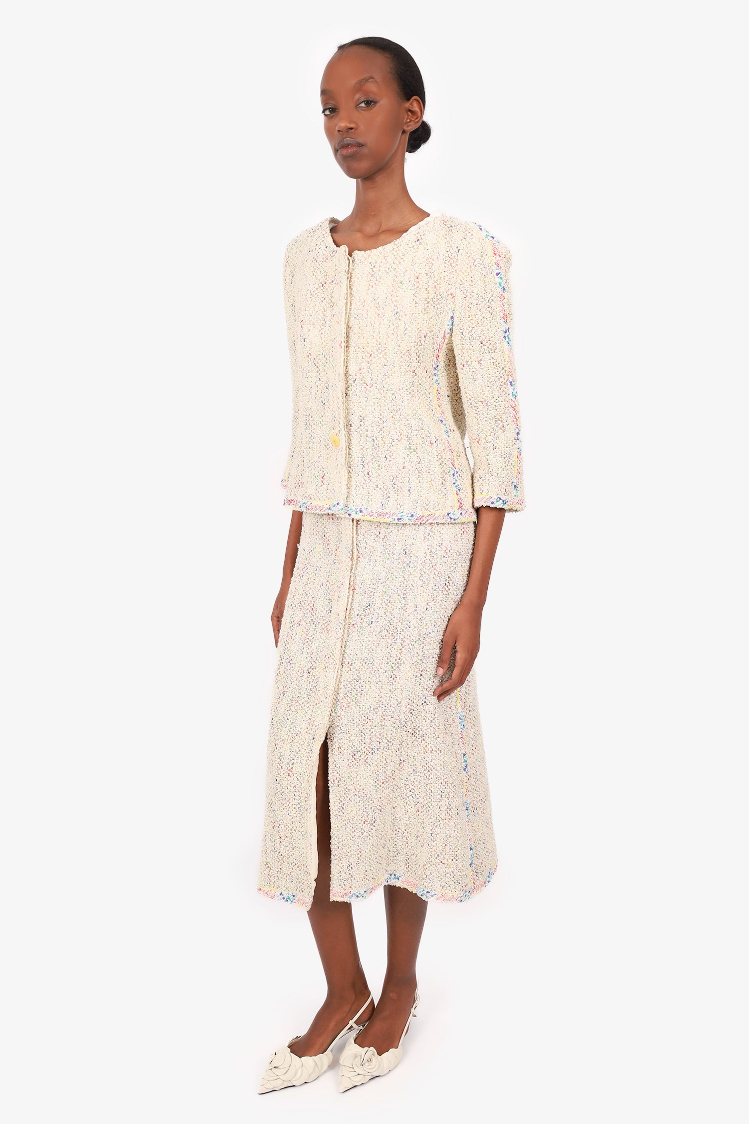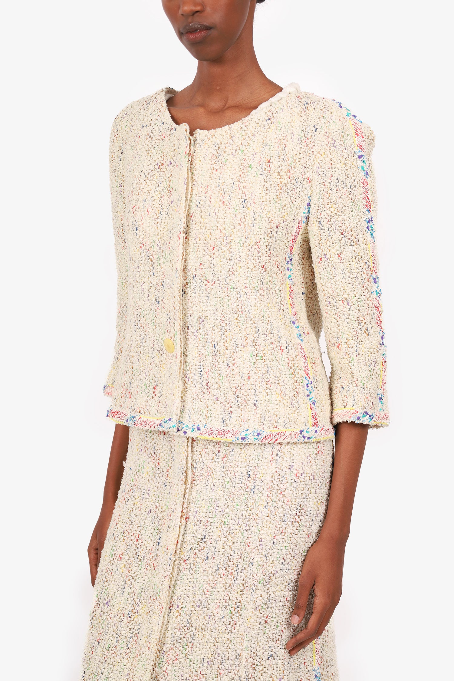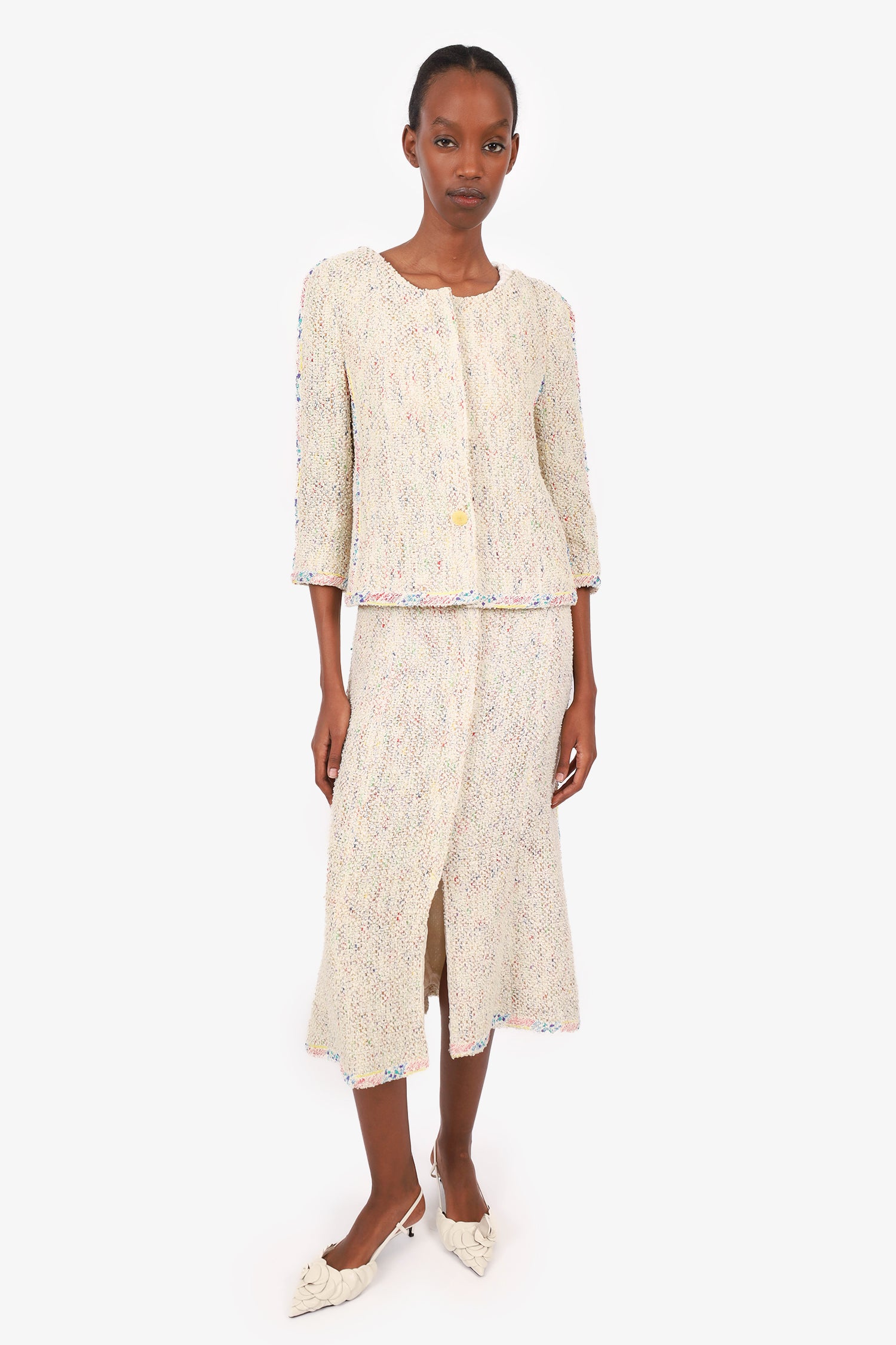 Refresh availabilityPre-Loved Chanel™ Cream/Multicolour Tweed Jacket + Skirt. Jacket; Round neckline. Front button-up closure. Shortened sleeves. Chain detail around interior of waist. Silver-tone hardware. Skirt; Non-stretch waist. Front button-up closure. A-line silhouette. Front slit. Both are lined with tonal stitching.