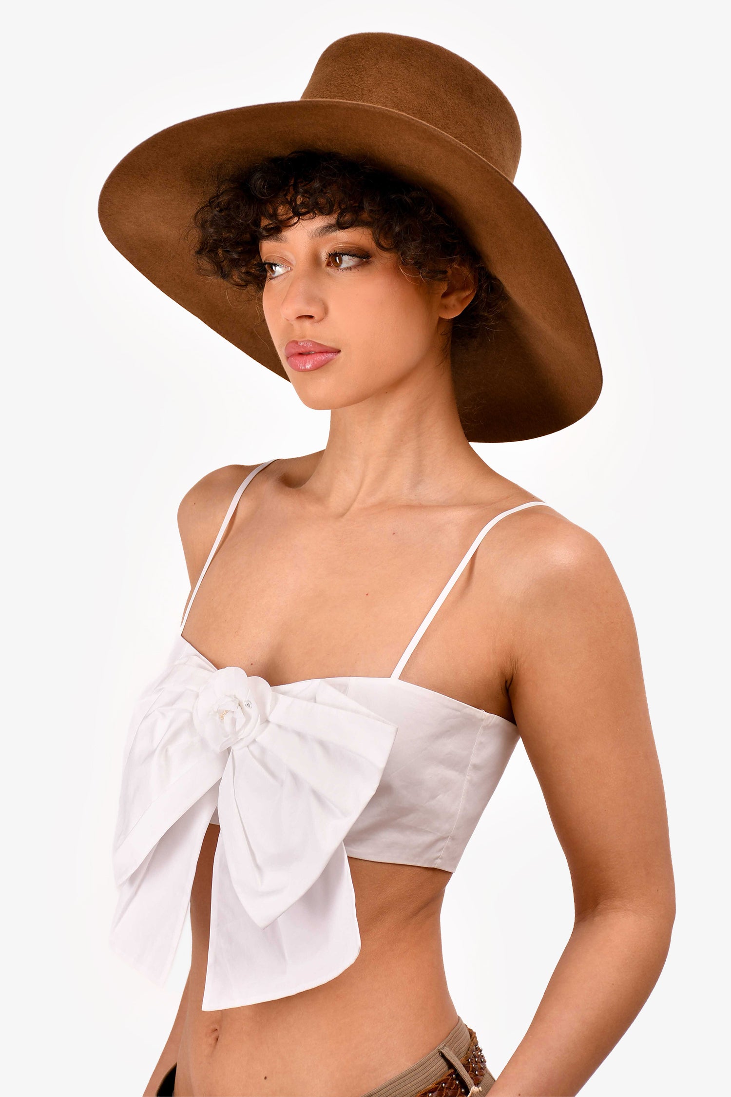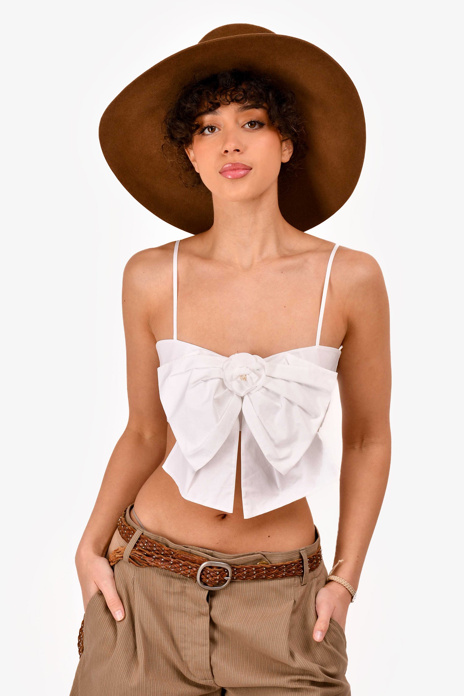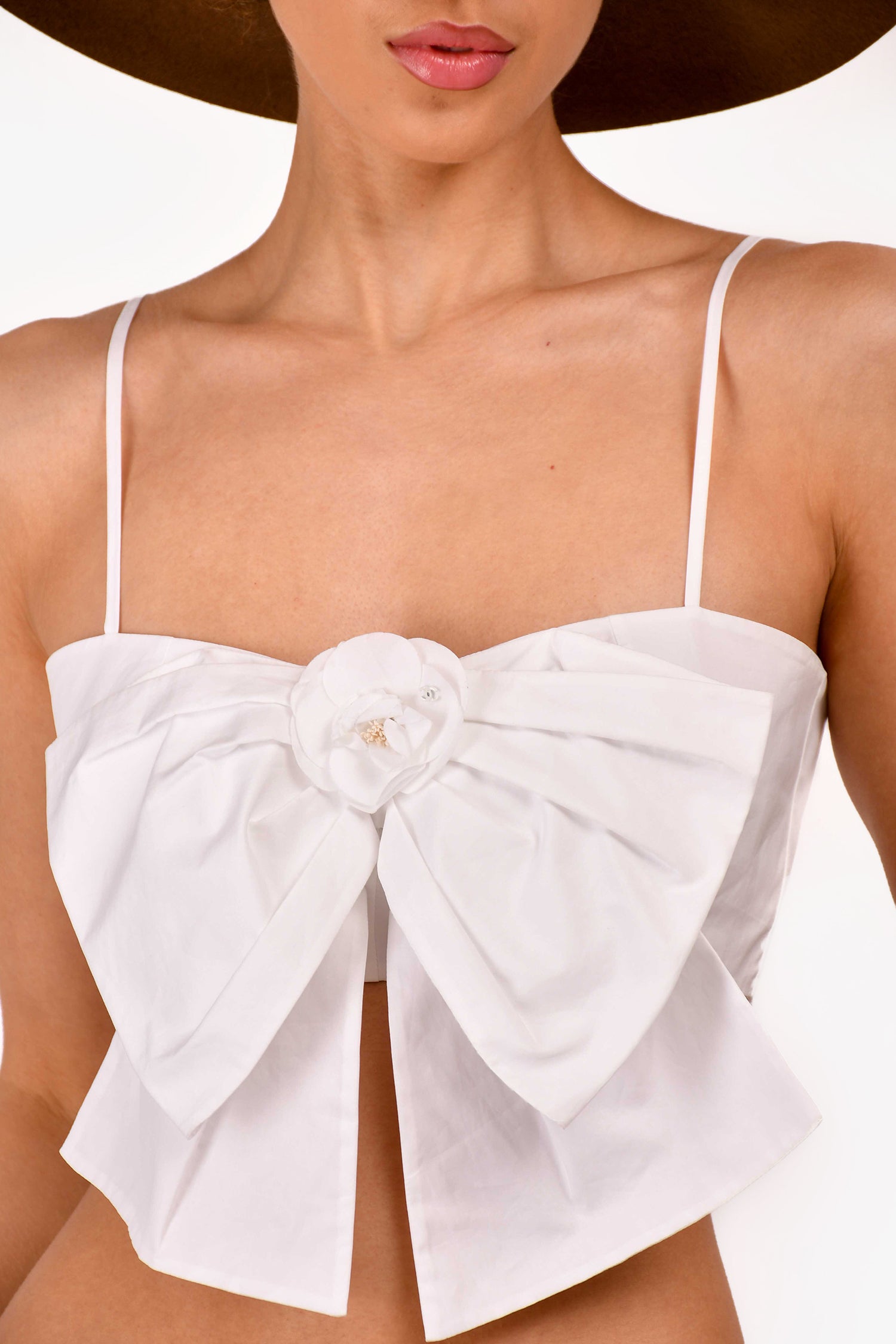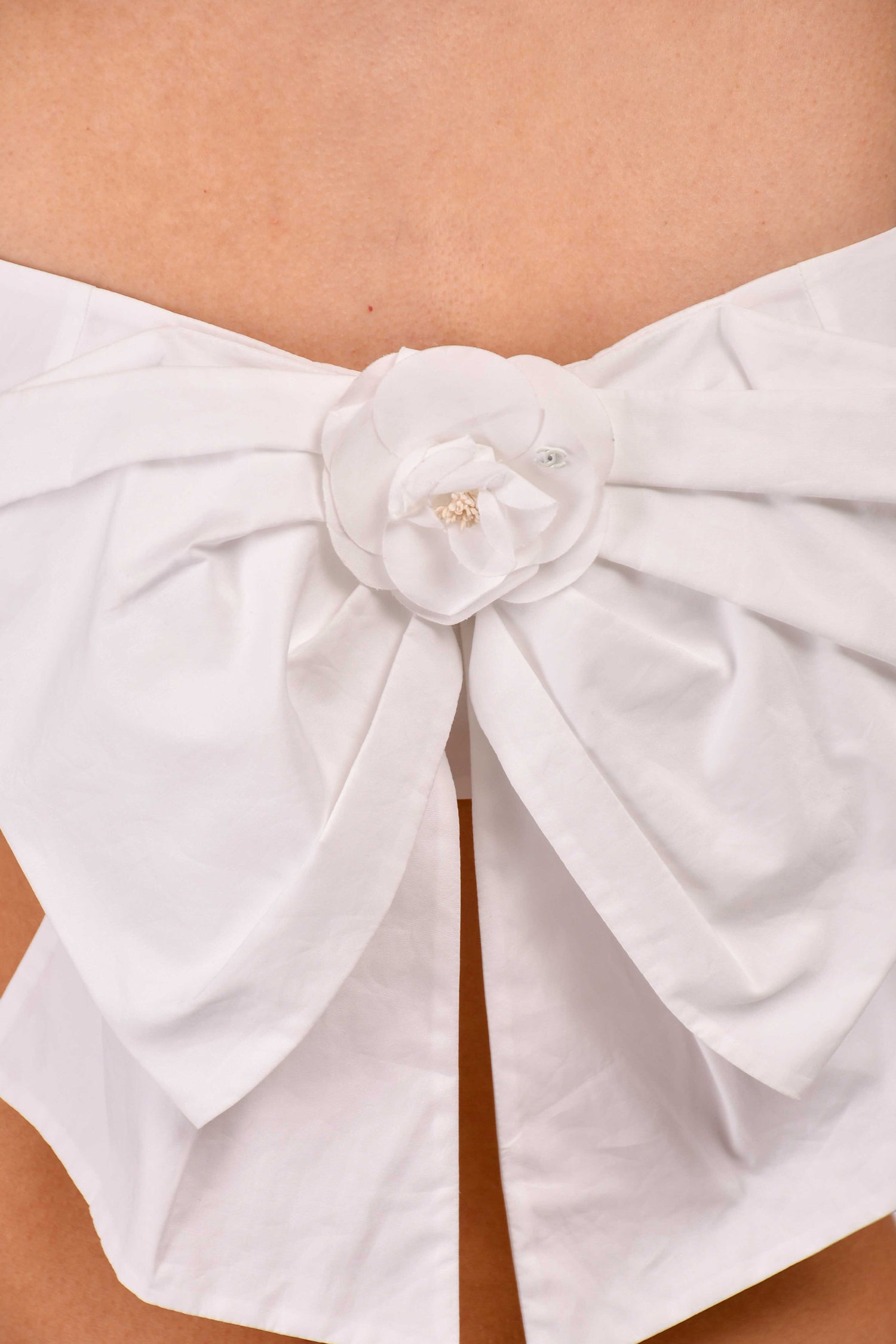 Refresh availabilityPre-Loved Chanel™ Cruise 2020 White Cotton Poplin Camellia Bow Crop Top. Strapless. Rear button closure. Unlined. Tonal stitching.