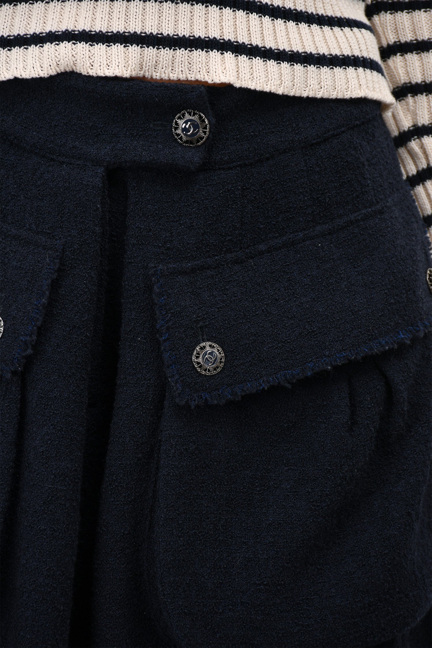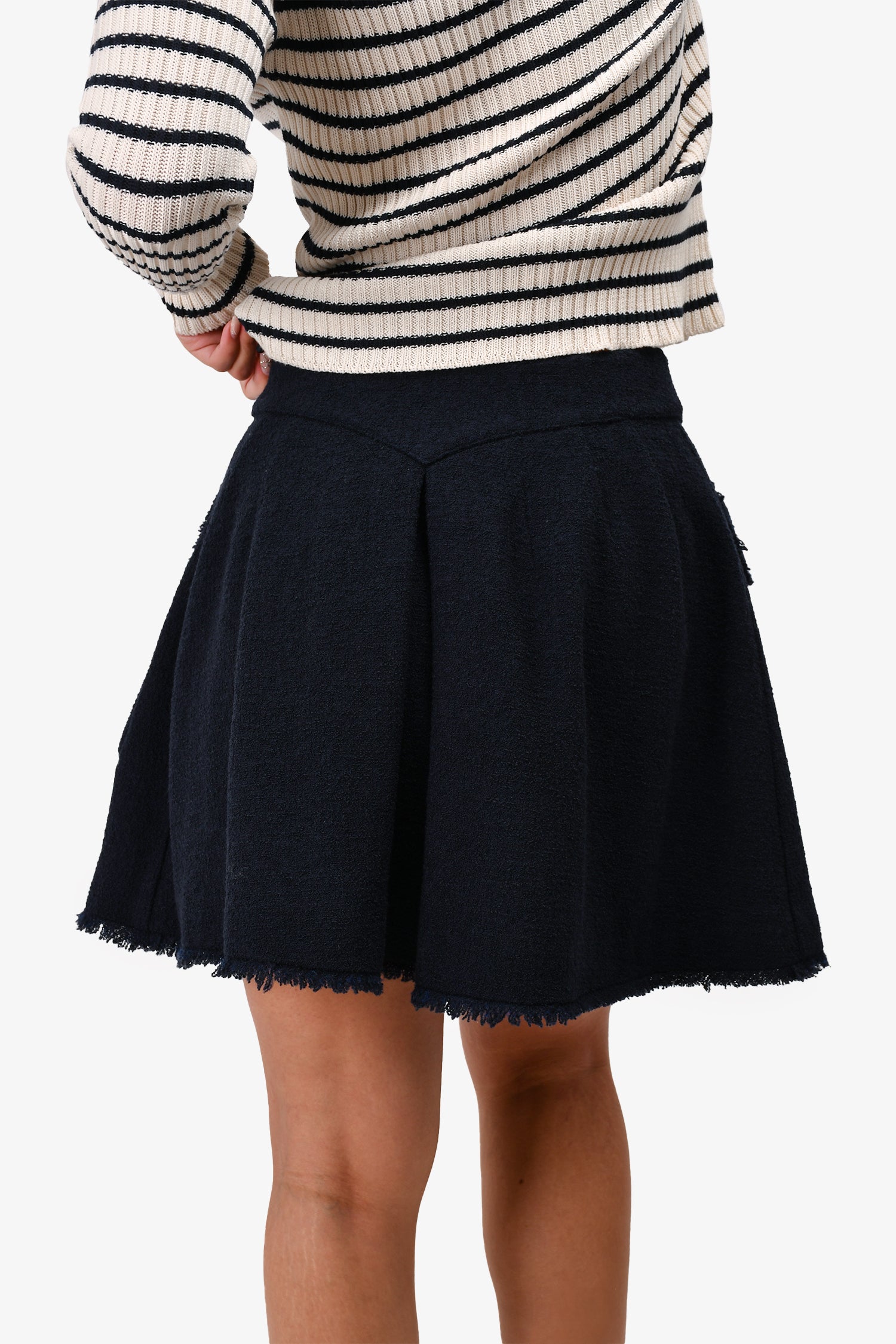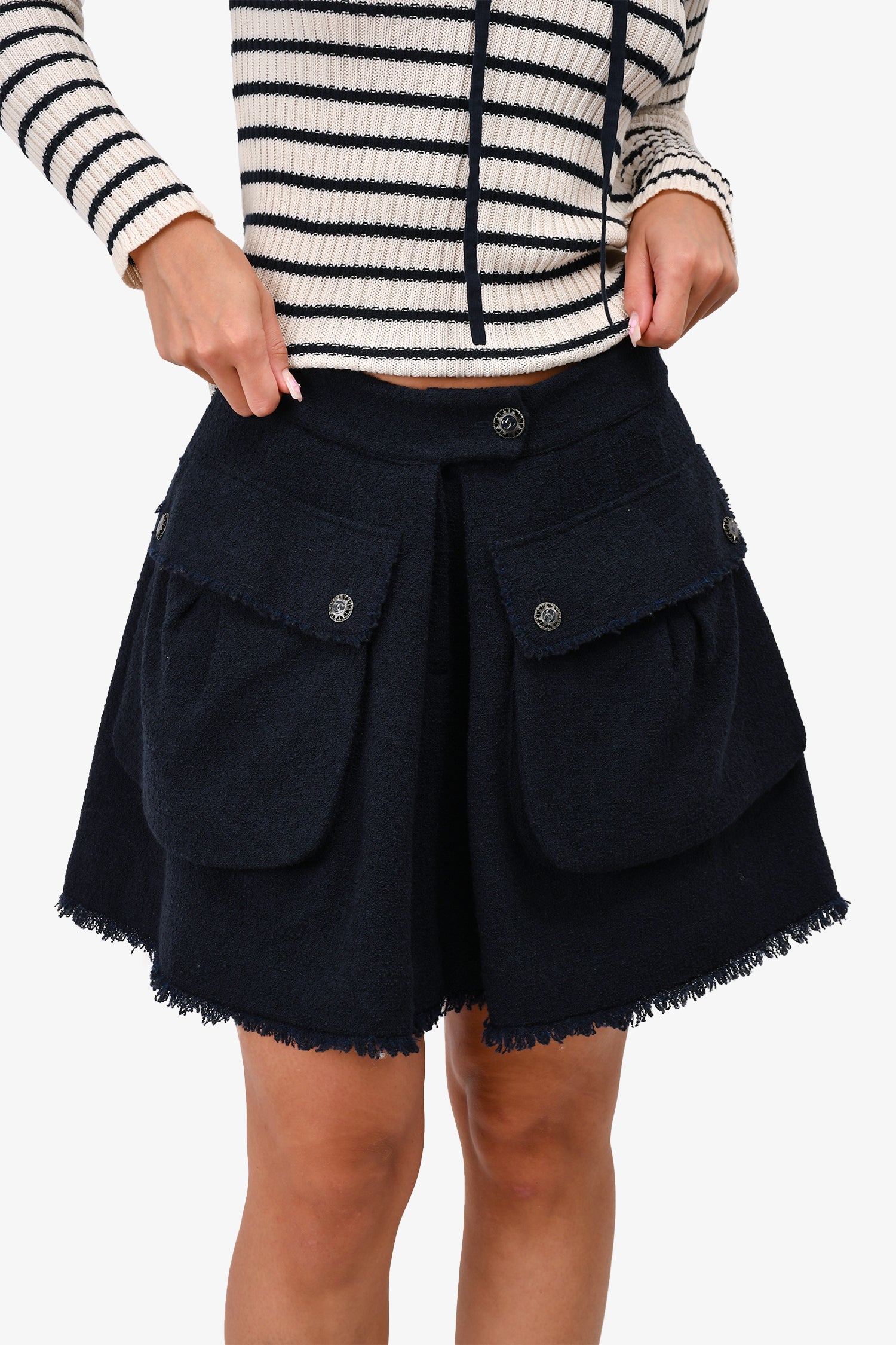 Refresh availabilityPre-Loved Chanel™ Dark Navy Blue Tweed Flared Mini Skirt with Front Pockets. Front zip and button closure. Front pockets. Lined.