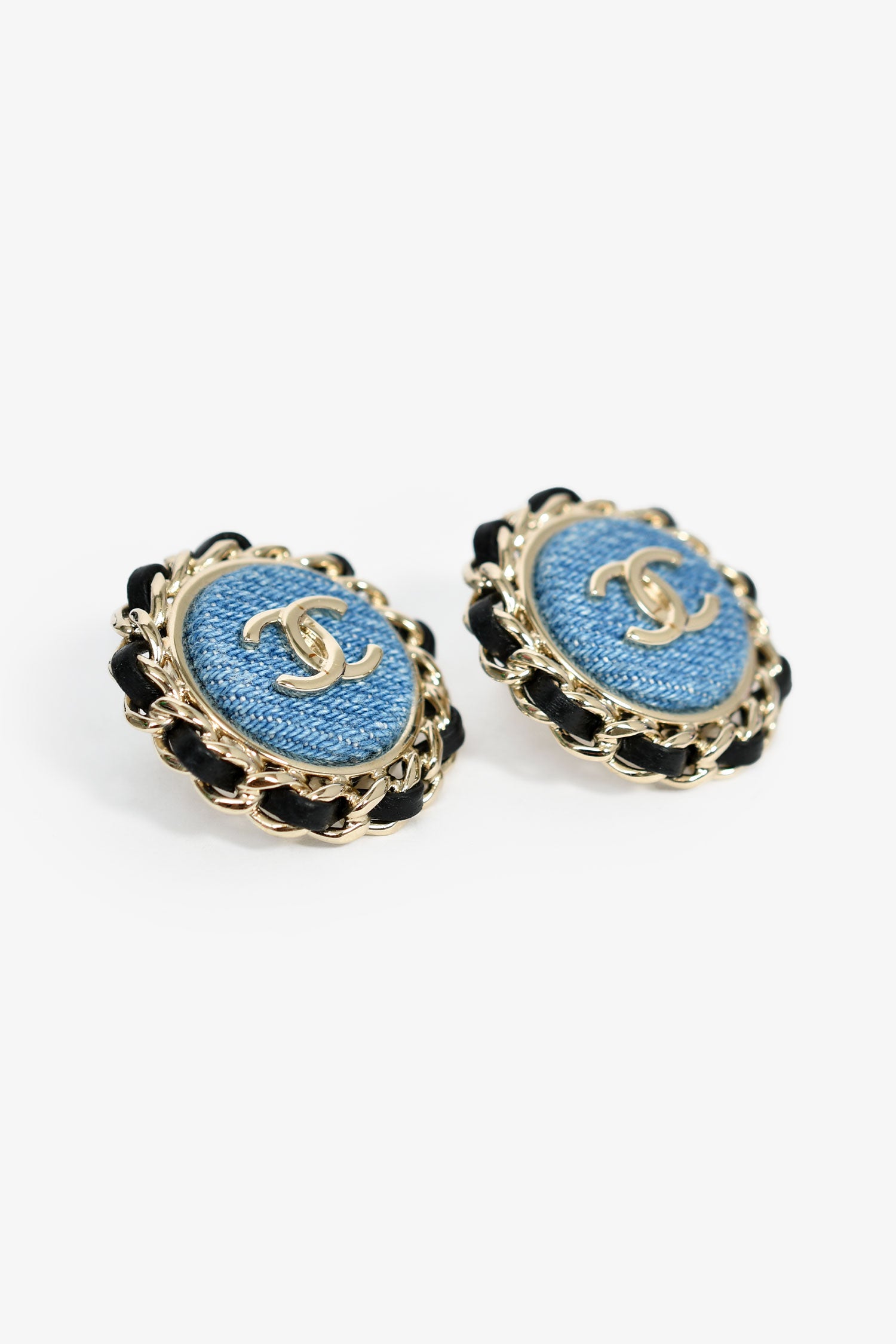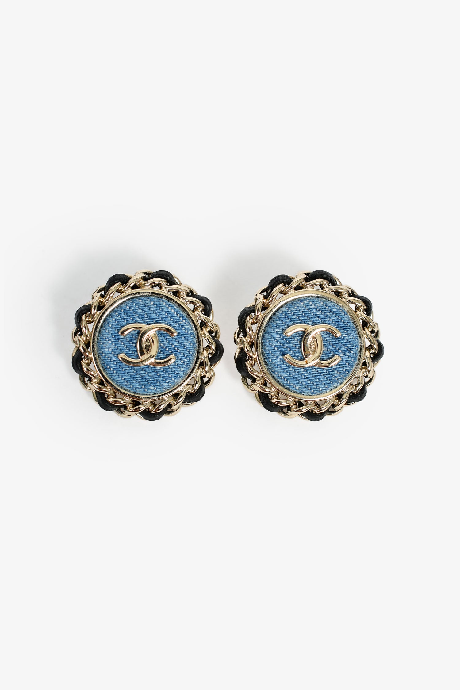 Refresh availabilityPre-Loved Chanel™ Gold Toned/Denim CC Earrings. Push-pin backing.