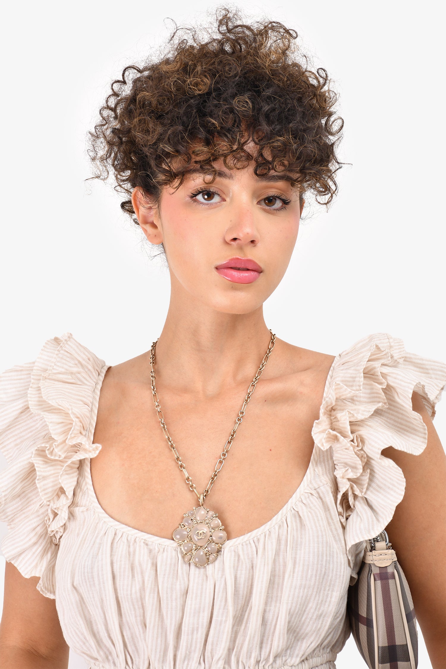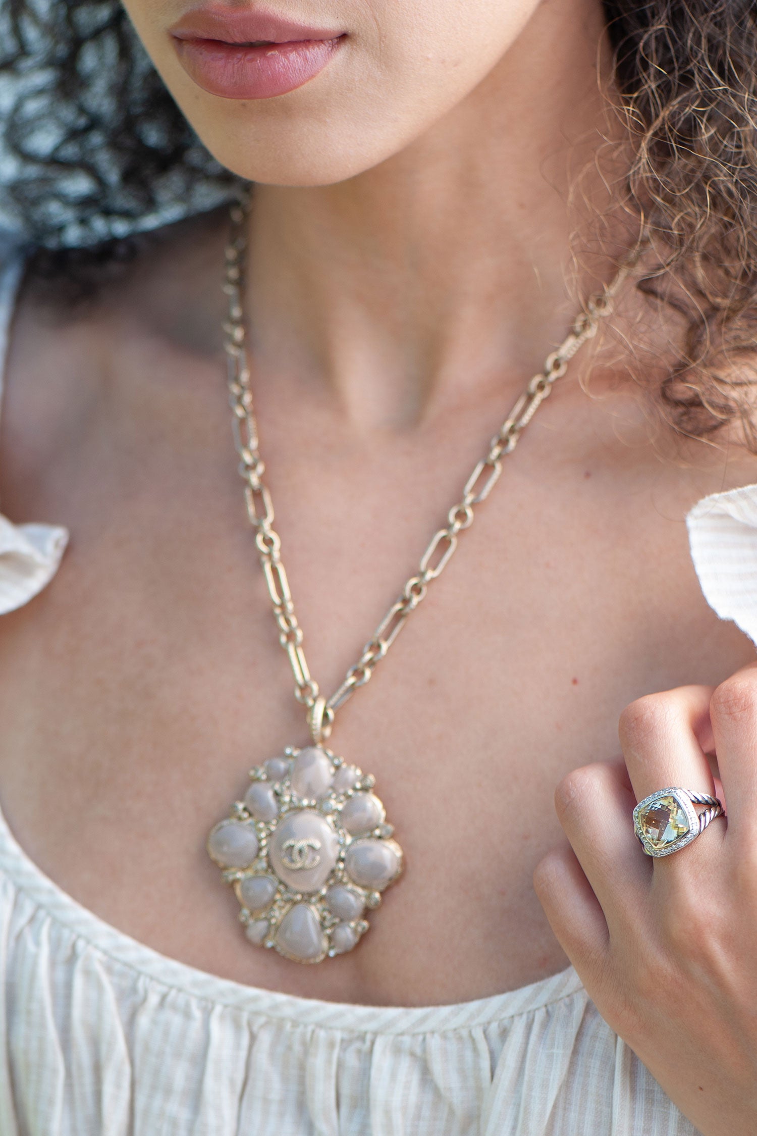 Refresh availabilityPre-Loved Chanel™ Gold Toned Pink Resin CC Embellished Necklace. Gold-toned hardware. Lobster clasp closure.