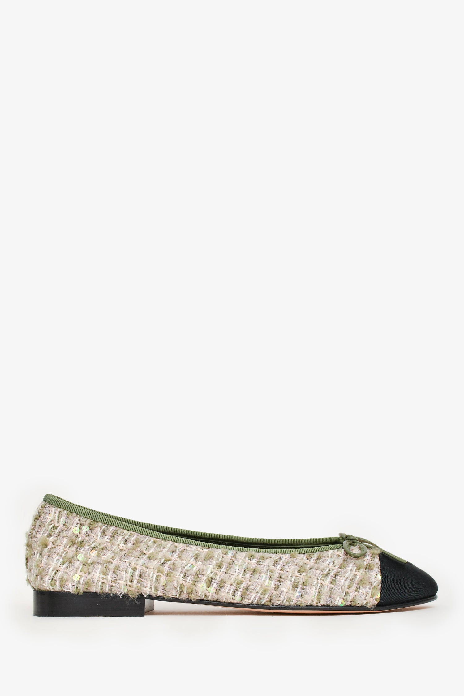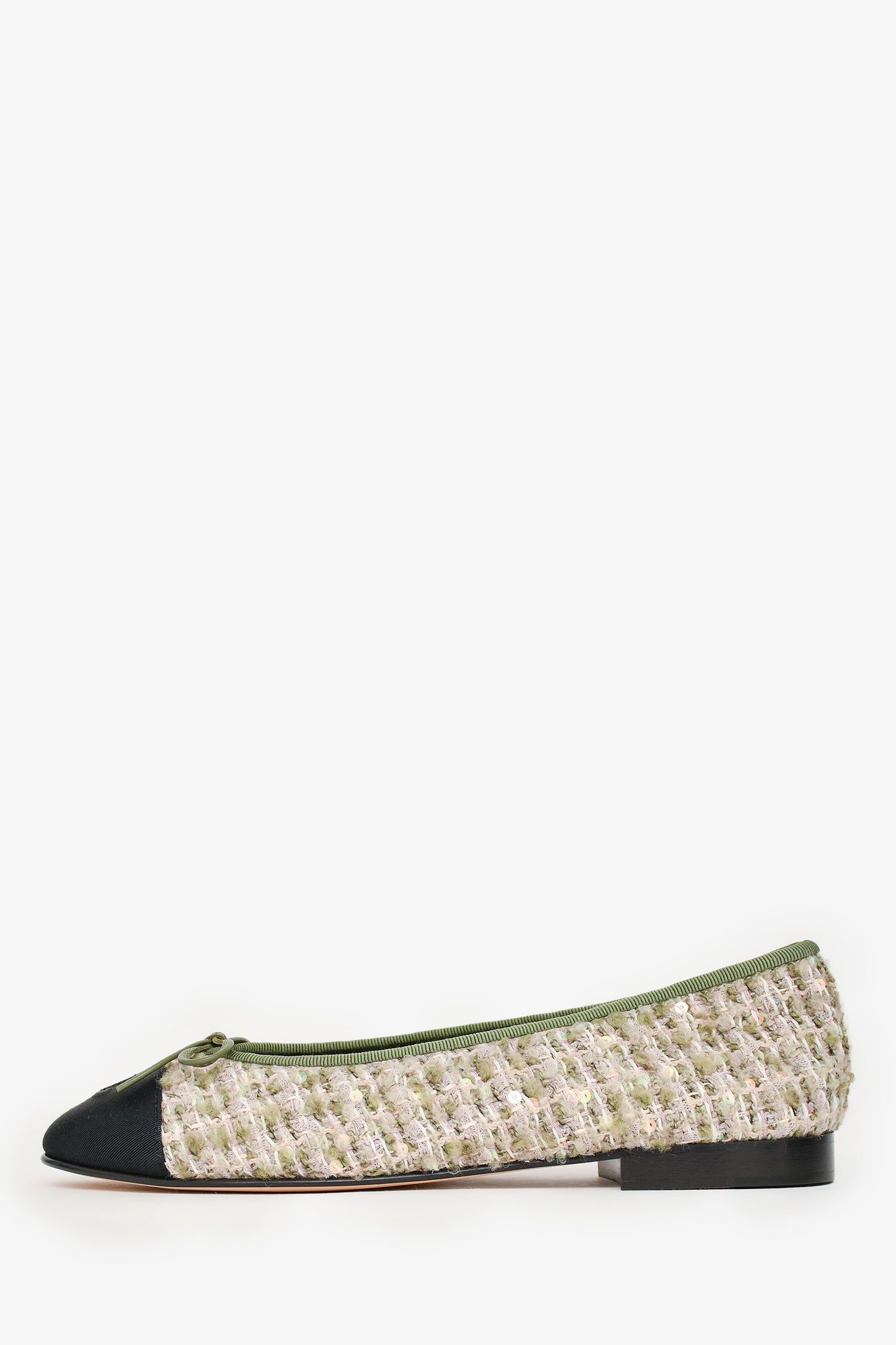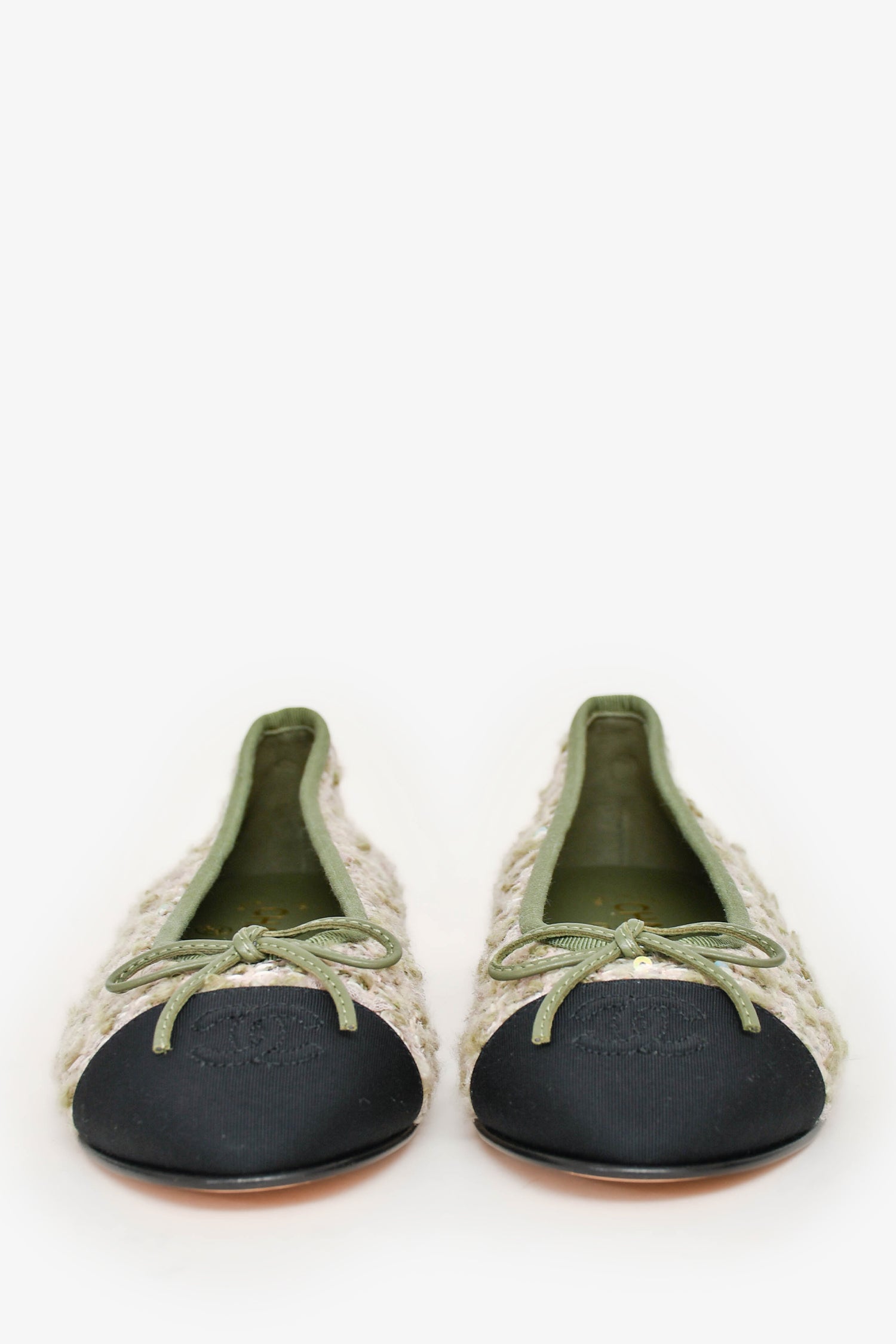 Refresh availabilityPre-Loved Chanel™ Green Tweed CC Ballet Flats. Slip-on. Round-toe design. Bow detailing with contrasting black toe. Tonal stitching.