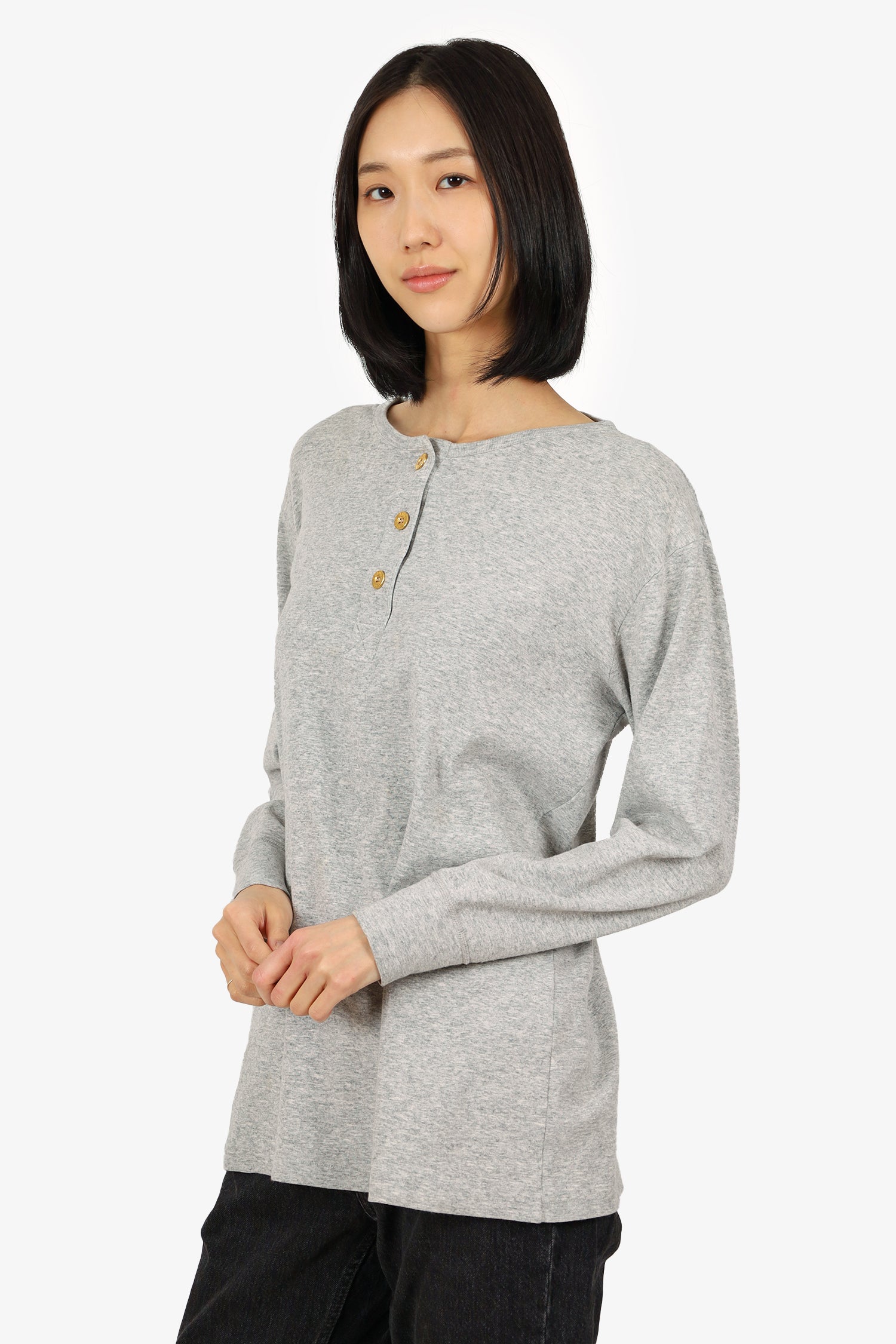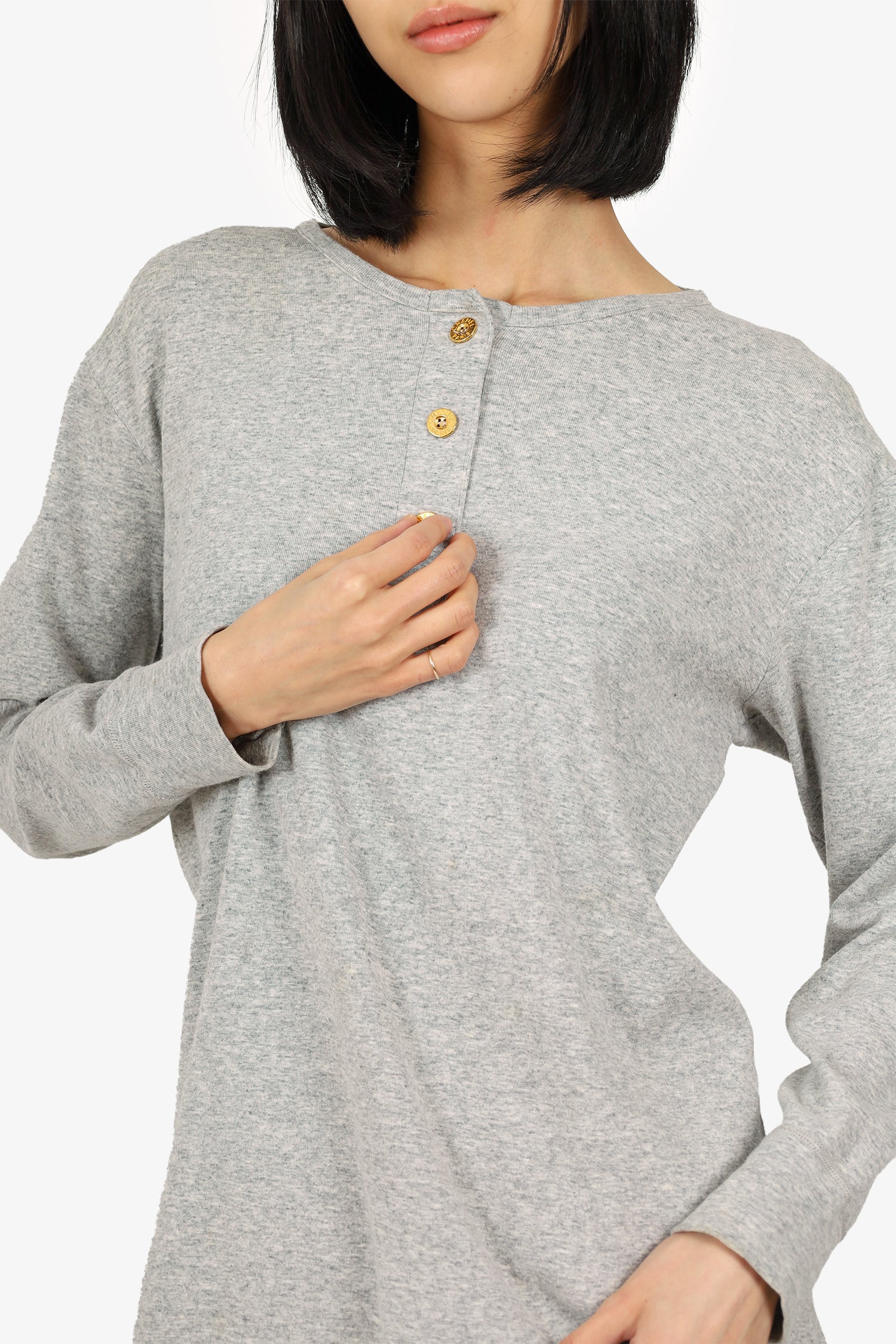 Pre-Loved Chanel™ Grey Cotton Long Sleeve Buttons Sweater. Pull-on. Round neckline. Front button-up closure. Gold-tone hardware. Tonal stitching.