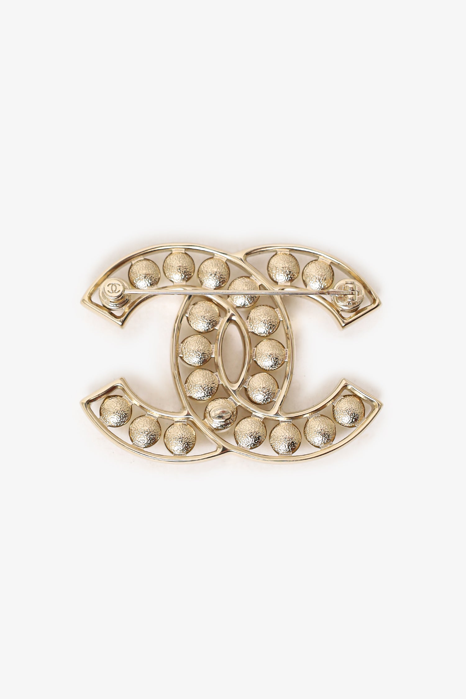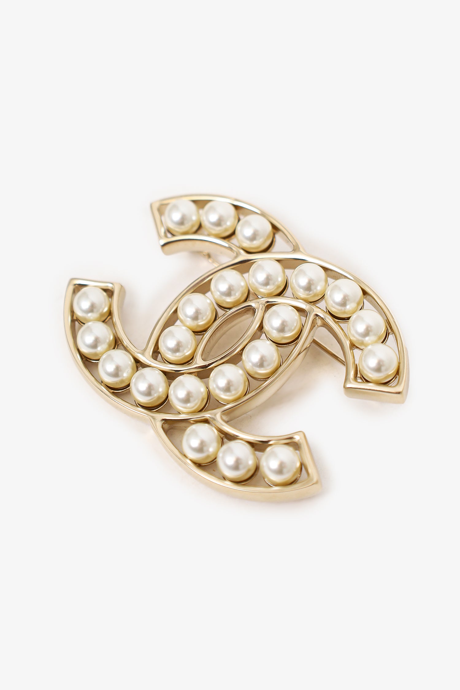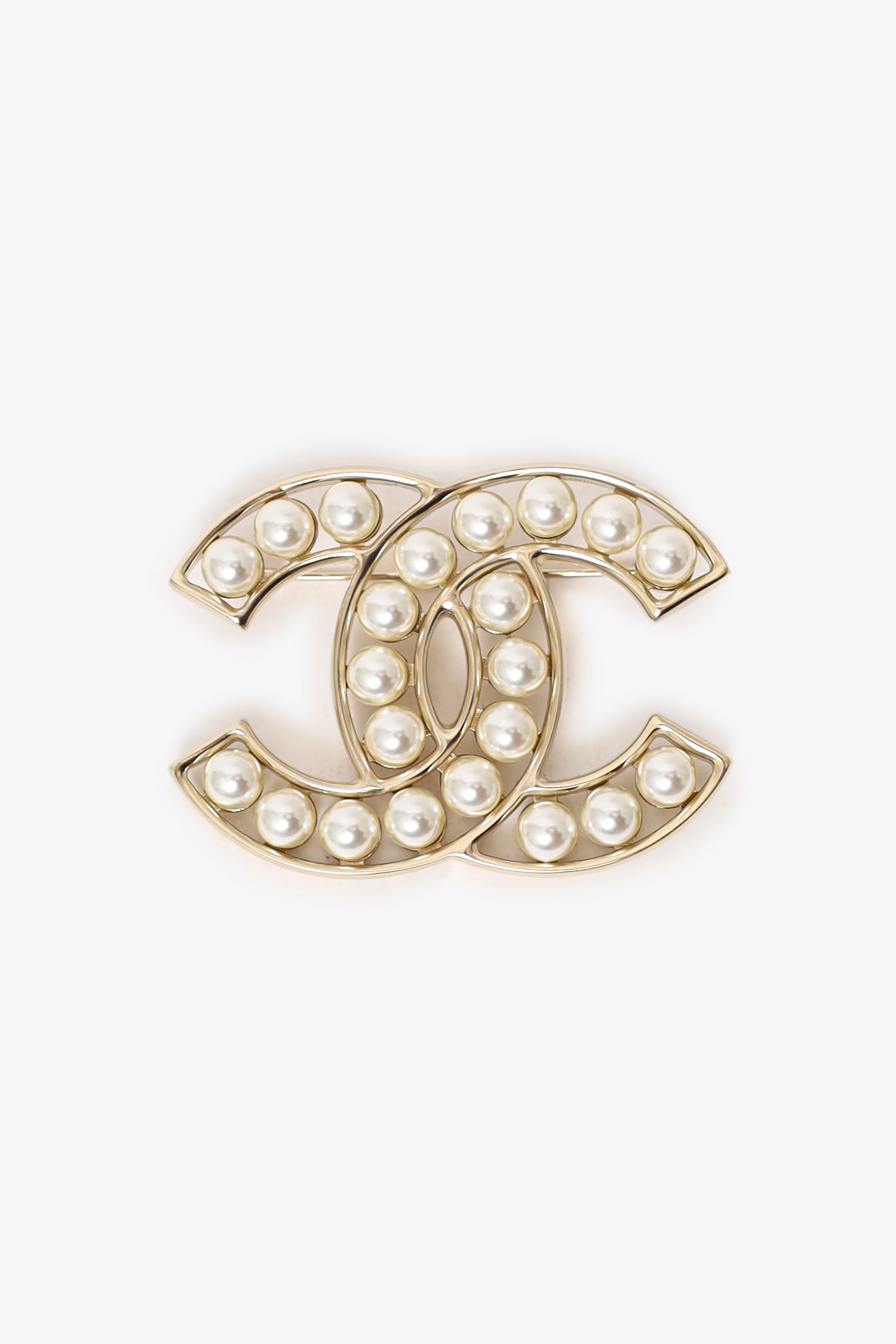 Refresh availabilityPre-Loved Chanel™ Light Gold Tone CC Pearl Brooch. Rear safe pin closure. Gold-tone hardware.