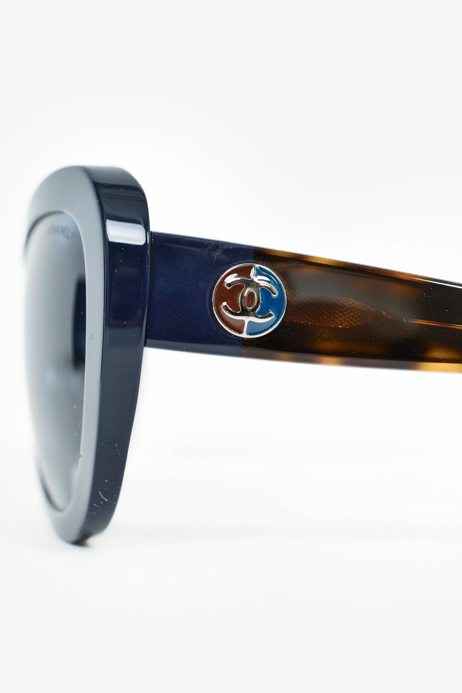Pre-Loved Chanel™ Navy Blue/Brown Tortoiseshell Oversized Sunglasses. Built-in nose pads. Silver-tone hardware.