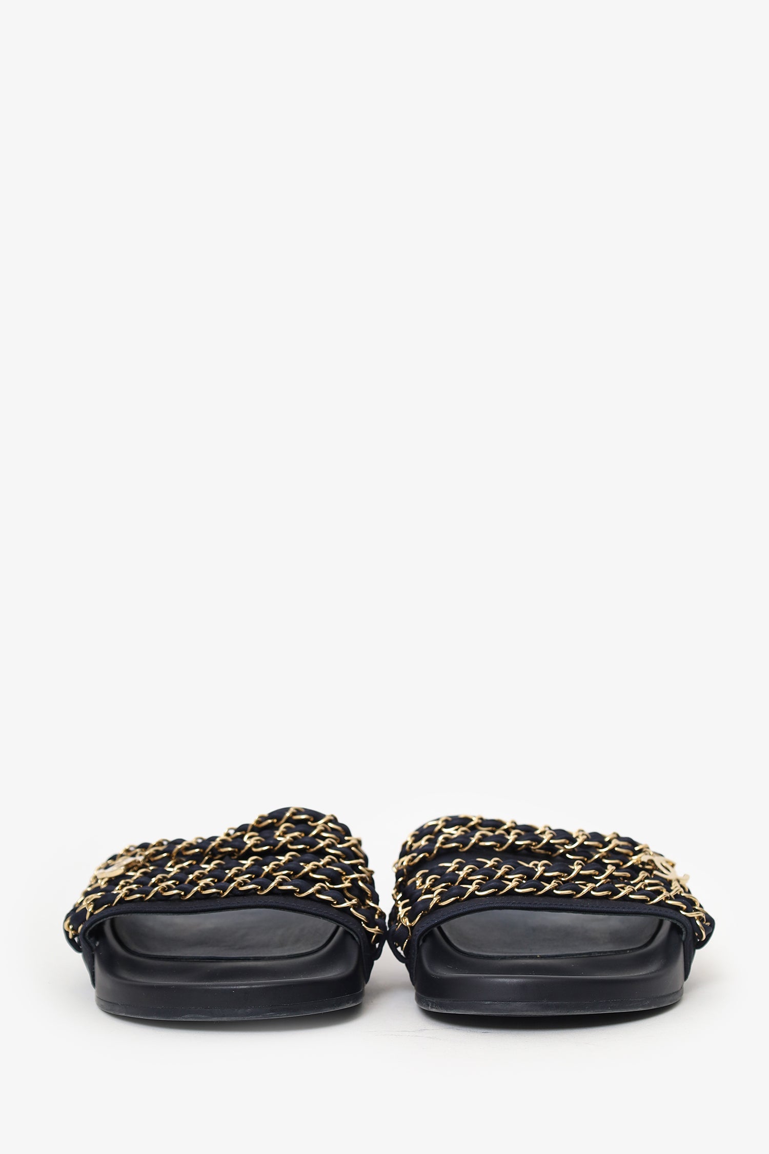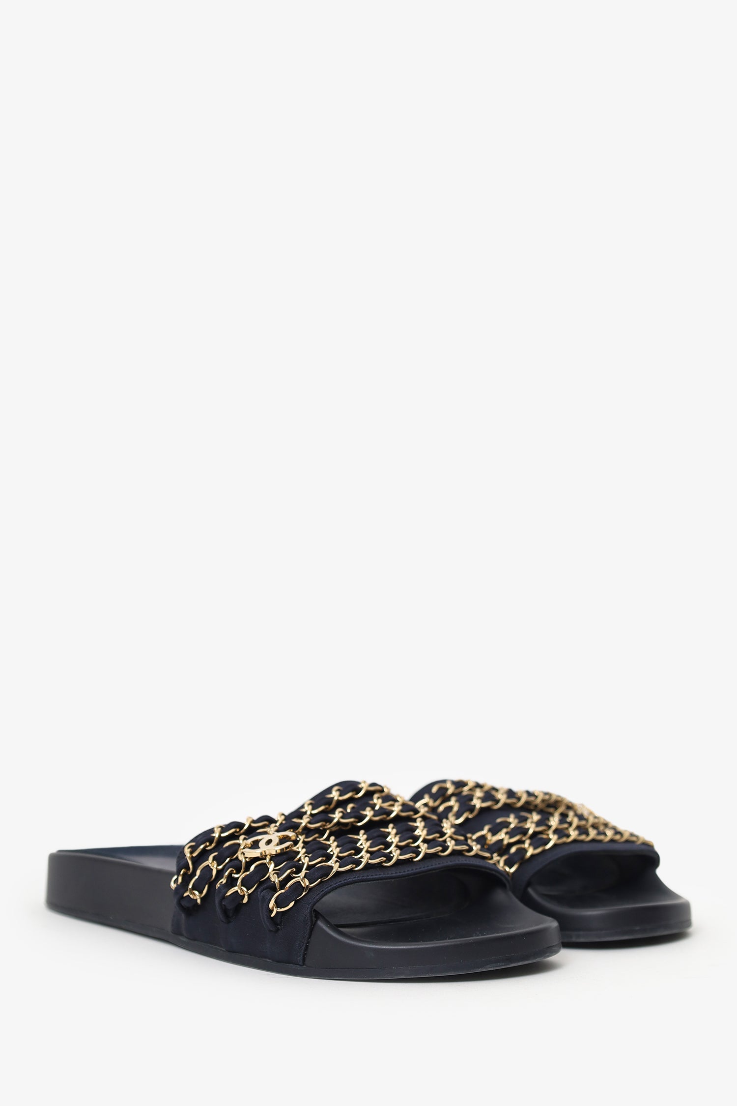 Refresh availabilityPre-Loved Chanel™ Navy Chain Detail Slides. Slip-on. Round toe. Gold-tone hardware. Tonal stitching.