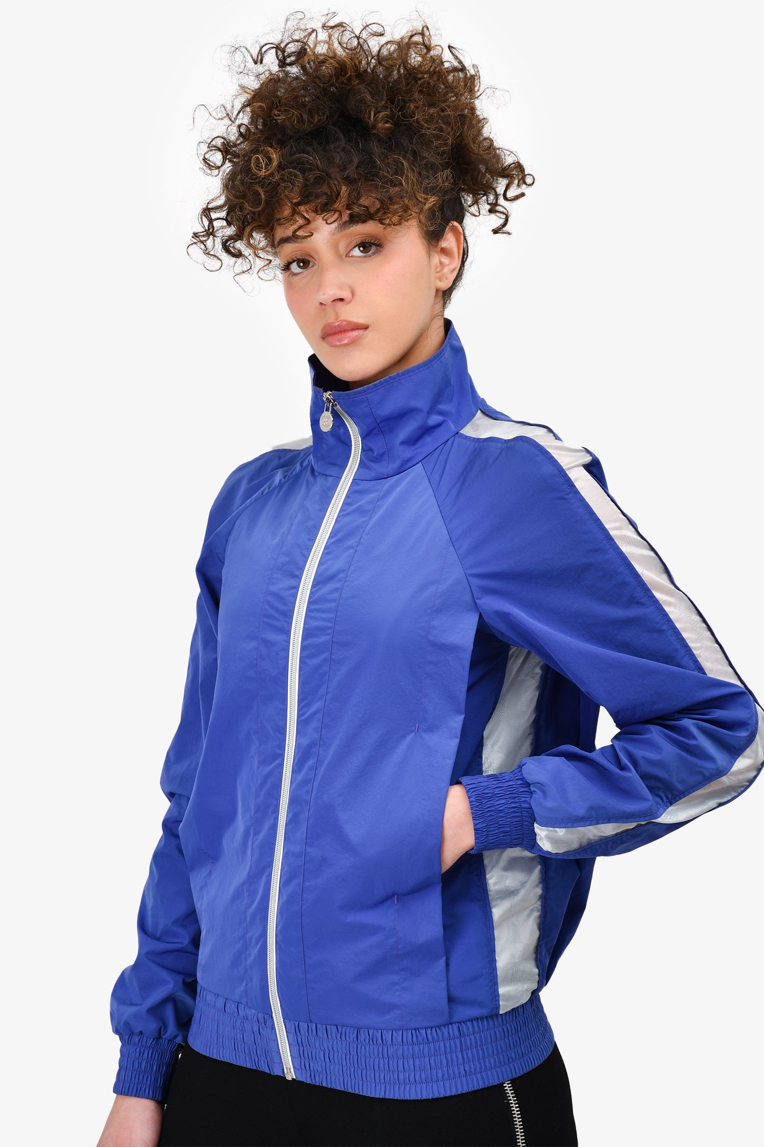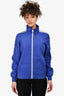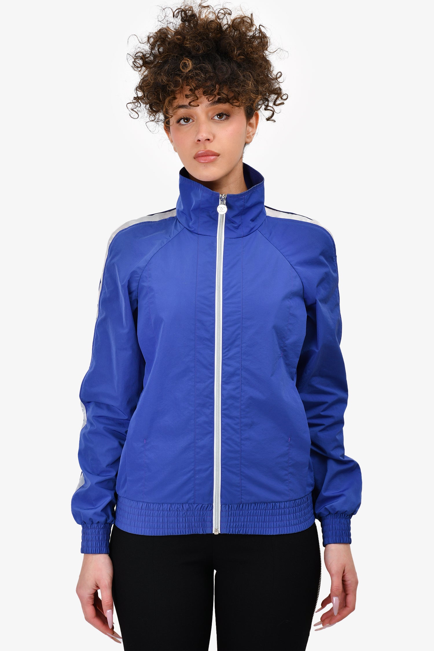 Pre-loved Chanel™ Nylon Blue Sport Jacket Silver Band On Sleeves. Front zip-up closure. Front zip pockets. Unlined. Tonal Stitching.