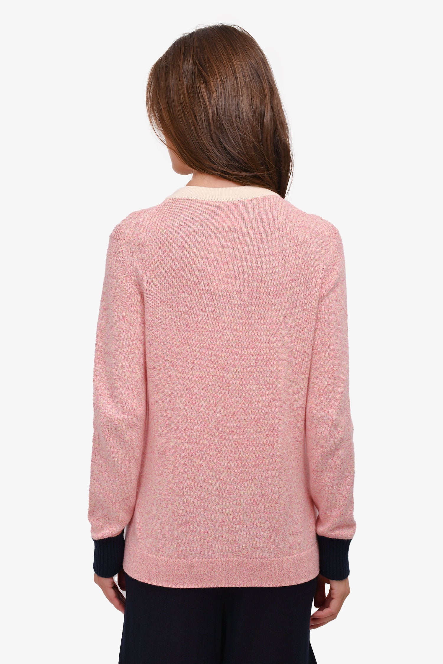 Refresh availabilityPre-Loved Chanel™ Pink/White Cashmere Cardigan. V-neck. Front button-up closure. Front pockets with button closure.