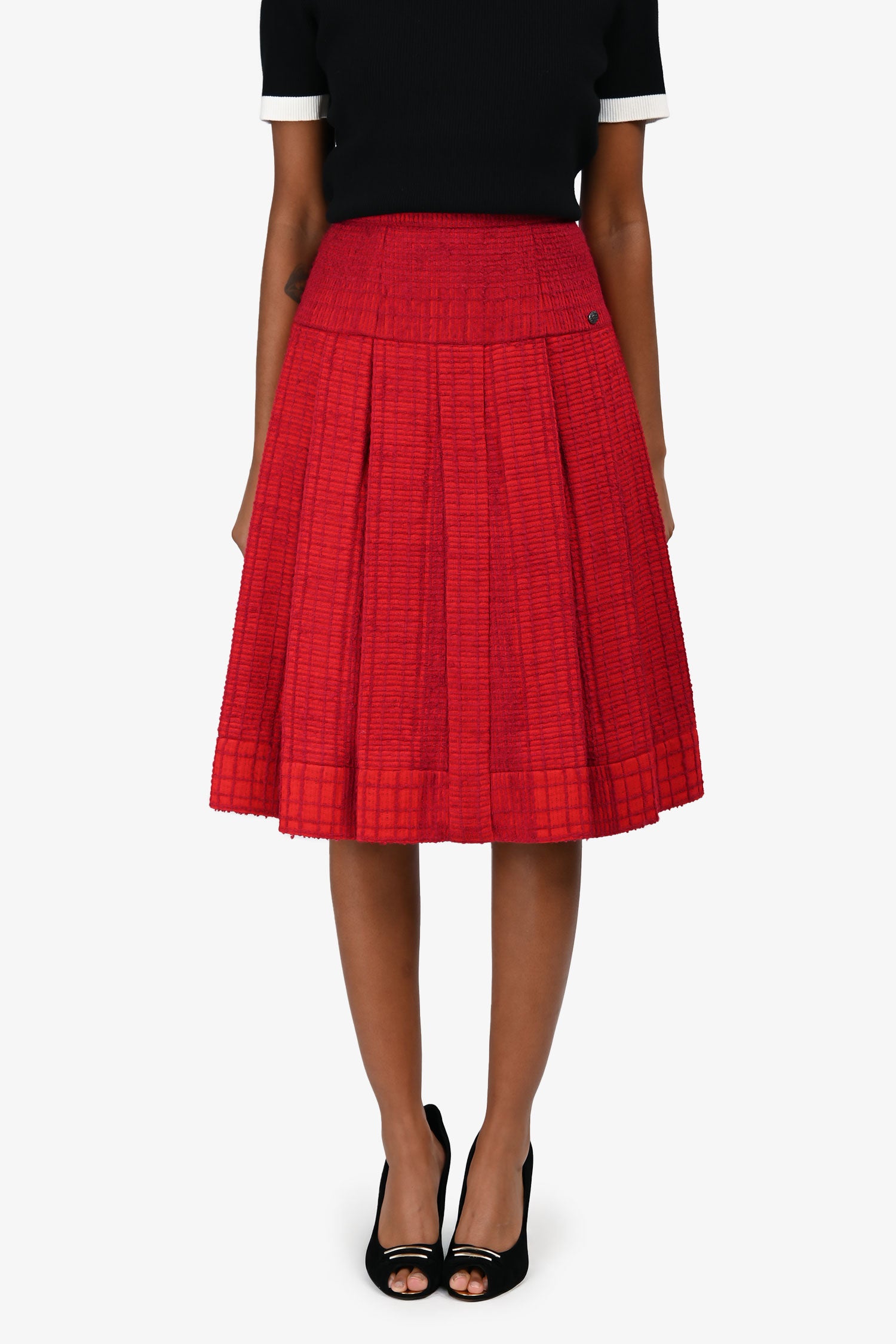 Refresh availabilityPre-Loved Chanel™ Red Tweed Logo Pleated Mini Skirt. Pull-on. Rear zip and hook-up closure. Lined interior. Tonal stitching.
