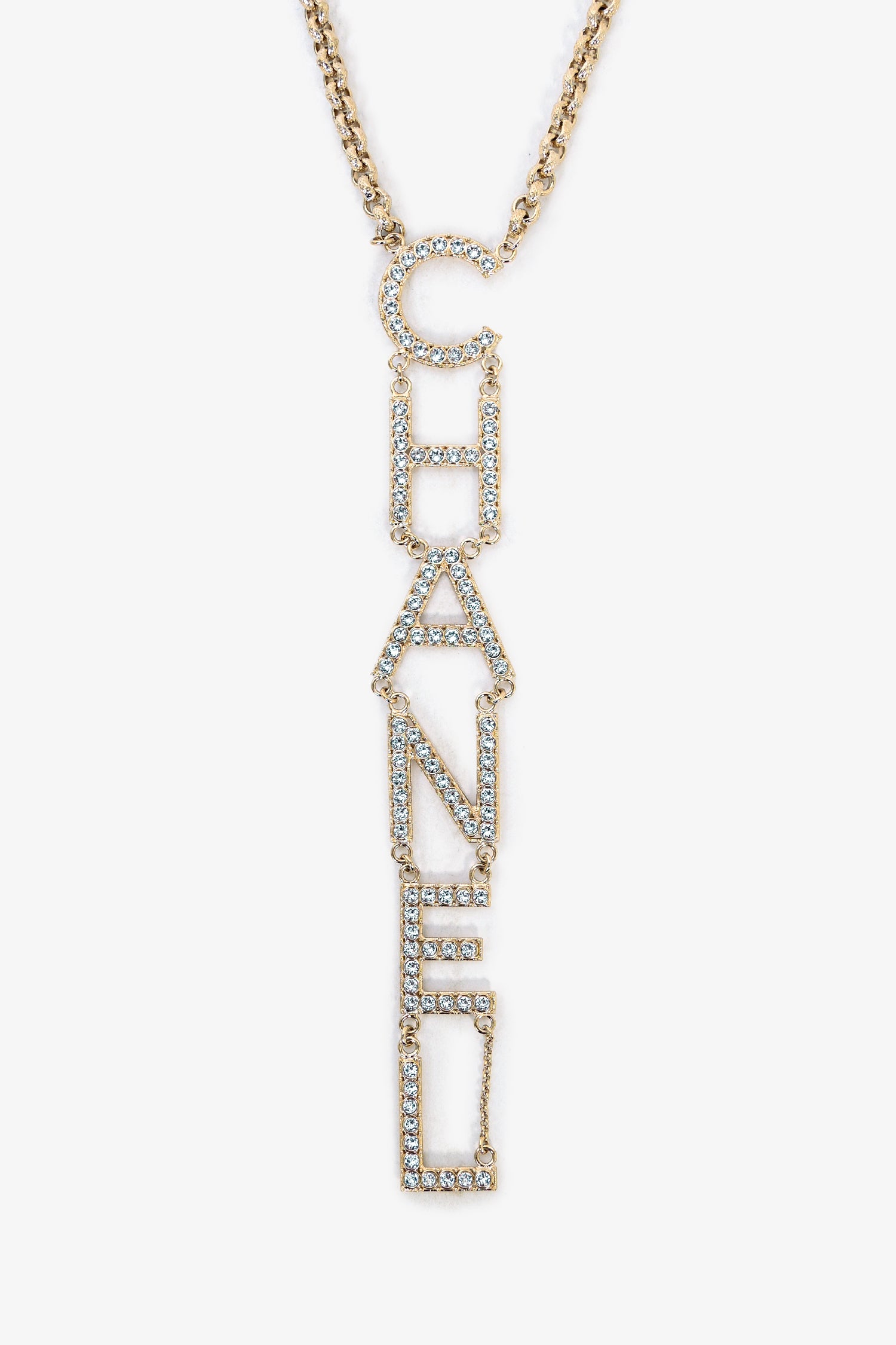 Refresh availabilityPre-Loved Chanel™ Runway SS2019 Gold Toned Crystal Embellished Large 'CHANEL' Vertical Drop Necklace. Lobster clasp closure.