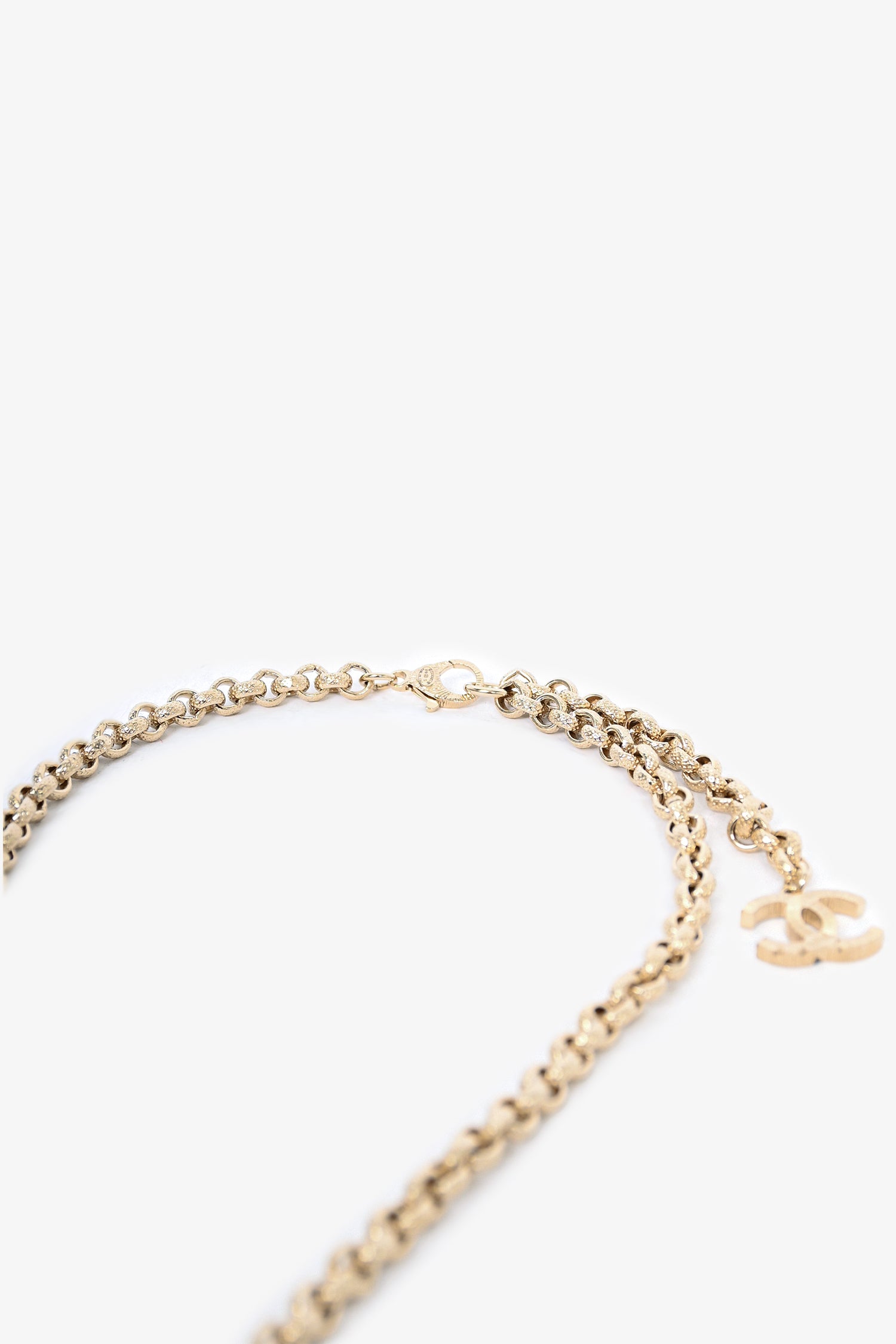 Pre-Loved Chanel™ Runway SS2019 Gold Toned Crystal Embellished Large 'CHANEL' Vertical Drop Necklace