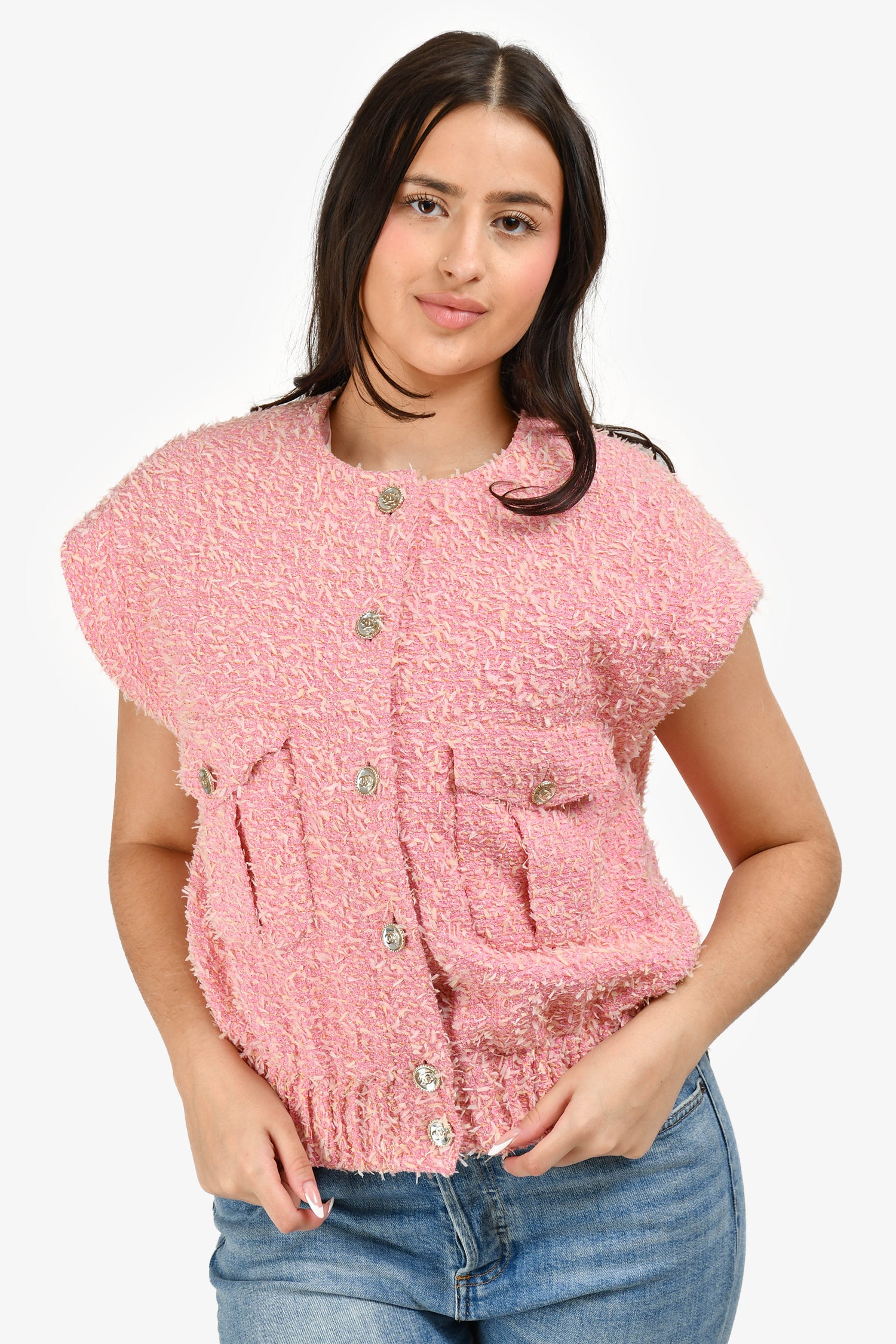 Refresh availabilityPre-Loved Chanel™ Short Sleeve Runway 2021 Pink Fantasy Tweed Vest. Front button down closure. Two front flap pockets with button closure. Silver-tone hardware. Elasticized hem. Fully lined. Tonal stitching.