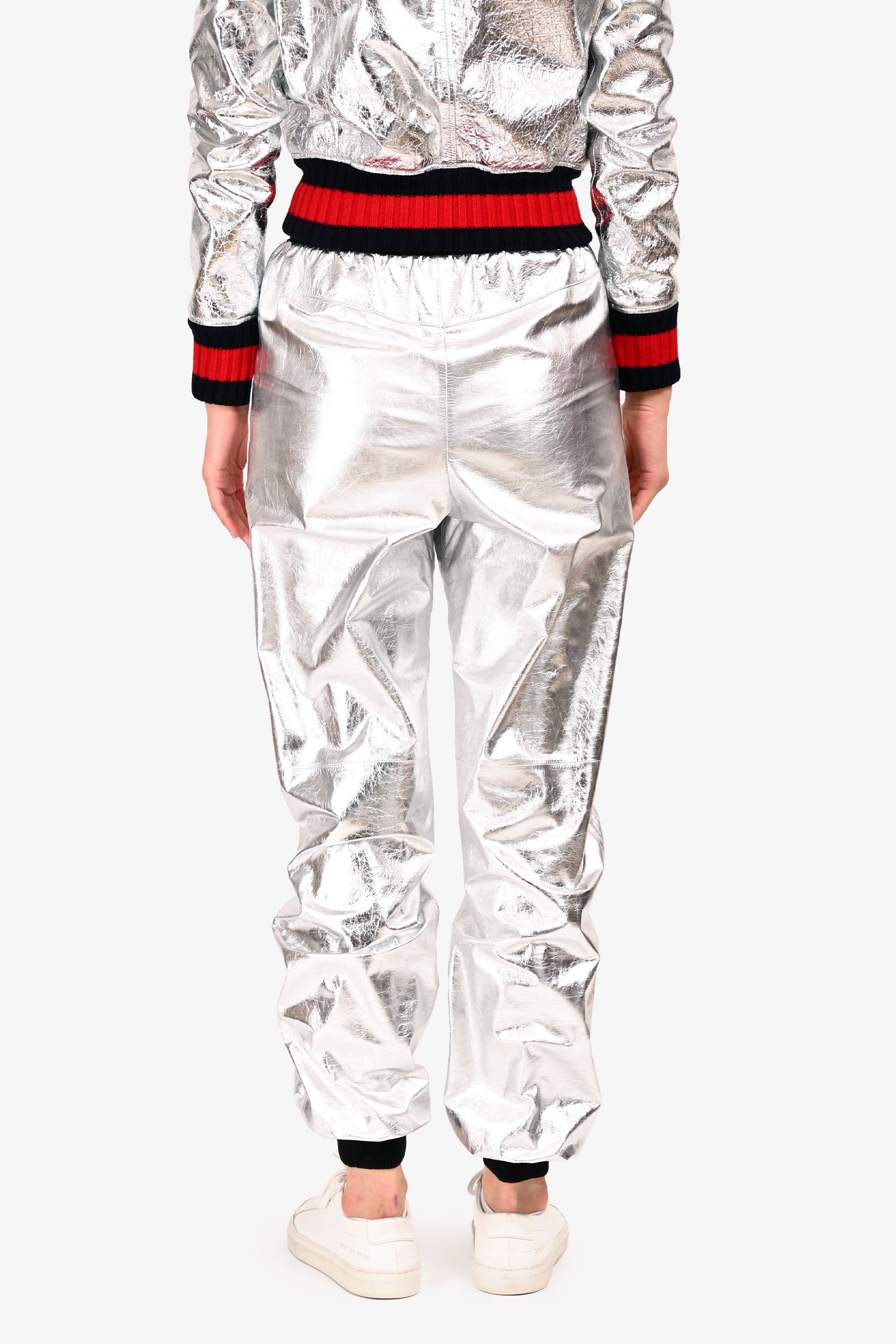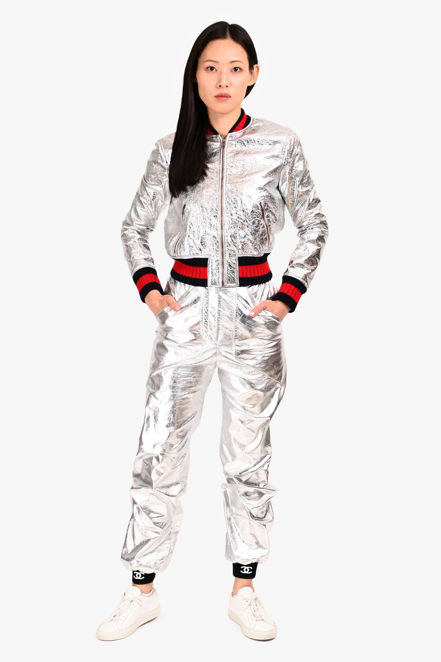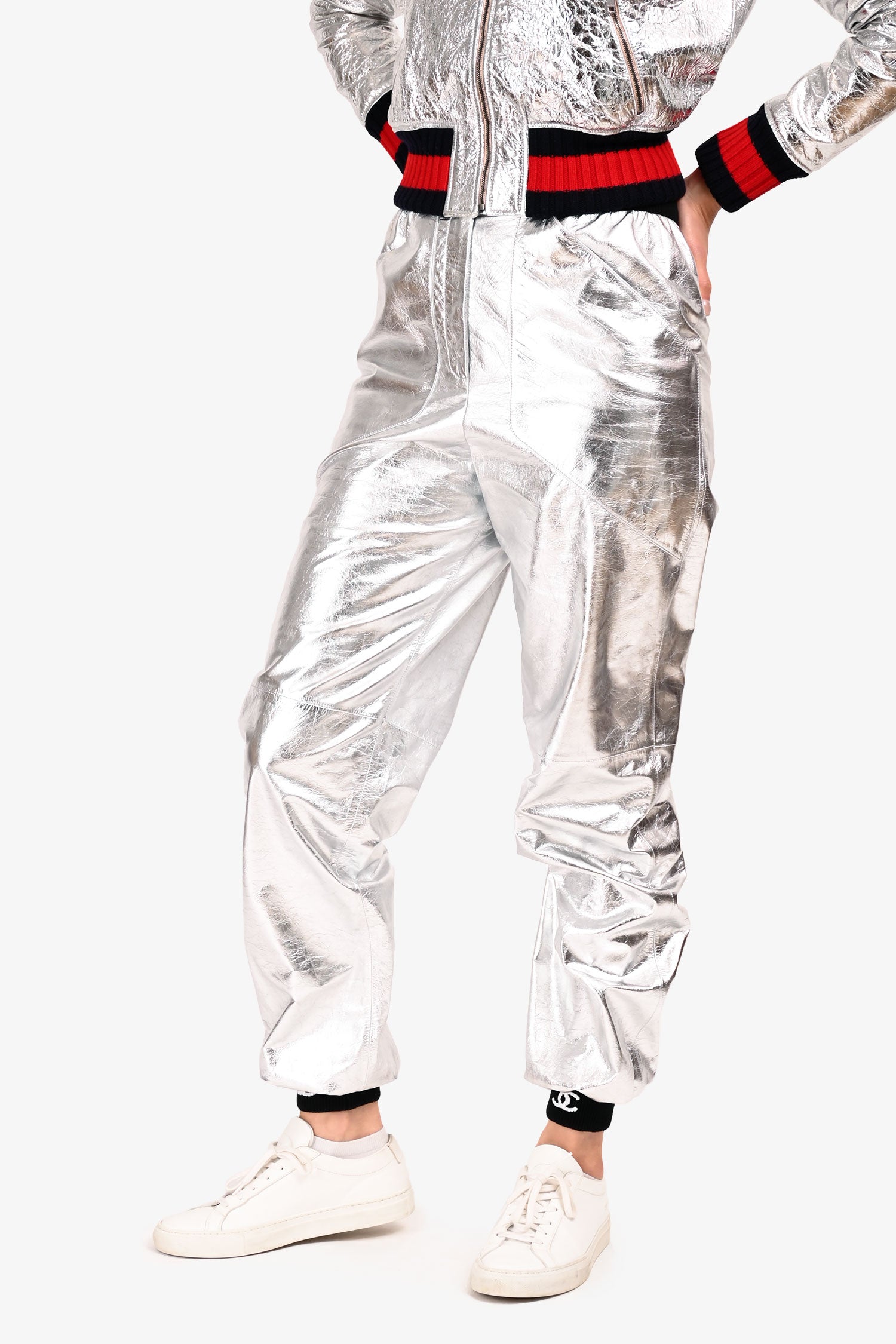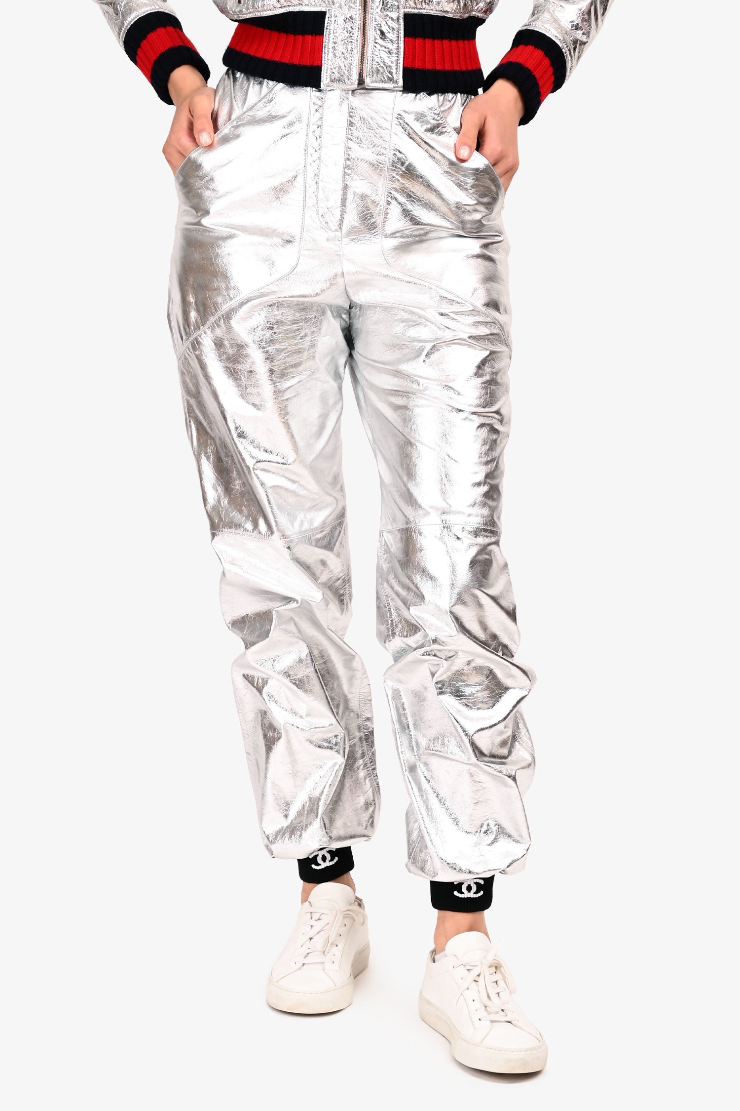 Pre-Loved Chanel™ Silver Calfskin CC Button Jogger Pants. Front zip and button closure. 2 front slip pockets. Elasticized waist, neckline, sleeve and ankle cuffs. Tonal stitching.